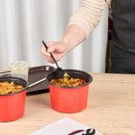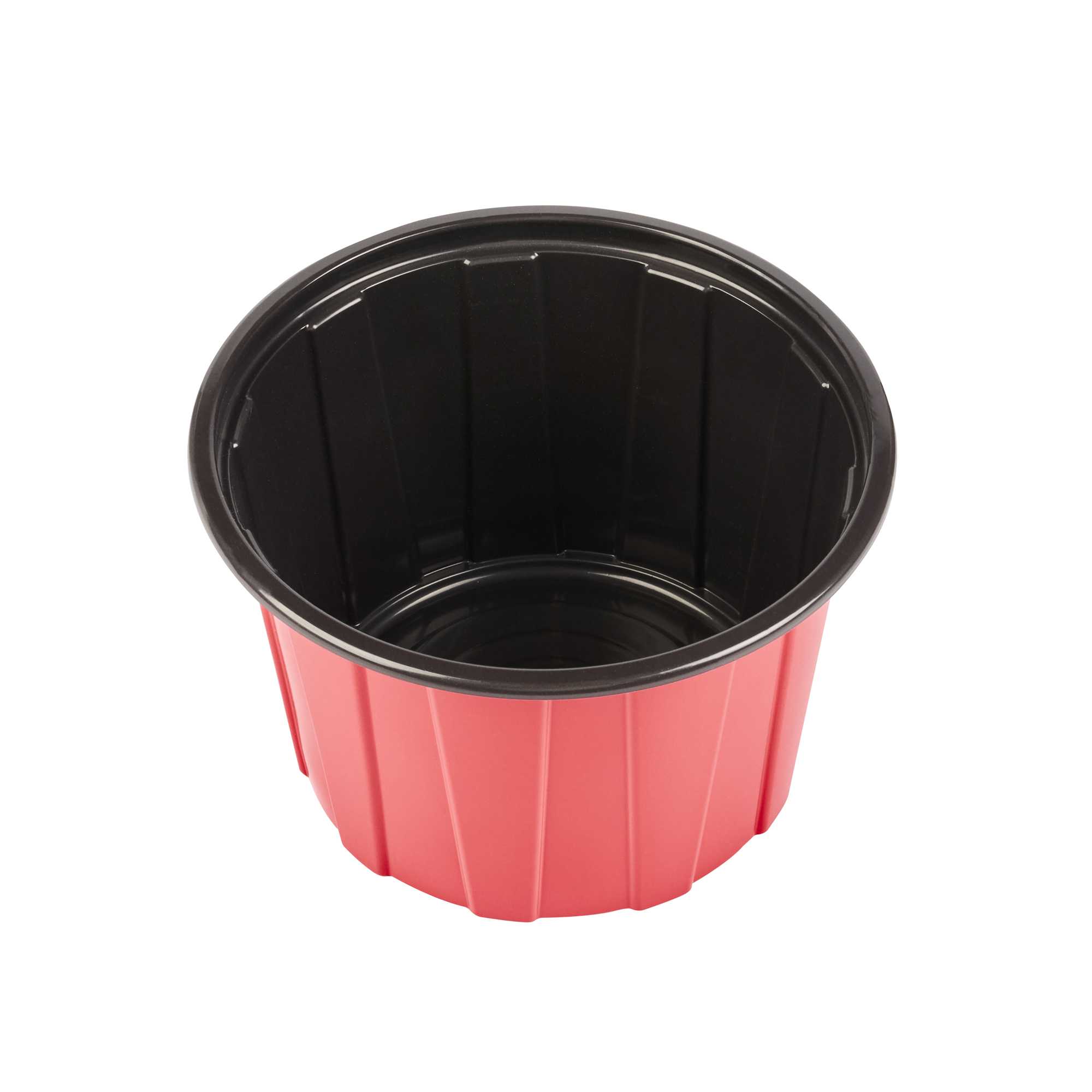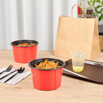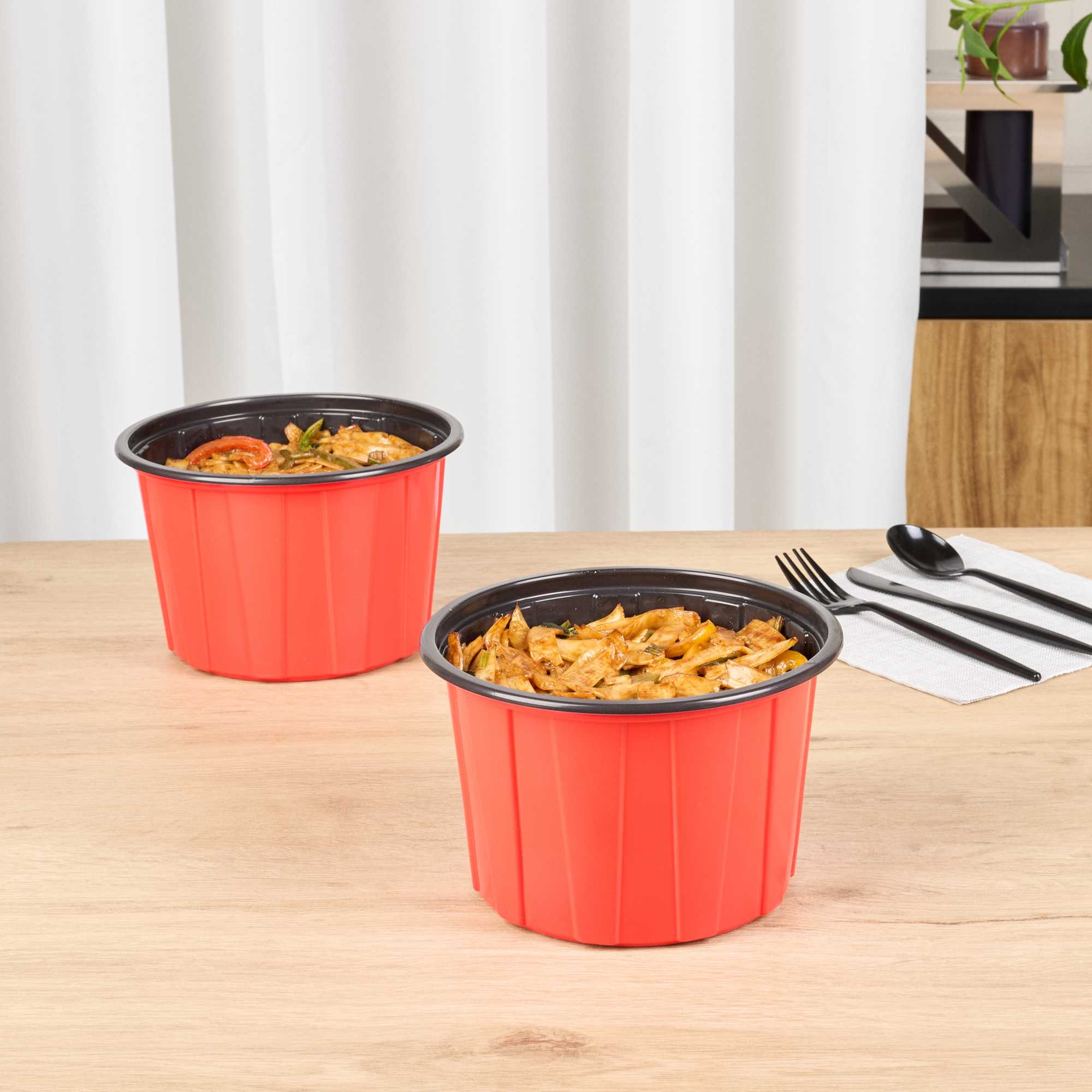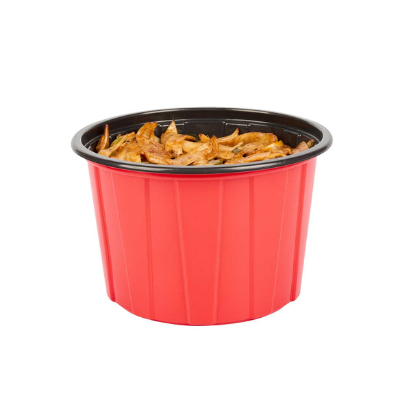 Handle oversized portions with ease using our Bento Tek 58-ounce Round Red Plastic To Go Boxes. Built from BPA-free plastic that resists cracks and breaks, these durable containers are made to keep up with the demands of fast-paced kitchens and delivery services. Meals can be conveniently reheated thanks to their microwave-safe design, making them ideal for take out, meal prep, or leftovers. The striking red base with a contrasting black interior gives your packaging a bold, high-impact look that reinforces a polished brand image. For a secure fit during transit, pair these containers with our clear plastic lids (SKU: RWP1920C), designed to help prevent leaks and spills. Their stackable shape helps optimize storage space in prep stations or delivery bags. Measuring 7.09 inches in diameter and 4.45 inches in height, each container holds up to 58 ounces. Sold in a 200 count box.
