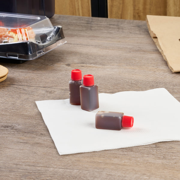 Transport sauces with ease using these freezer-safe containers. Bento Tek Translucent Disposable Sauce Bottles are lightweight and portable, making them ideal for quick and efficient sauce transport in fast-paced kitchens. Their disposable design ensures quick cleanup by eliminating the need for washing, perfect for catering businesses needing a reliable disposable sauce bottle solution. Made from food-grade plastic, these bottles are safe, hygienic, and practical for a variety of liquids, including soy sauce, thanks to their plastic soy sauce bottle design. Additionally, these bottles are freezer-safe, allowing chefs to store sauces and preserve their freshness for future use. Enhance your kitchen's efficiency with these mini sauce containers. Each order includes 1000 Bento Tek Translucent 6 ml Disposable Sauce Bottles.