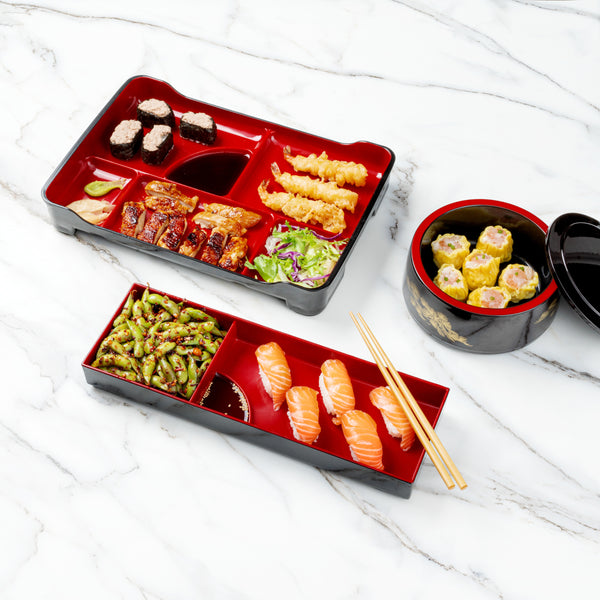 With a sleek black and red finish, these reusable bento boxes, plates, or trays stylishly present meals. Impress guests with elegant food containers!