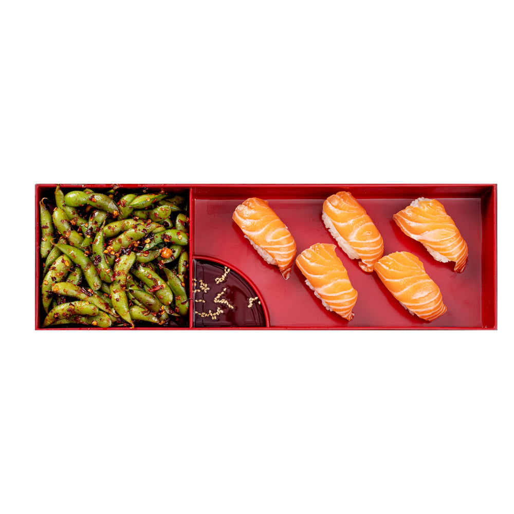 With a sleek black and red finish, these reusable bento boxes, plates, or trays stylishly present meals. Impress guests with elegant food containers!