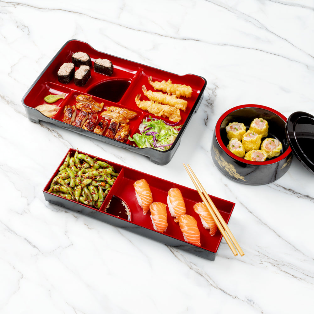 To fit and neatly organize all types of foods, these bento boxes, plates, and trays have compartments of different sizes. Display entrees, sauces, and side dishes in one go!