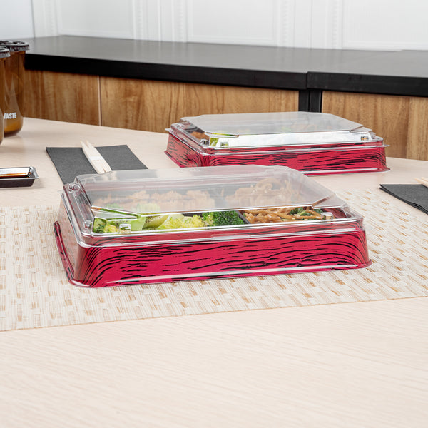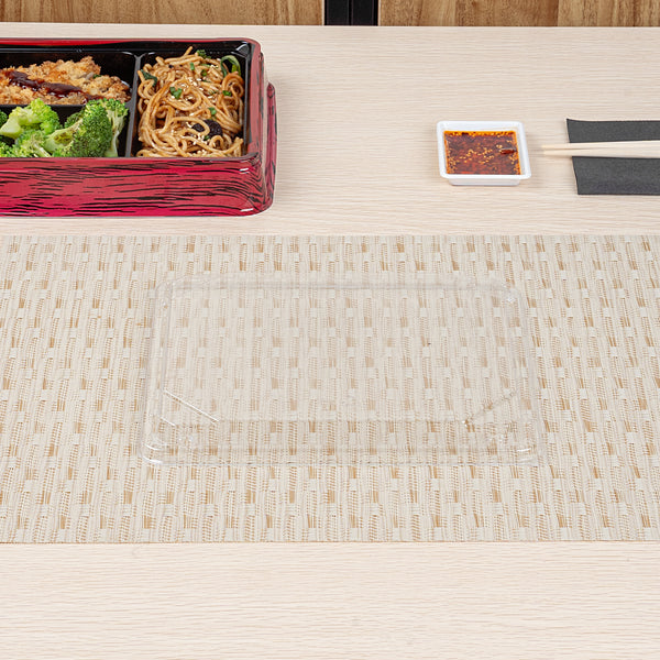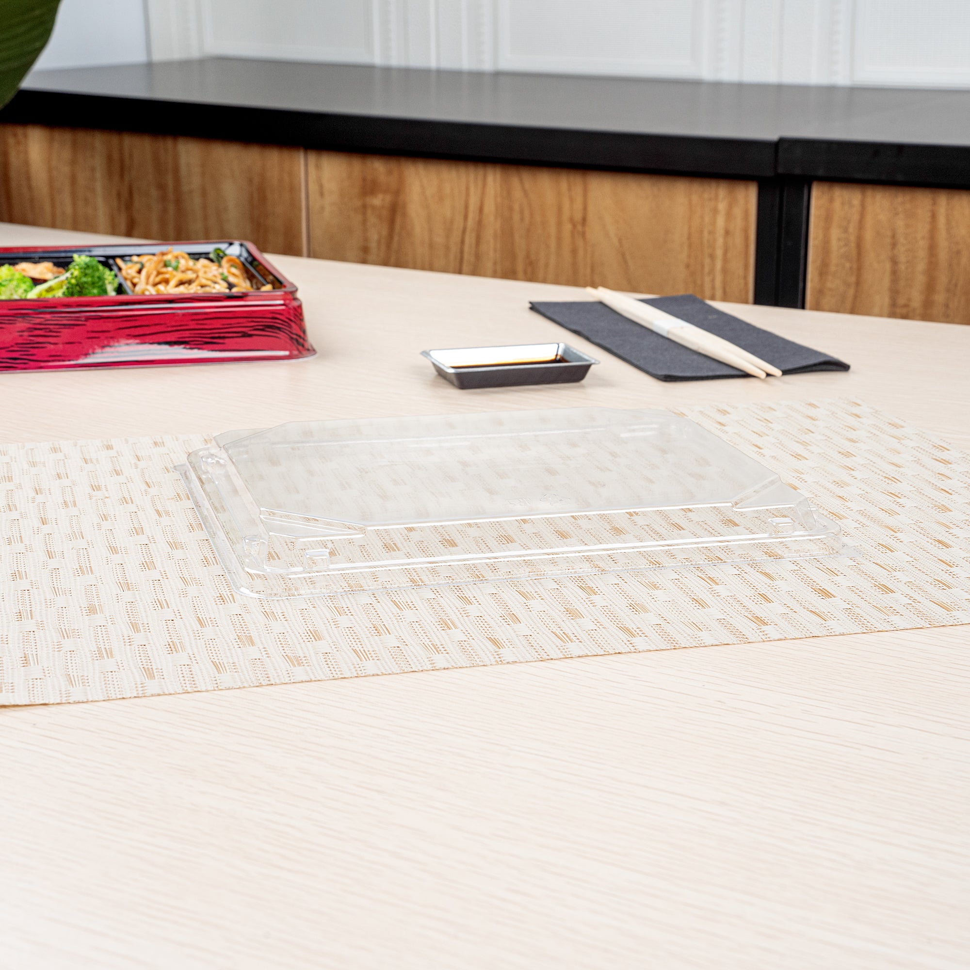 Protect your food in transit with our Bento Tek Rectangle Clear Plastic Lids. These plastic lids perfectly fit onto compatible bento boxes (SKU: RWP1531B-50), making your meals instantly portable. Crafted from premium plastic, these container lids are sturdy and durable, providing a reliable seal to keep your food fresh and secure during transport. The clear finish of these food container lids is great for showing off your catering presentations. For an effortless cleanup after serving, these clear lids are disposable. Ideal for eco-conscious foodservice establishments, these rectangle lids are recyclable. Measuring 8.5 inches in length by 7.25 inches in width by 0.75 inches in height, these lids for food containers fit a variety of food containers. Sold in a 50 count box. Bento boxes are available and sold separately.