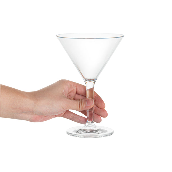 Prevent glass breakage in busy environments with shatterproof martini glasses. The Bev Tek Shatterproof Clear Polycarbonate Martini Glass offers the elegance of traditional glassware with the superior durability of polycarbonate, ensuring safety and longevity in any setting. With a 10-ounce capacity, this glass provides consistent drink portions, perfect for upscale bars or outdoor venues. The sturdy base of this polycarbonate martini glass enhances stability, minimizing spills and ensuring reliable performance on trays. Its smooth rim allows patrons to comfortably sip cold drinks, enhancing their cocktail experience. Dishwasher-safe, this clear plastic martini glass simplifies cleaning processes, boosting efficiency during peak hours. Perfect for catering events or poolside bars, this martini glass combines practicality with style. Sold in a 24 count box.