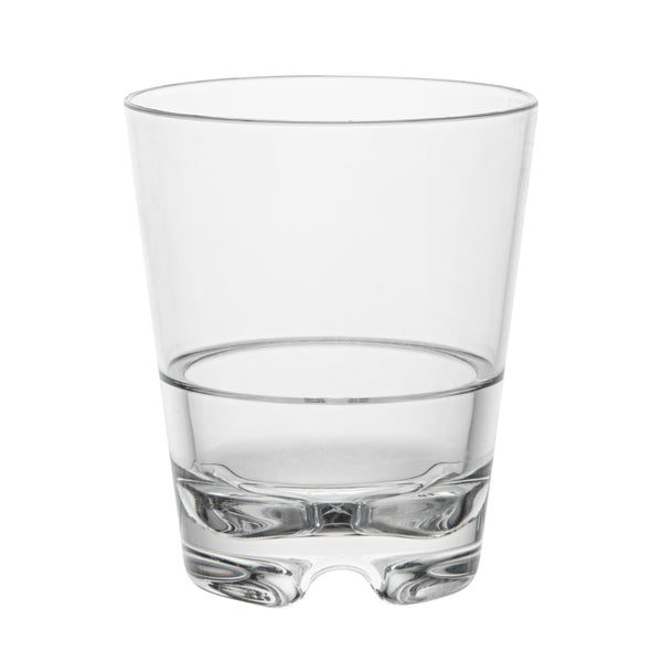 The stackable design of these reusable plastic whiskey glasses maximizes storage efficiency, making them ideal for kitchen or bar spaces in bustling bistros, busy restaurants, and high-volume catering events. These glasses ensure easy organization and save valuable space, enhancing the overall functionality of your establishment.