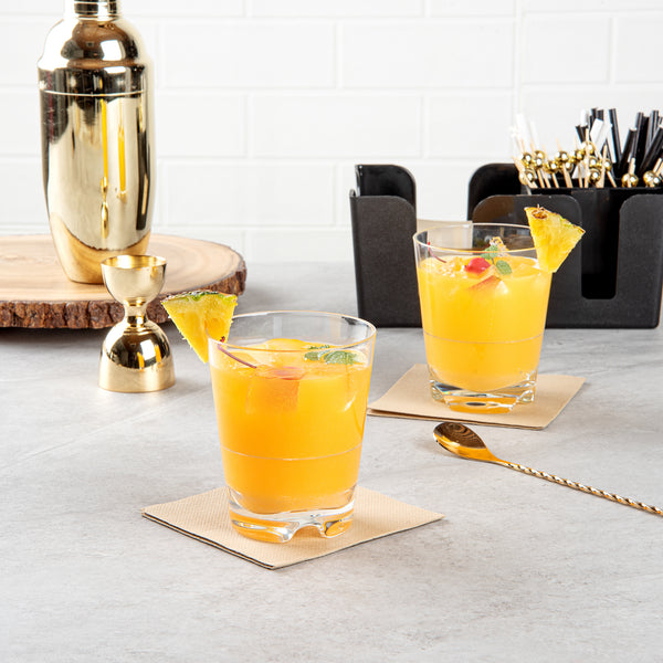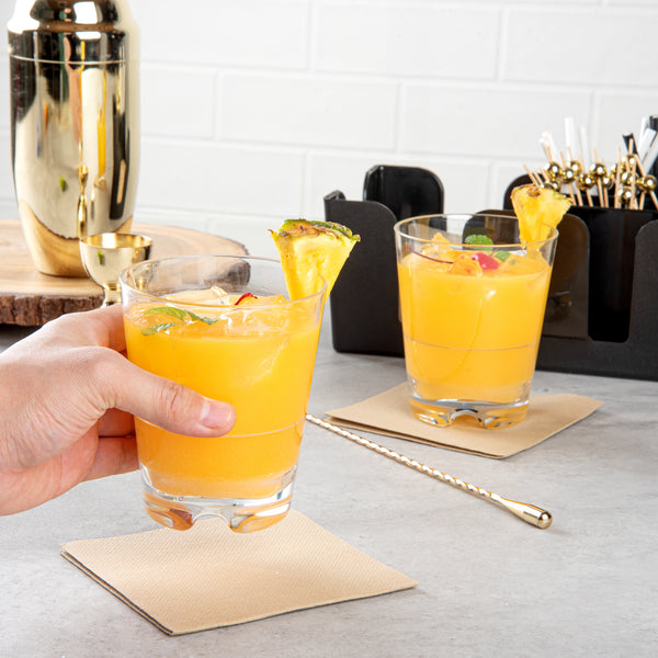 Designed to mimic the classic look of old-fashioned glasses, these plastic cocktail glasses elevate the presentation of your signature drinks served on the rocks. This timeless appeal adds a touch of elegance to any setting, enhancing the drinking experience.