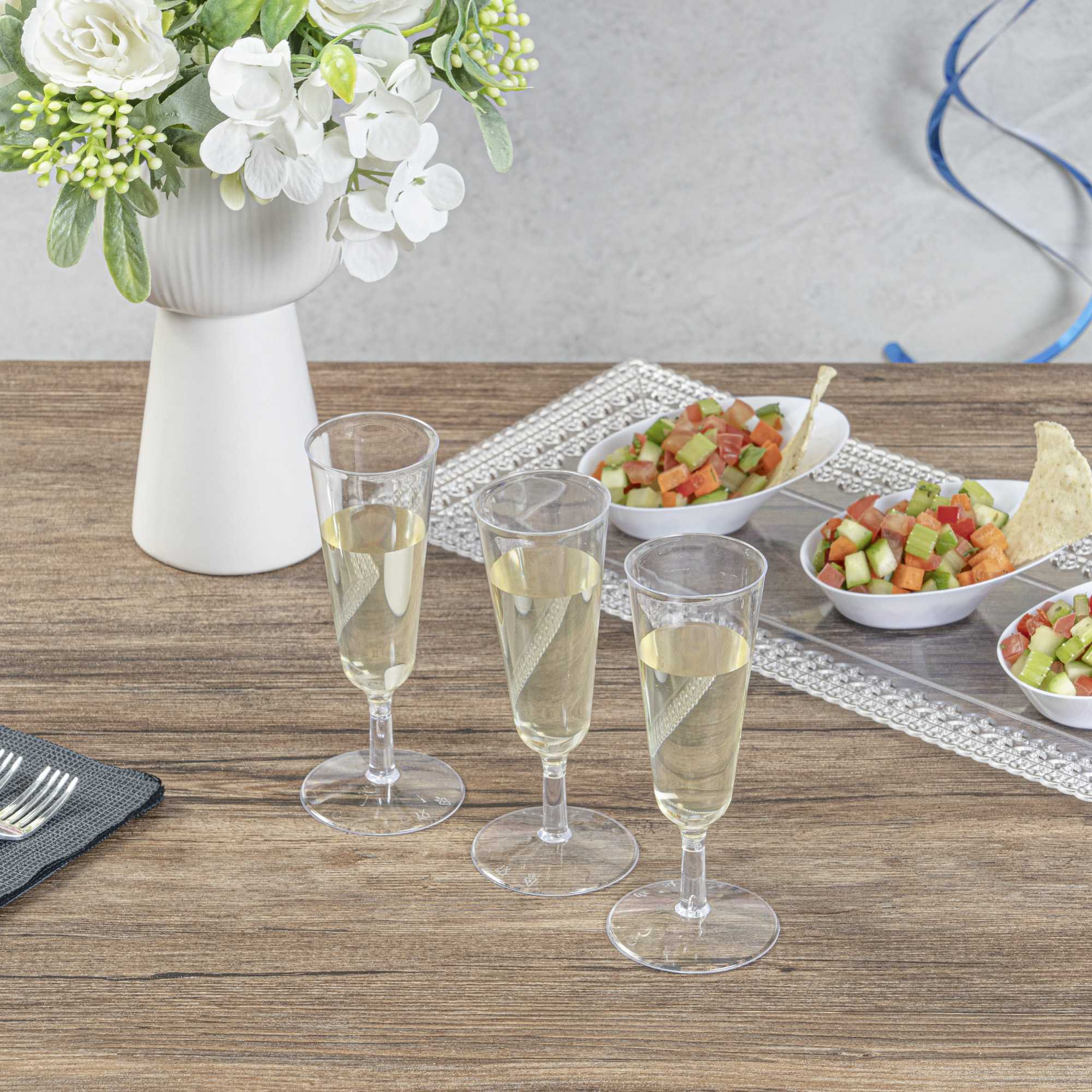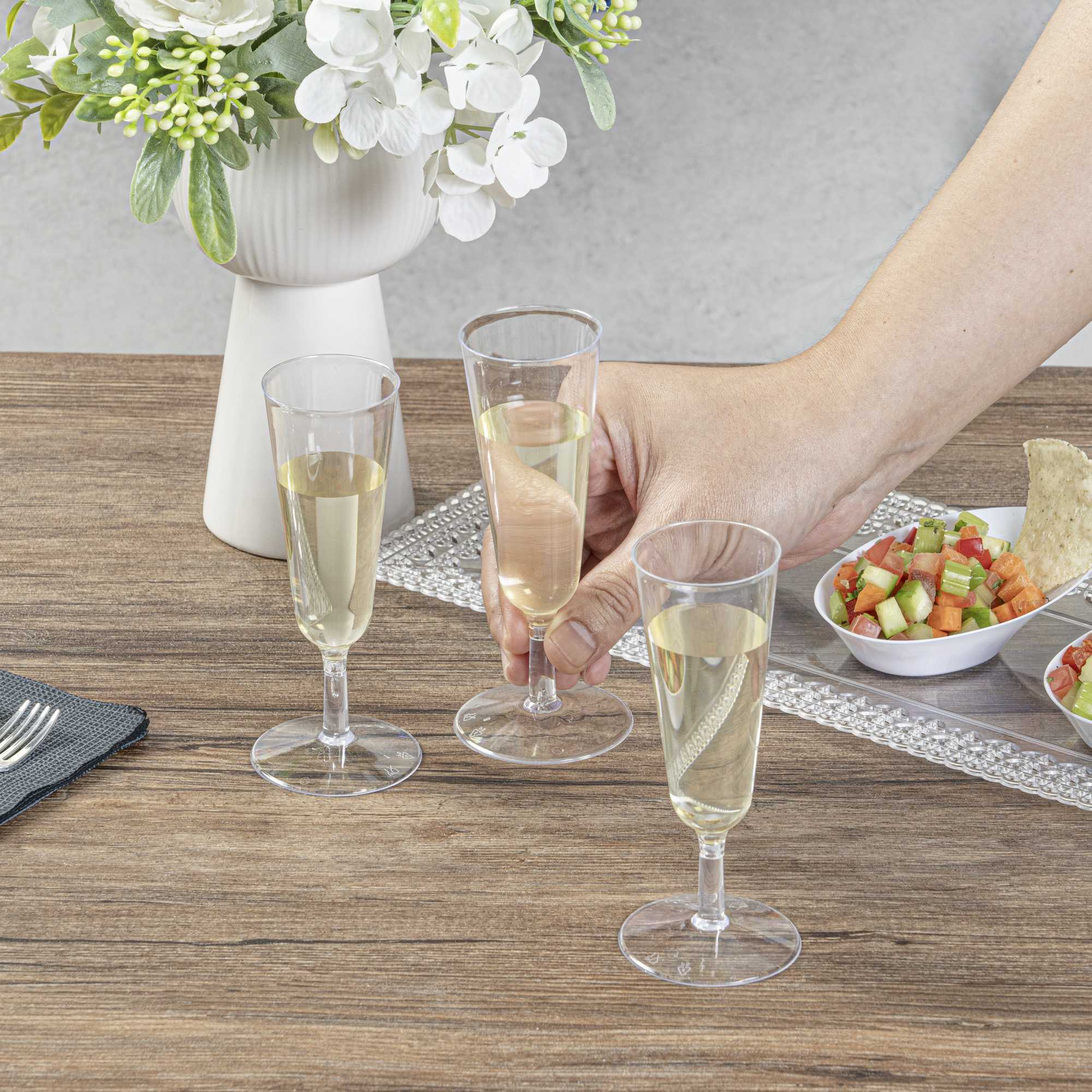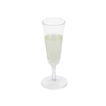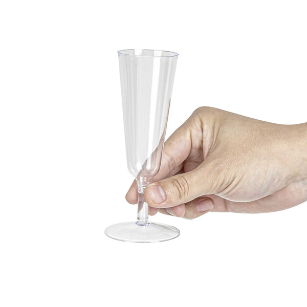 Add a sparkling touch to any special event withour Bev Tek 2-ounce Round Clear Plastic Mini Champagne Glasses. Perfect for small servings of champagne or cocktails, these mini champagne flutes are ideal for making toasts at wedding receptions, parties, galas and other catered events. Their miniature size makes for a fast and convenient way to serve champagne, while their classic design adds an elegant touch to drink presentations. Made from recyclable plastic, these plastic flute plastic have a clear finish to showcase your colorful cocktails and bubbly drinks. These 2-piece champagne flutes are shipped unassembled for space-saving storage at your foodservice establishment. When you’re ready to use these small plastic champagne glasses, simply press the stem into the base to complete their assembly. With a rounded base and sturdy stem, these small champagne flutes provide superior stability when placed on trays or tables to avoid spills. Containing up to 2 ounces, these plastic flute glasses measure 2 inches in diameter and 5 inches in height. Shipped in a 100 count box.