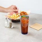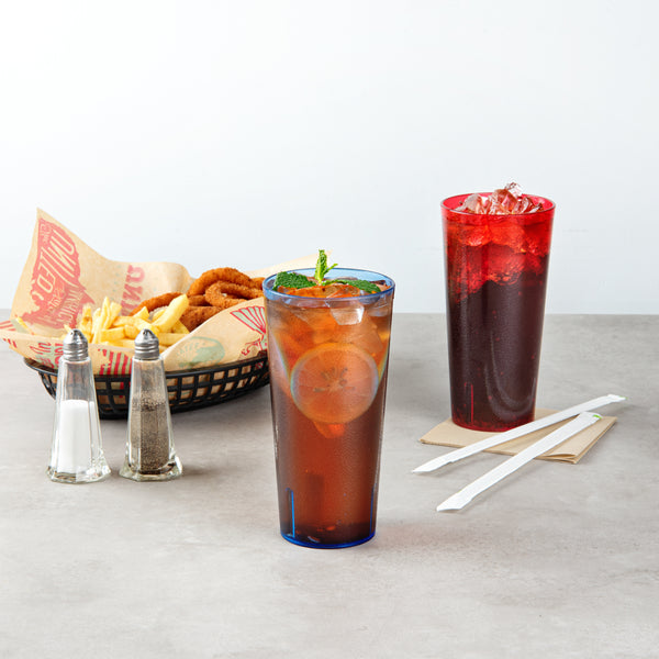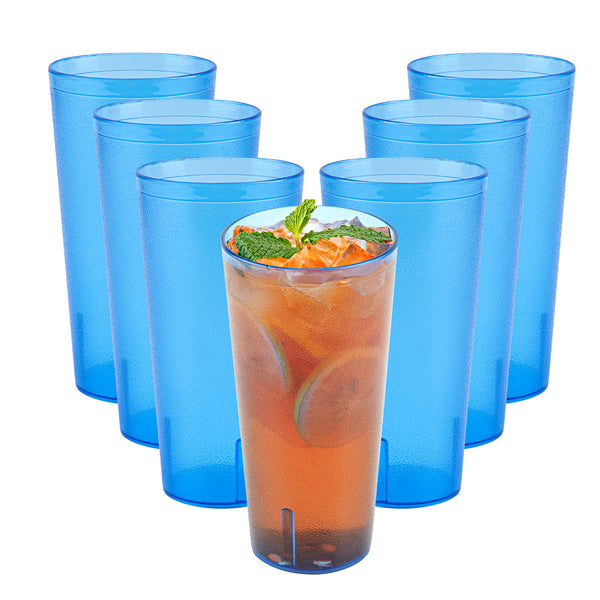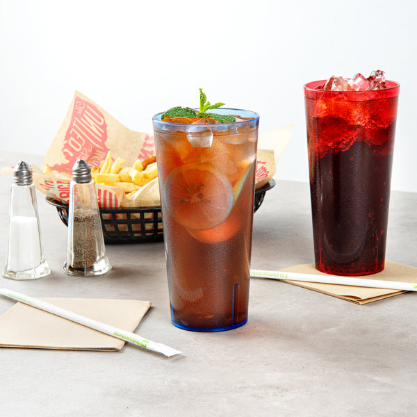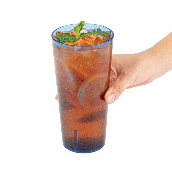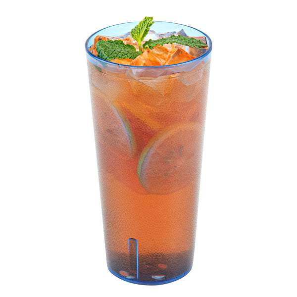 Enhance your beverage service with style and durability. The Bev Tek Blue Plastic Tumbler features a distinctive pebbled finish that provides a textured look, elevating your drink presentation. Constructed from durable SAN plastic, this plastic tumbler is designed to withstand the demands of daily use, minimizing breakage and ensuring long-lasting service in any foodservice environment. Its dishwasher-safe design facilitates easy and efficient cleaning, saving valuable time and labor costs. With a generous 24-ounce capacity, this drinking glass is ideal for serving cocktails, sodas, or iced beverages, catering to a wide range of customer preferences. Measuring 3.5 inches in width and 7 inches in height, this 24 oz tumbler fits comfortably in hand while complementing any table setting. Choose this dependable and attractive option for your drinkware needs and see the difference in customer satisfaction. Each order includes 10 Bev Tek Blue Plastic Tumblers.