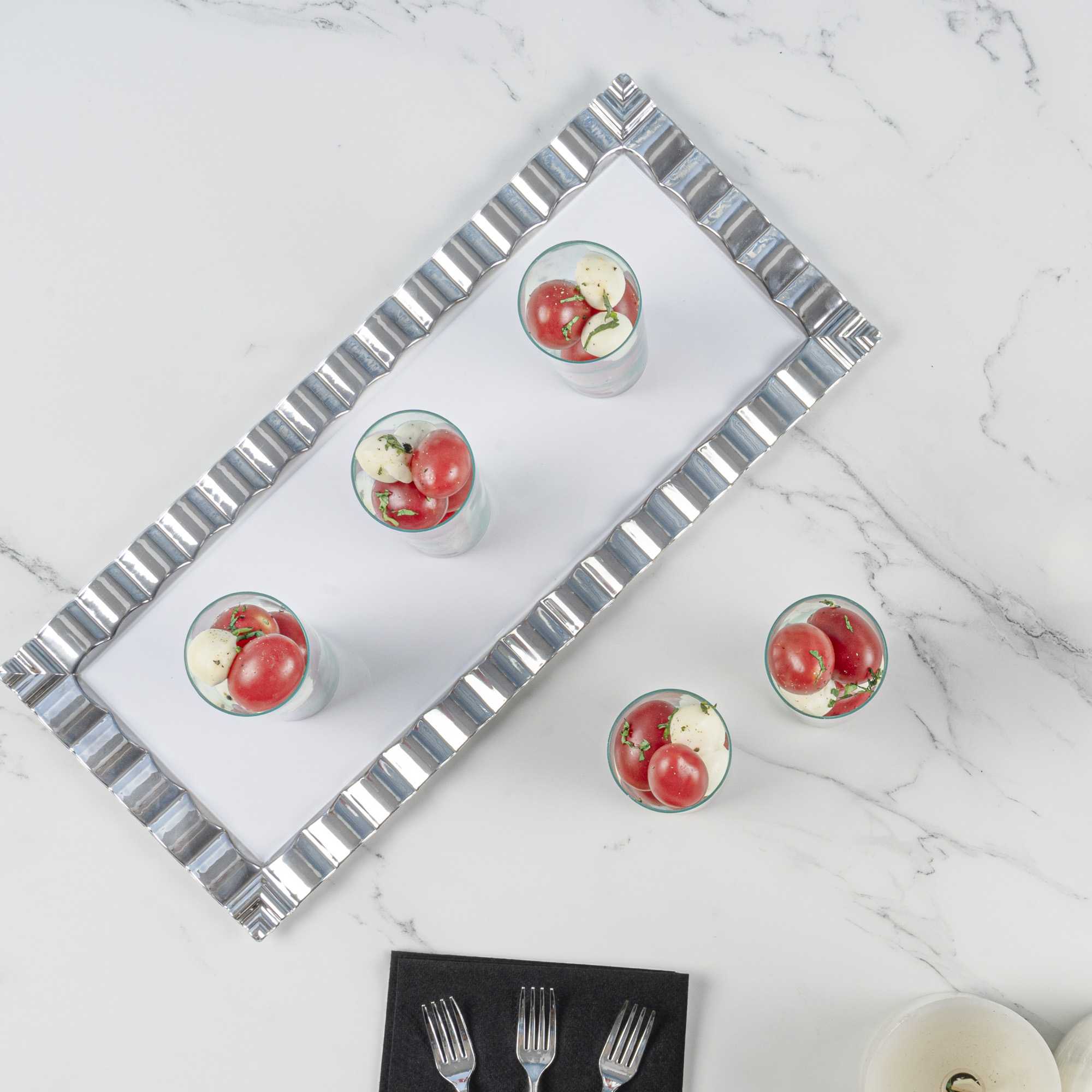 - Seagreen finish beautifully displays appetizers and desserts