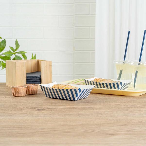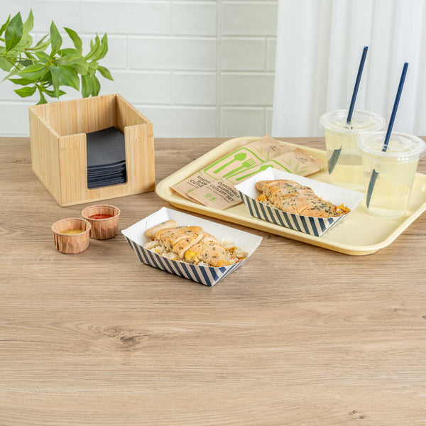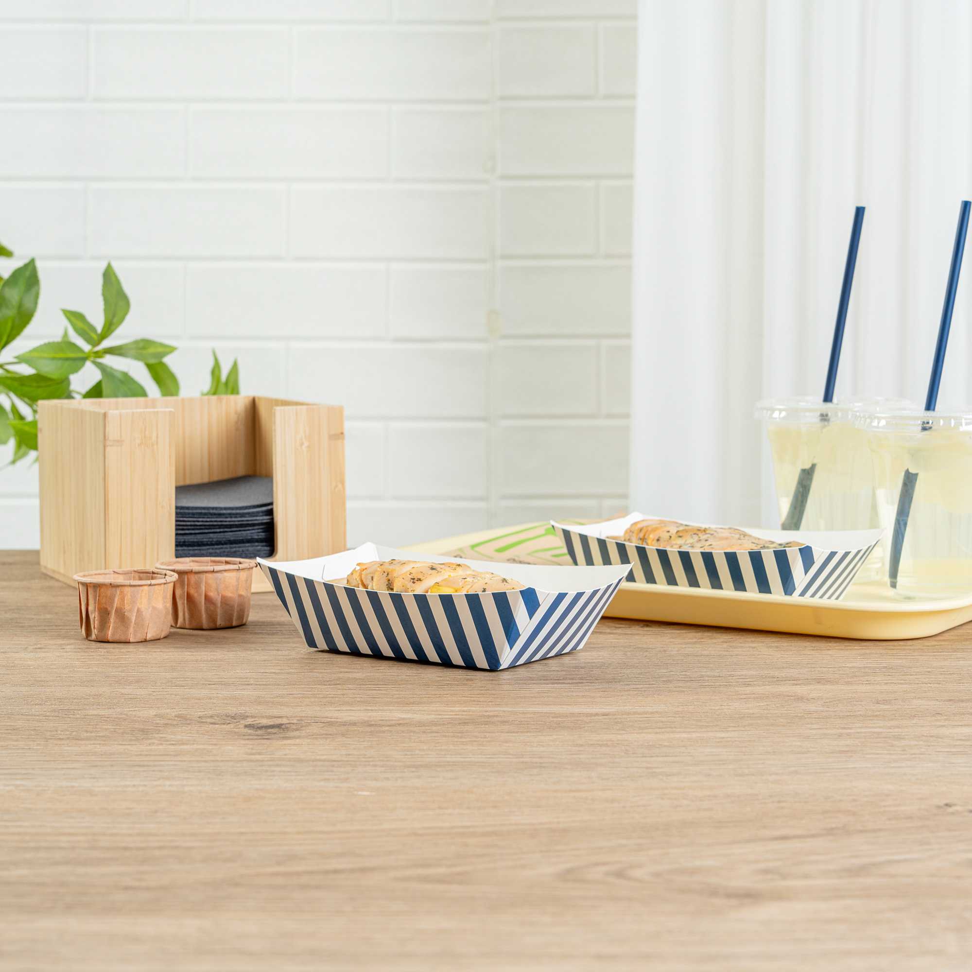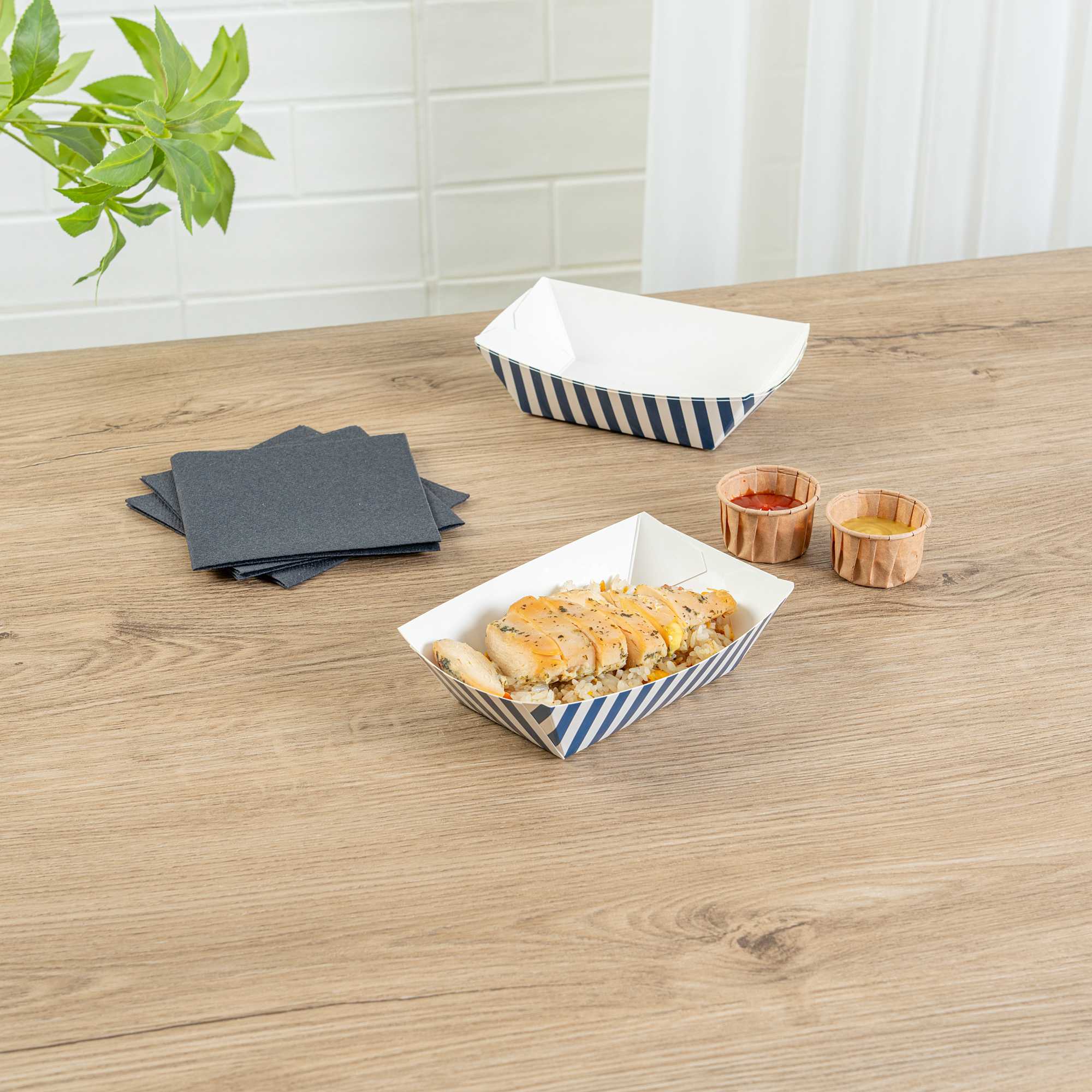 Indulge in elegance with our Bio Tek 0.5-pound Blue and White Stripe Paper #50 Food Tray / Boats. Expertly crafted from sustainable paper, these 0.5-pound striped paper trays lend a touch of sophistication to your culinary offerings. Engineered to accommodate generous portions, these durable trays are perfect for hearty appetites. Enhanced with a greaseproof lining, they are well-suited for dishes laden with oil or moisture. From mouthwatering burgers and lobster rolls to crispy Caesar salads and chicken wings, these #50 paper food trays redefine convenience for takeaway orders. Each tray measures 6.5 inches long by 4.12 inches wide at the top and 4.25 inches long by 2.75 inches wide by 1.75 inches tall at the top. Sold in a 400 count box.