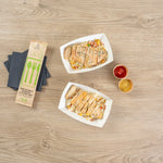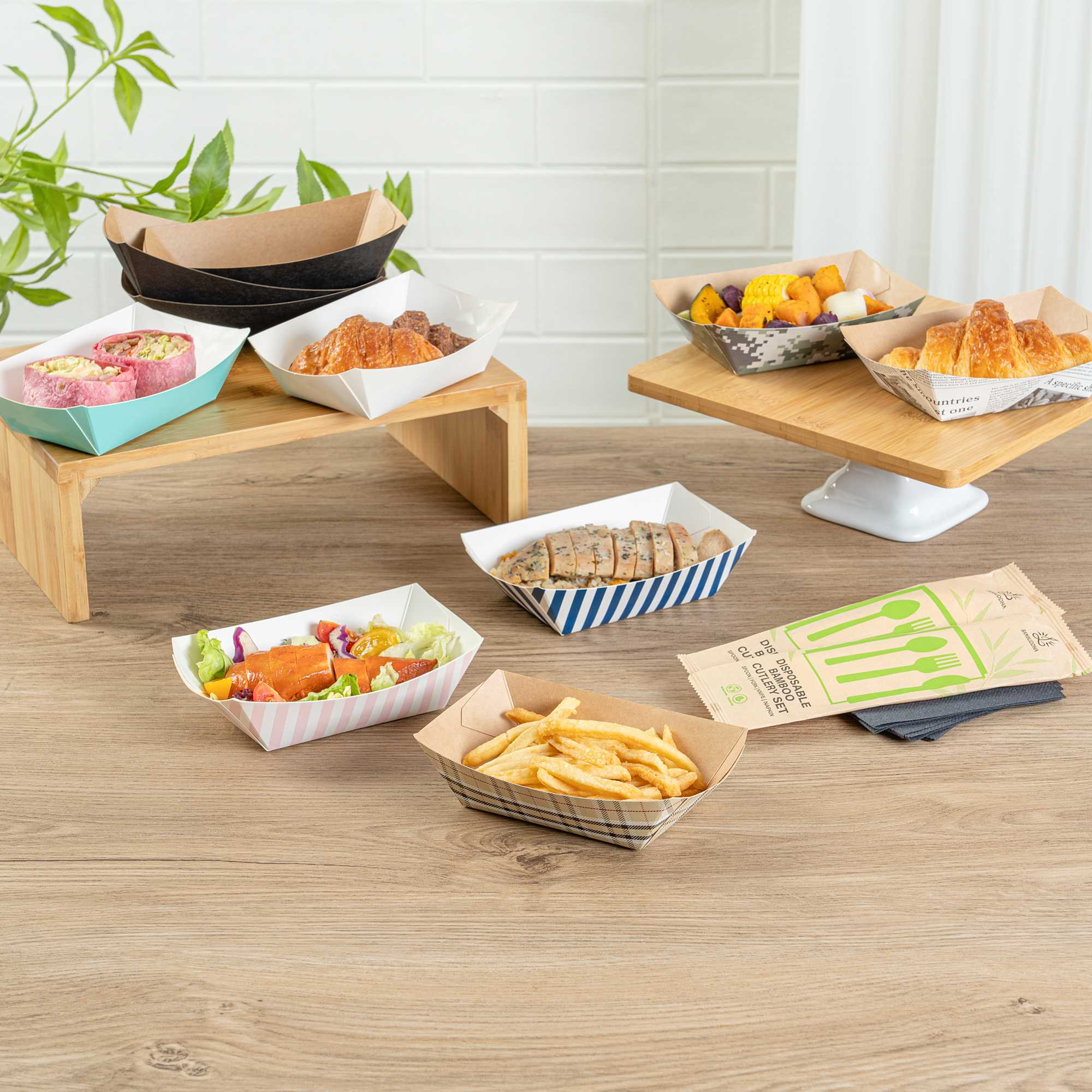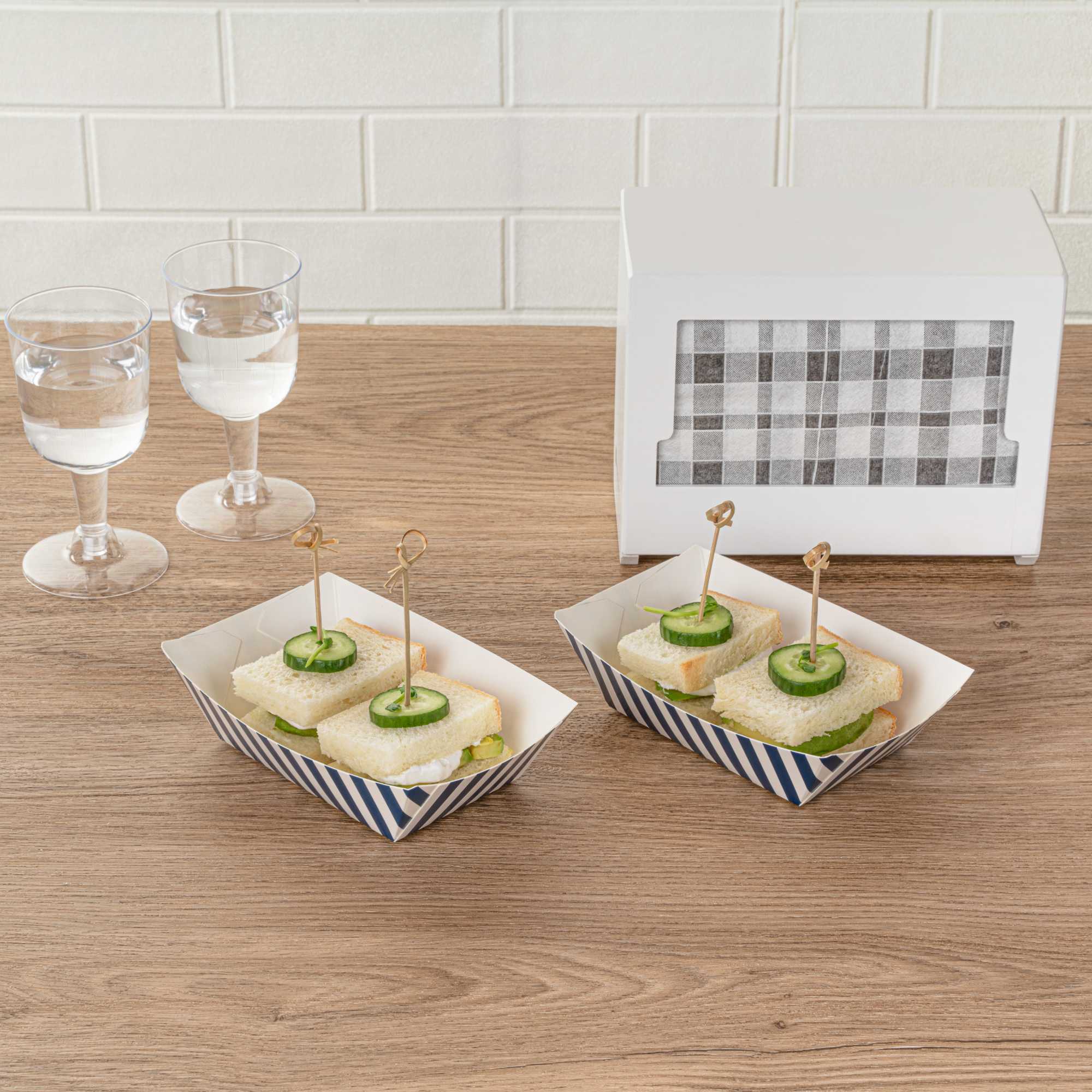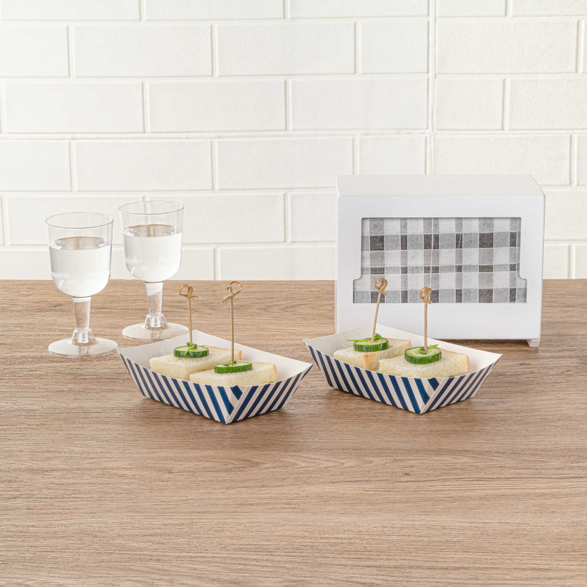 Indulge in elegance with our Bio Tek 0.5-pound Blue and White Stripe Paper #50 Food Tray / Boats. Expertly crafted from sustainable paper, these 0.5-pound striped paper trays lend a touch of sophistication to your culinary offerings. Engineered to accommodate generous portions, these durable trays are perfect for hearty appetites. Enhanced with a greaseproof lining, they are well-suited for dishes laden with oil or moisture. From mouthwatering burgers and lobster rolls to crispy Caesar salads and chicken wings, these #50 paper food trays redefine convenience for takeaway orders. Each tray measures 6.5 inches long by 4.12 inches wide at the top and 4.25 inches long by 2.75 inches wide by 1.75 inches tall at the top. Sold in a 400 count box.