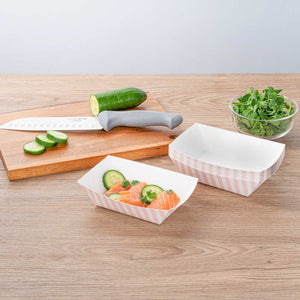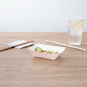 Introducing our Bio Tek 0.5-pound Pink and White Stripe Paper #50 Food Tray / Boats, the sustainable solution for serving your savory creations in style. Skillfully crafted from sustainable paper, these 0.5-pound striped food trays elevate the presentation of your culinary delights. Engineered to accommodate generous portions, these robust trays are perfect for satisfying appetites. Featuring a greaseproof lining, they're specially designed for dishes rich in oil or moisture. Whether you're serving up tantalizing burgers, succulent lobster rolls, or crisp Caesar salads and chicken wings, these #50 paper food trays redefine convenience for takeaway orders. Each tray measures 4.25 inches long by 2.75 inches wide at the base and 7 inches long by 4 inches wide at the top. Sold in a 400 count box.