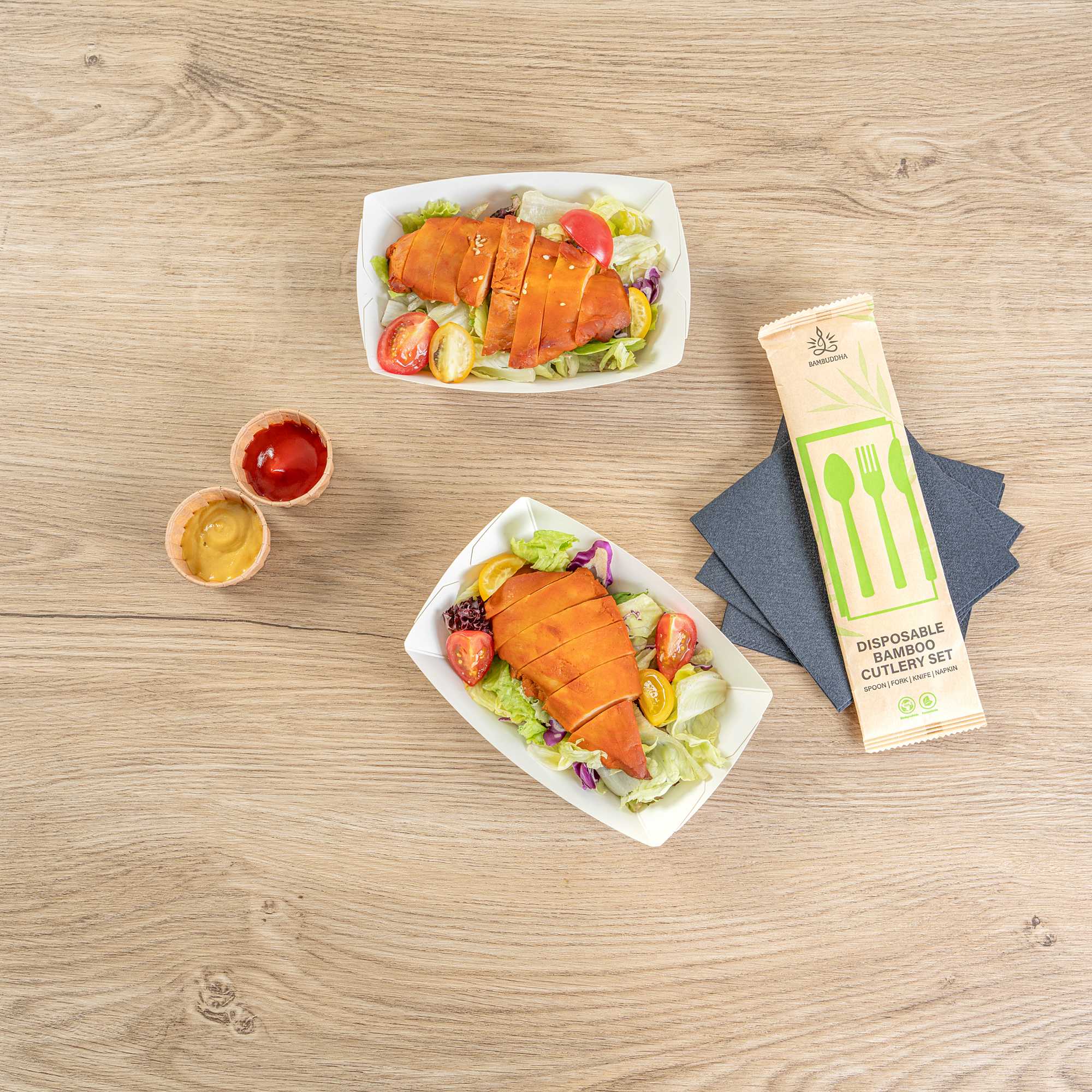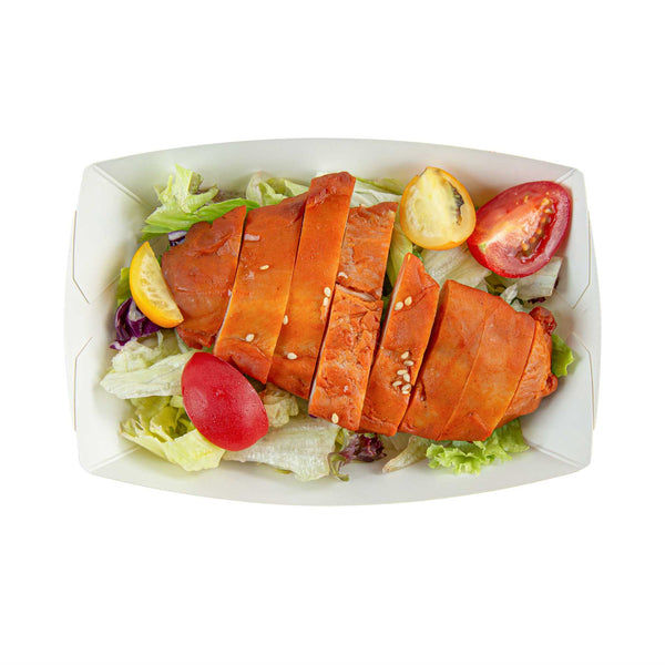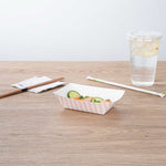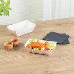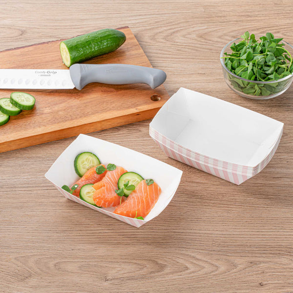Introducing our Bio Tek 0.5-pound Pink and White Stripe Paper #50 Food Tray / Boats, the sustainable solution for serving your savory creations in style. Skillfully crafted from sustainable paper, these 0.5-pound striped food trays elevate the presentation of your culinary delights. Engineered to accommodate generous portions, these robust trays are perfect for satisfying appetites. Featuring a greaseproof lining, they're specially designed for dishes rich in oil or moisture. Whether you're serving up tantalizing burgers, succulent lobster rolls, or crisp Caesar salads and chicken wings, these #50 paper food trays redefine convenience for takeaway orders. Each tray measures 4.25 inches long by 2.75 inches wide at the base and 7 inches long by 4 inches wide at the top. Sold in a 400 count box.