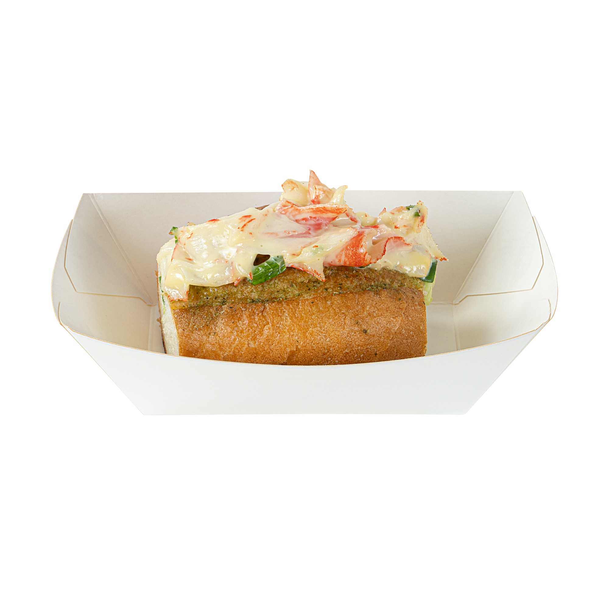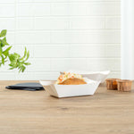 Elevate your dining presentation with our Bio Tek 0.5-pound White Paper #50 Food Tray / Boats. Meticulously crafted from sustainable paper, these 0.5-pound white trays add a touch of sophistication to your culinary showcases. Designed to accommodate hearty portions, these sturdy trays are a perfect choice for satisfying appetites. Equipped with a greaseproof lining, they're ideally suited for dishes infused with oil or moisture. Whether you're presenting succulent burgers, tantalizing lobster rolls, or crisp Caesar salads and chicken wings, these #50 paper food trays redefine convenience for takeaway orders. Each tray measures 4.25 inches long by 2.75 inches wide at the base and 7 inches long by 4 inches wide at the top. Sold in a 50 count box.