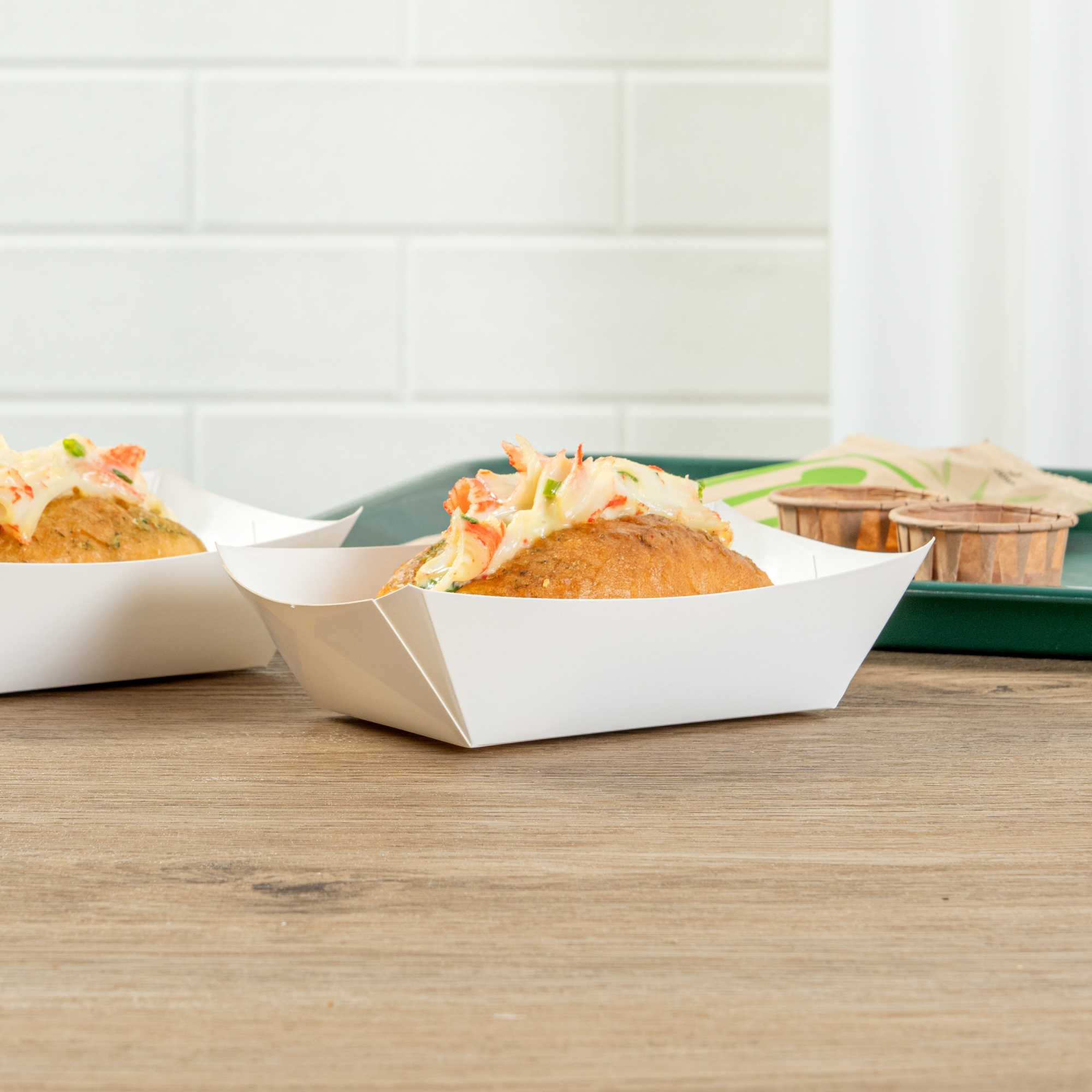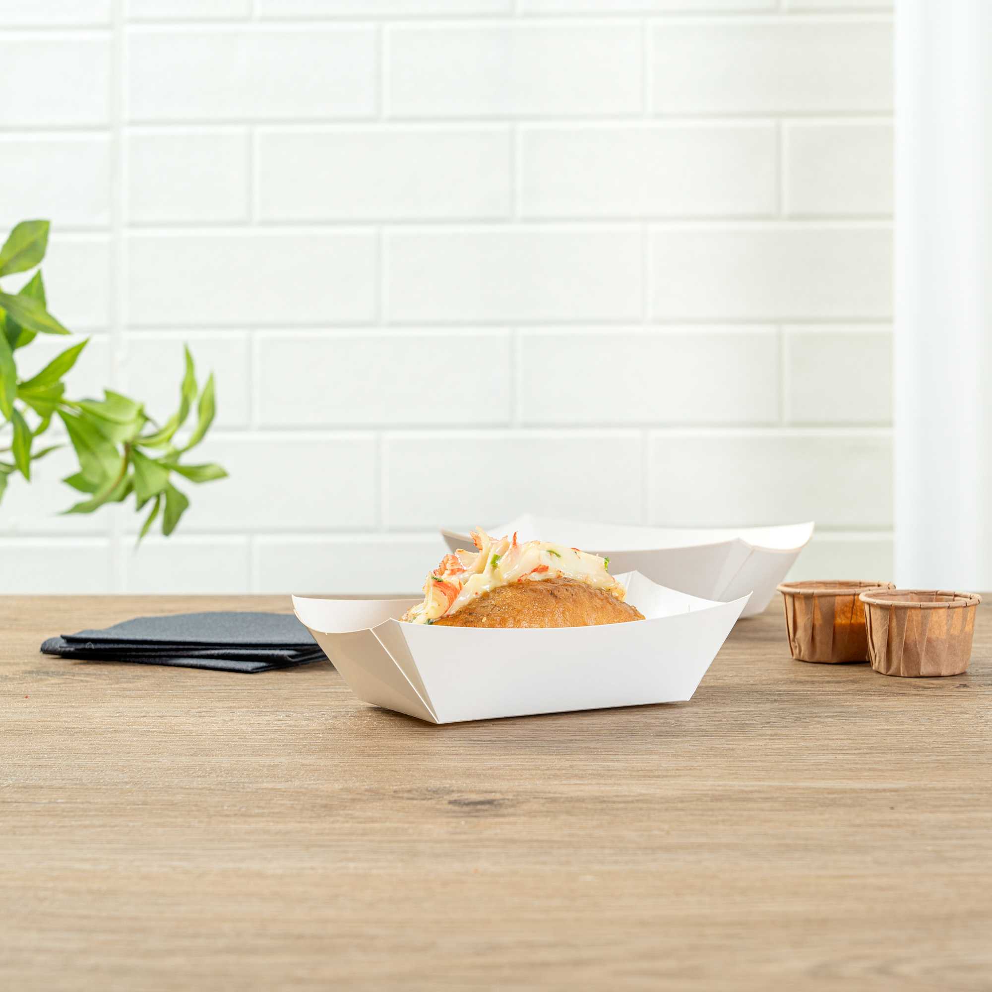 These paper food boat trays have an ultra-portable design to easily serve meals. Ideal for food trucks, family parties, and catering companies!