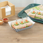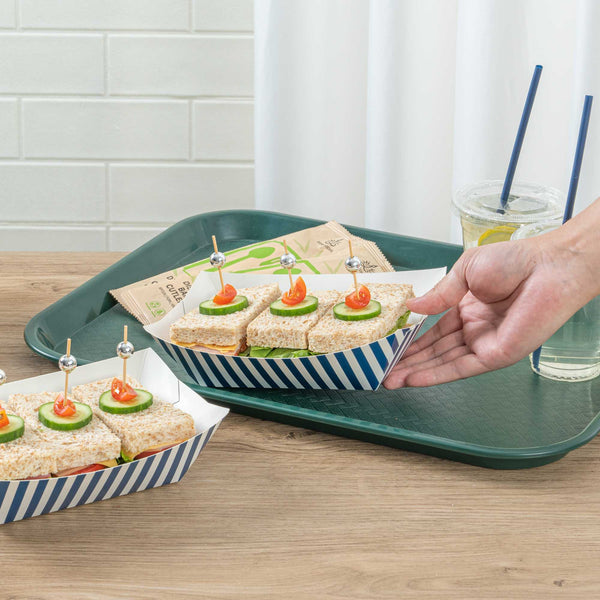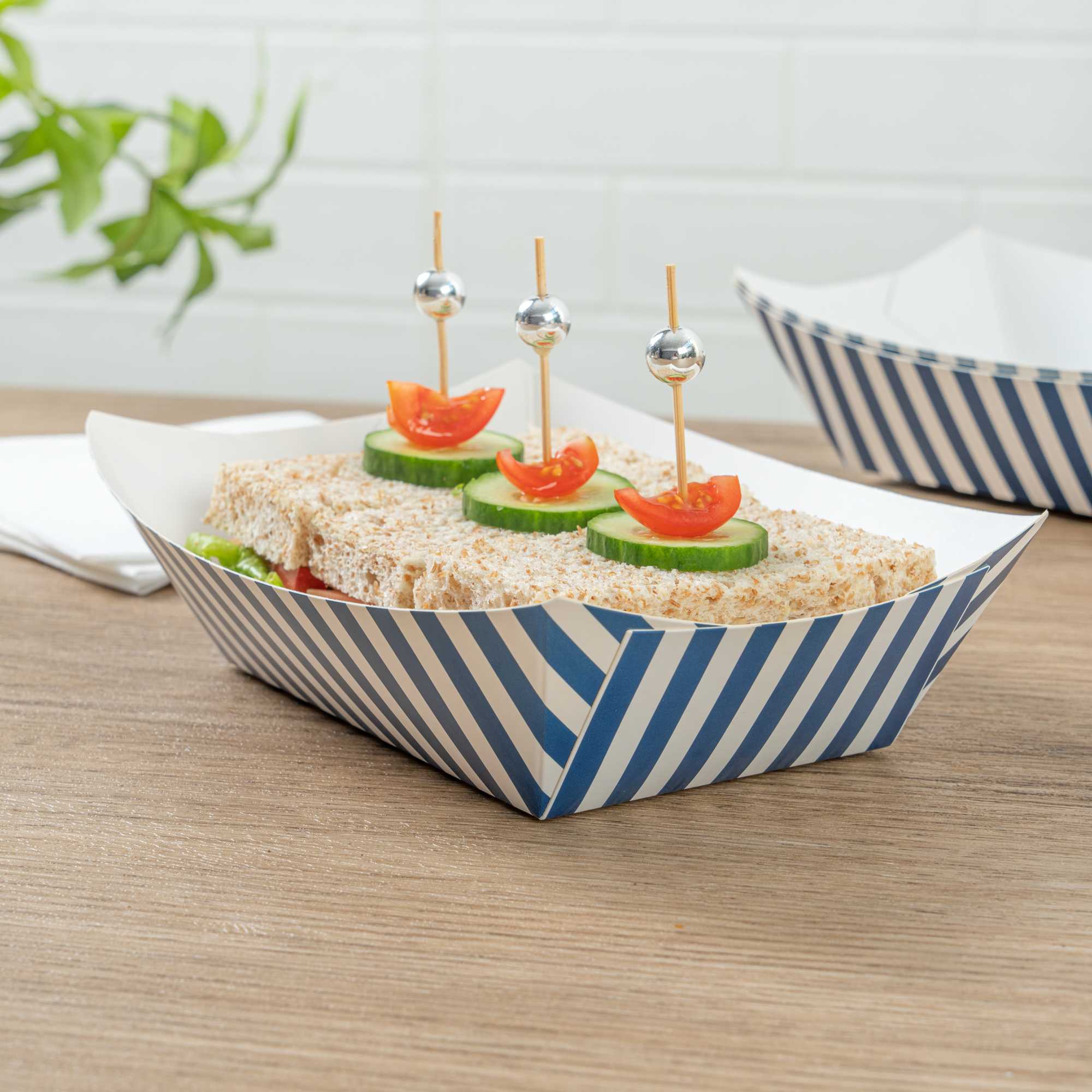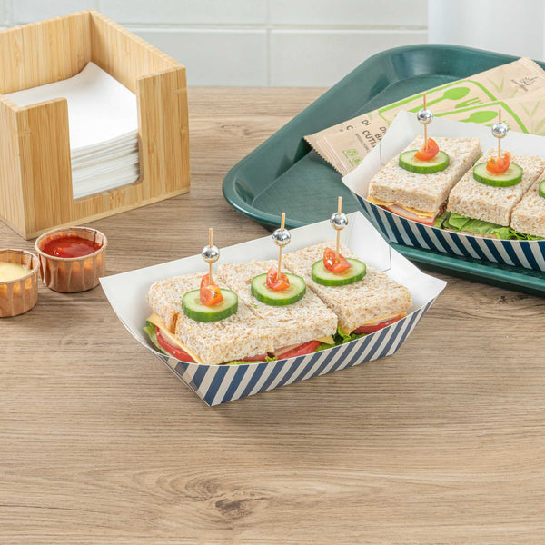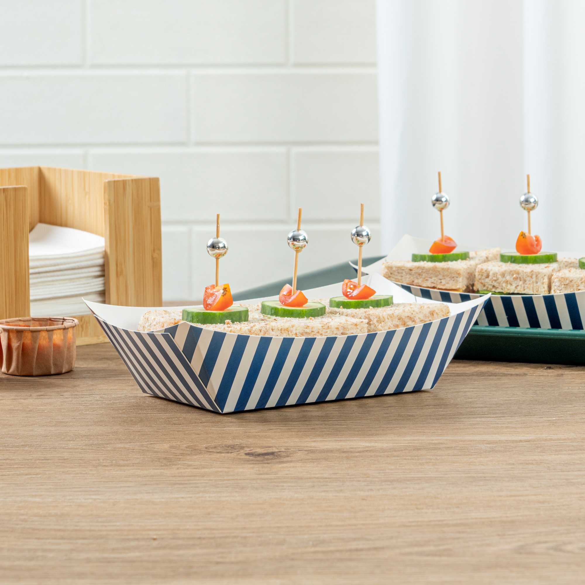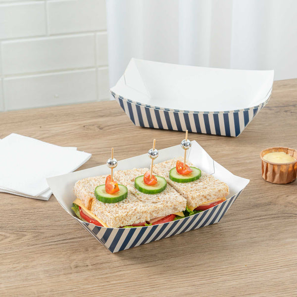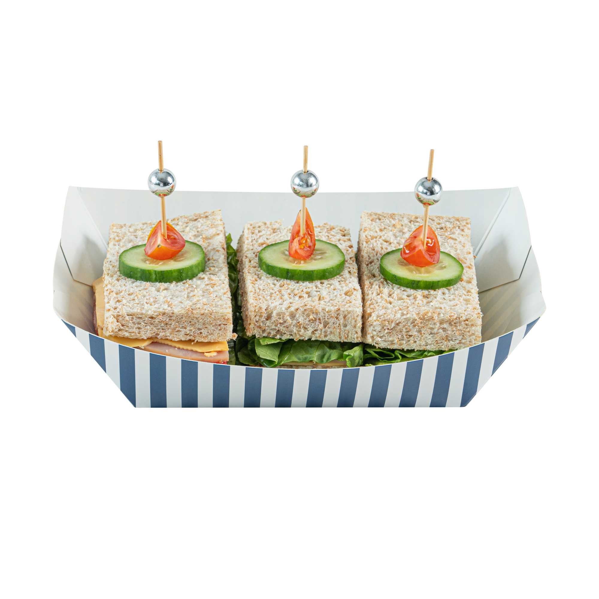 Introducing our Bio Tek 1-pound Blue and White Stripe Paper #100 Food Tray / Boats. Expertly crafted from sustainable paper, these 1-pound striped food trays add a touch of elegance to your culinary presentation. Designed to accommodate substantial portions, these sturdy trays are perfect for satisfying appetites. Enhanced with a greaseproof lining, they are perfectly suited for dishes rich in oil or moisture. From burgers to lobster rolls, crispy Caesar salads, and chicken wings, these paper food trays provide a streamlined solution for takeaway dining. Each of these paper food trays measures 5.5 inches long by 3.5 inches wide at the base and 8.4 inches long by 4.5 inches wide at the top. Sold in a 50 count box.