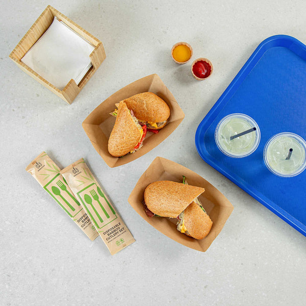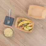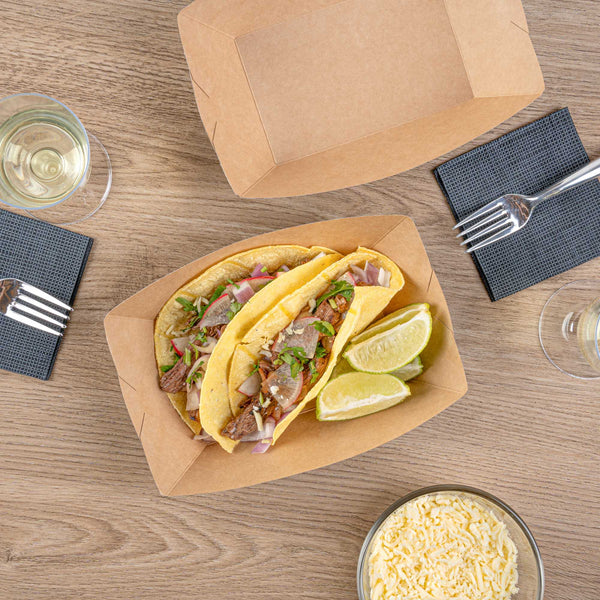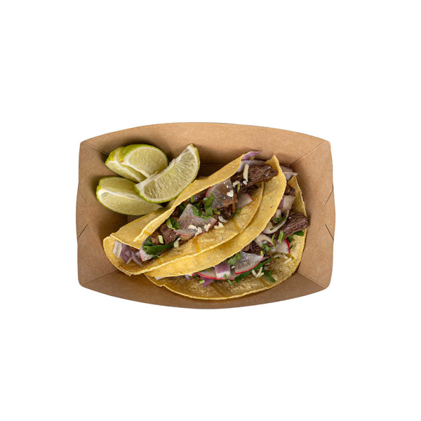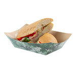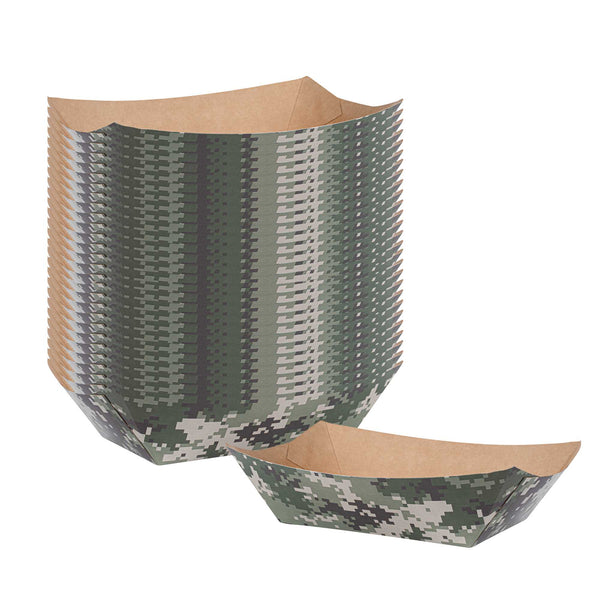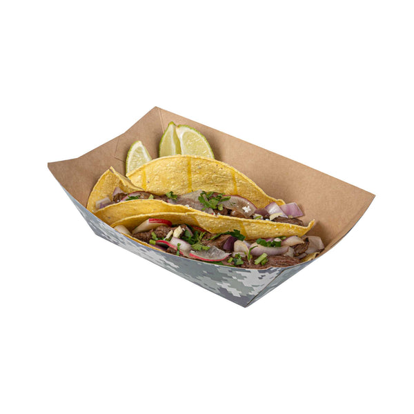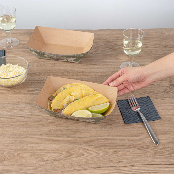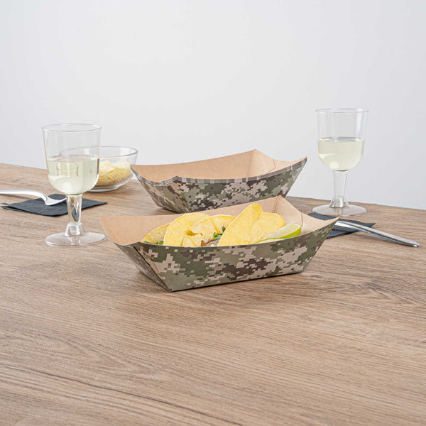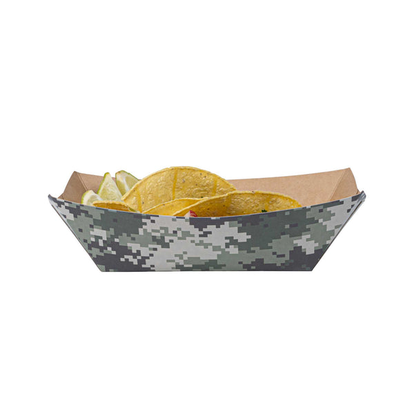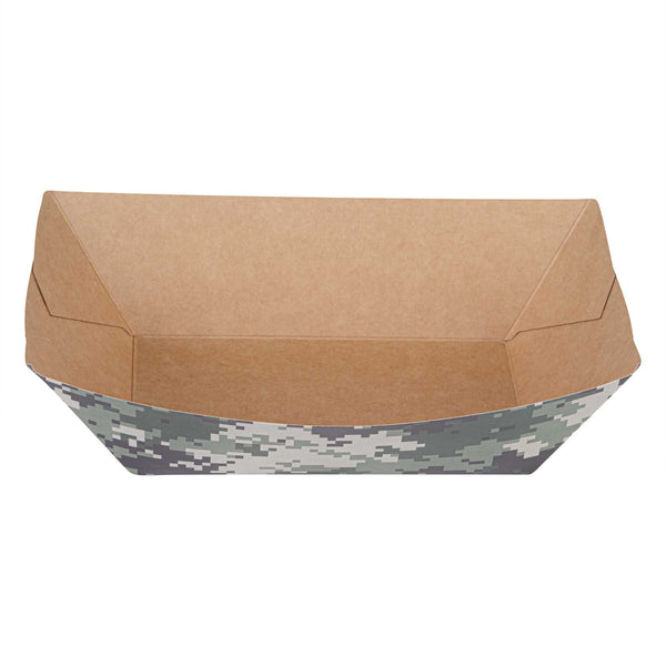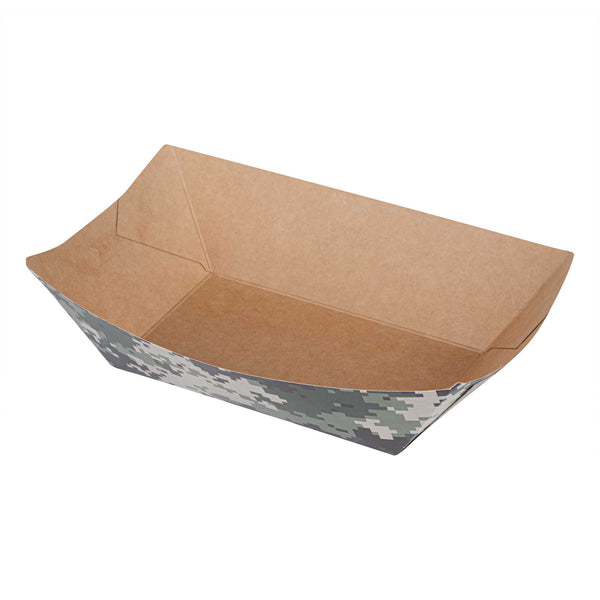 Serve your culinary creations with style using our Bio Tek 1-pound Camouflage Paper #100 Food Tray / Boats. Crafted from durable paper, these 1-pound camouflage trays add a touch of elegance to your food presentation. Designed to accommodate hearty portions, these sturdy trays are perfect for satisfying appetites. Enhanced with a greaseproof lining, they are ideally suited for dishes that are rich in oil or moisture. Whether it's burgers, lobster rolls, Caesar salads, or chicken wings, these paper food trays offer a convenient solution for takeaway dining. Each of these paper food trays measures 5.5 inches long by 3.5 inches wide at the base and 8.4 inches long by 4.5 inches wide at the top. Sold in a 200 count box.