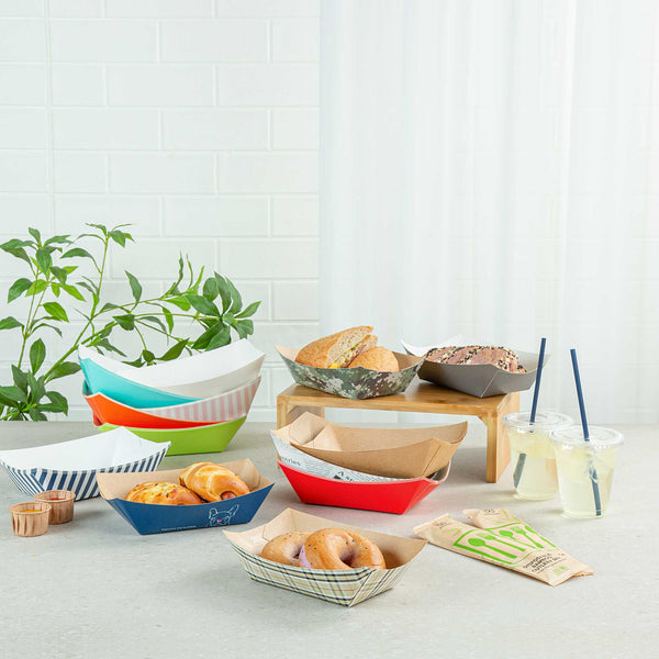 With numerous options to choose from, these paper food trays come in multiple colors to complement all kinds of food service establishments. Pick the paper boat that best fits your aesthetic!