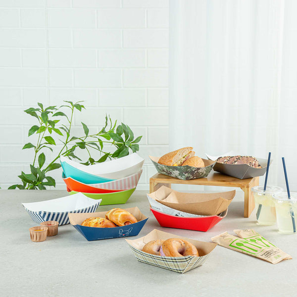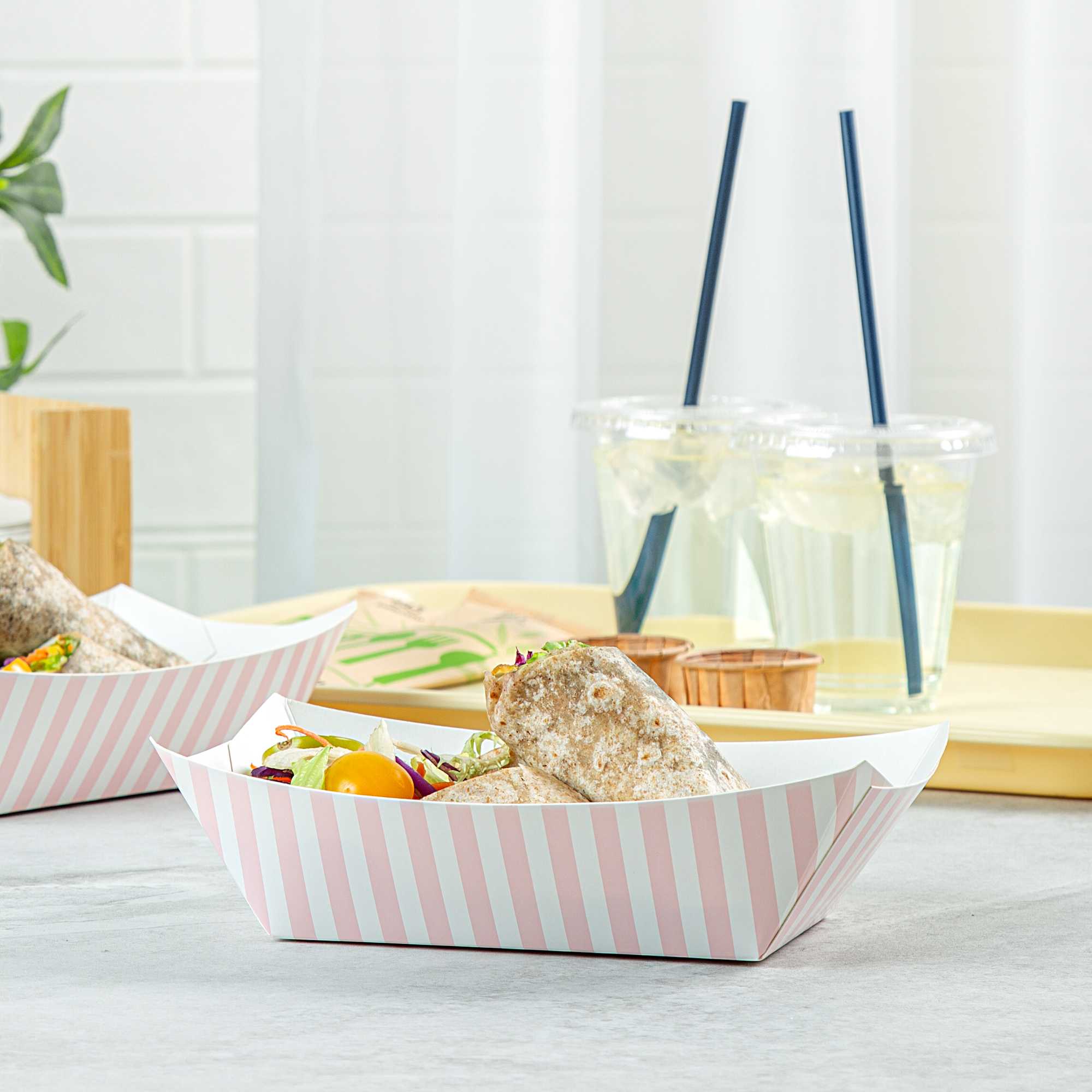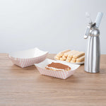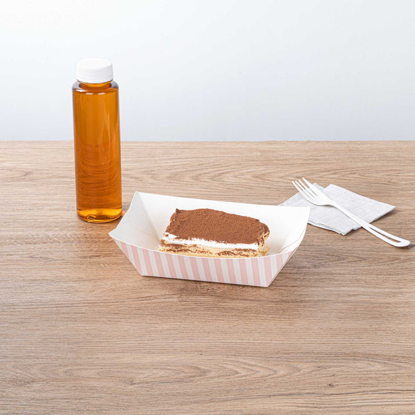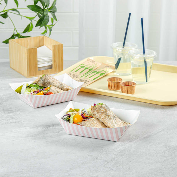 Elevate your dining experience with our Bio Tek 1-pound Pink and White Stripe Paper #100 Food Tray / Boats. Crafted from sustainable paper, these 1-pound striped trays add an air of sophistication to your culinary displays. Designed to accommodate hearty portions, these sturdy trays are perfect for satisfying appetites. Enhanced with a greaseproof lining, they are tailor-made for dishes that are rich in oil or moisture. Whether you're serving burgers, lobster rolls, Caesar salads, or chicken wings, these paper food trays provide a streamlined solution for takeaway dining. Each tray measures 4.2 inches long by 2.7 inches wide at the base and 7 inches long by 4 inches wide at the top. Sold in a 200 count box.