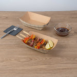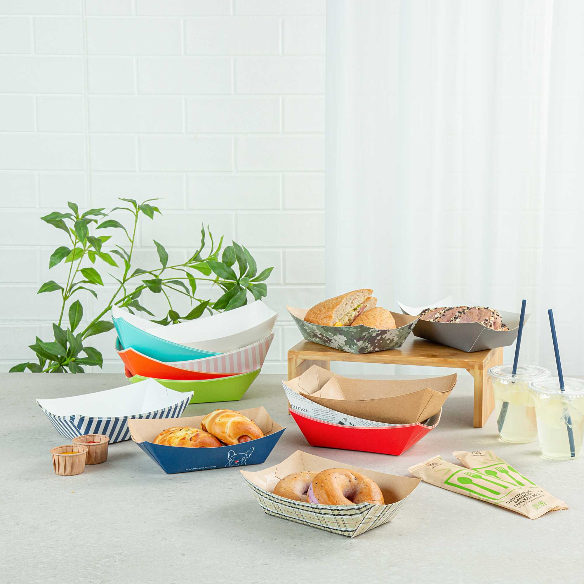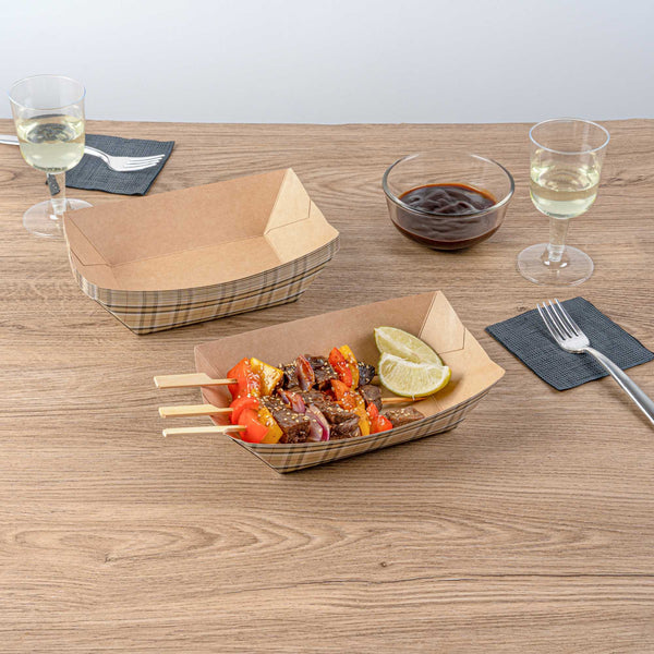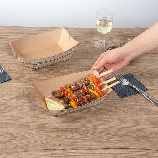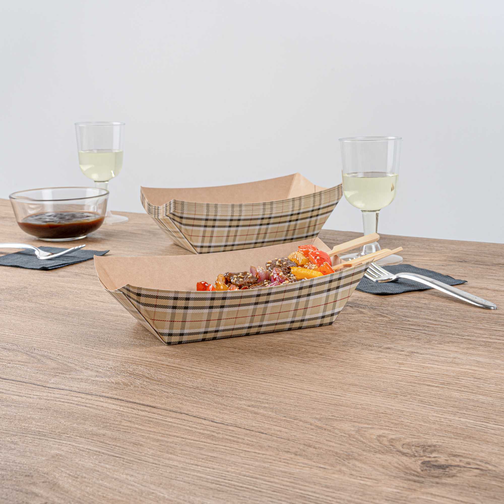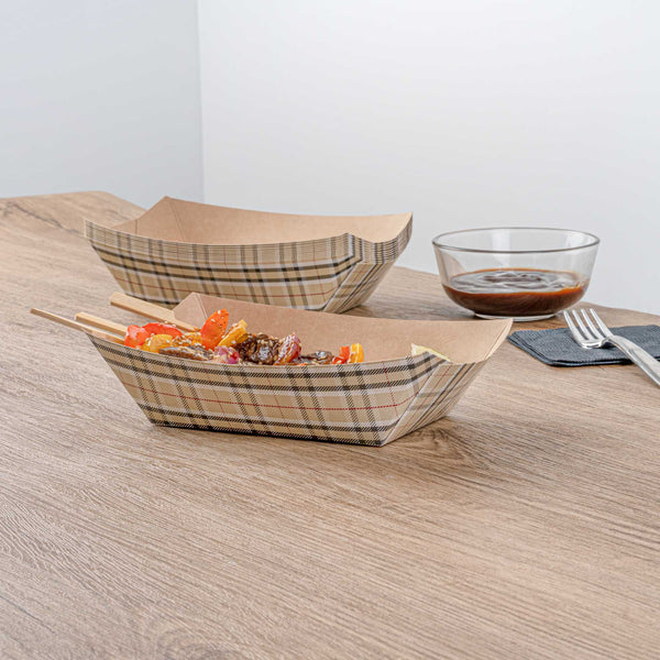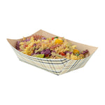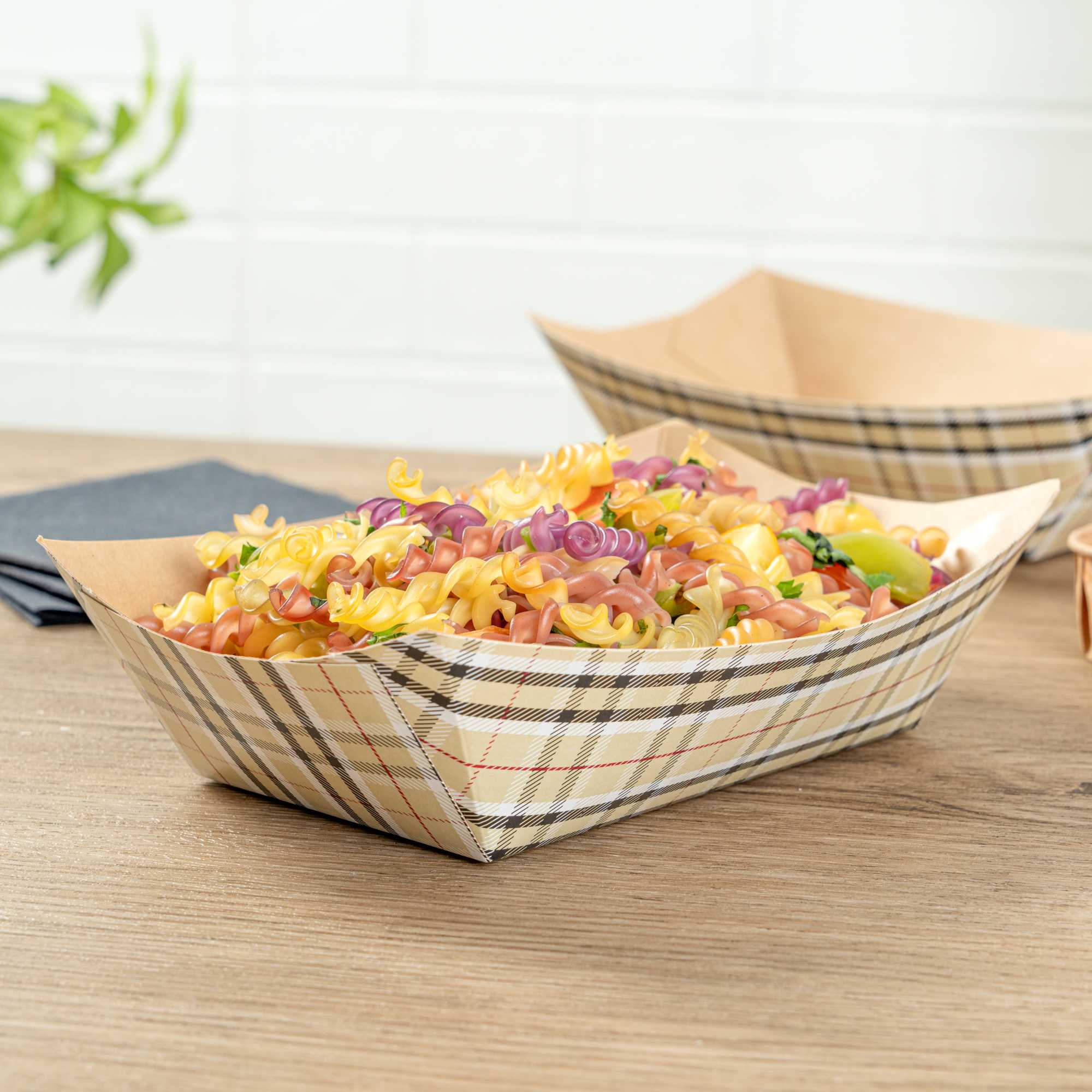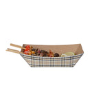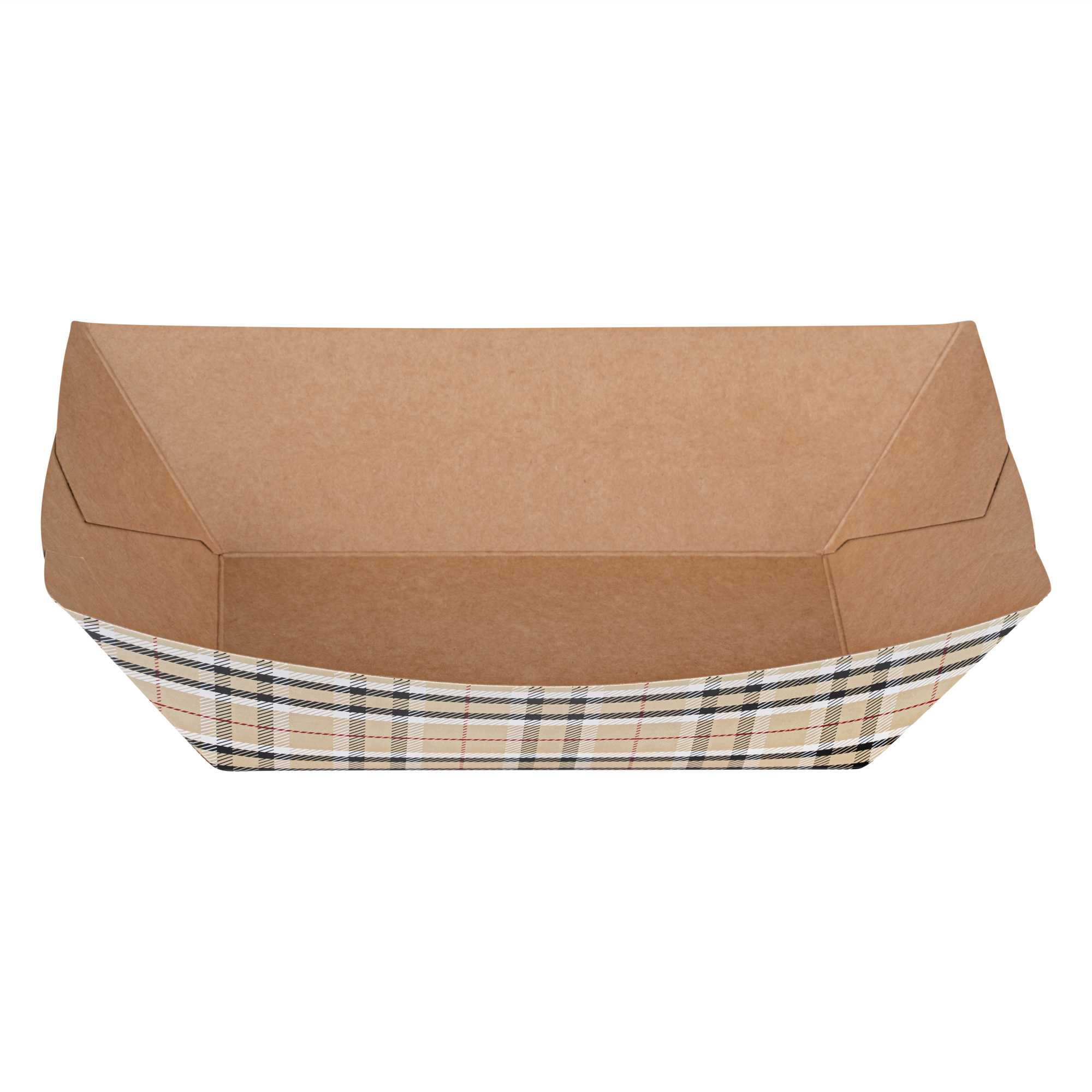 Elevate your serving game with our Bio Tek 1-pound Plaid Paper #100 Food Tray / Boats. Crafted from sustainable paper, these 1-pound plaid trays add a touch of sophistication to your dishes. Designed to hold generous portions, these sturdy trays are ideal for satisfying appetites. Equipped with a greaseproof lining, they are tailor-made for dishes laden with oil or moisture. Whether you're serving up burgers, lobster rolls, Caesar salads, or chicken wings, these paper food trays offer a practical solution for takeaway dining. Each tray measures 5.5 inches long by 3.5 inches wide at the base and 8.4 inches long by 4.5 inches wide at the top. Sold in a 200 count box.