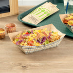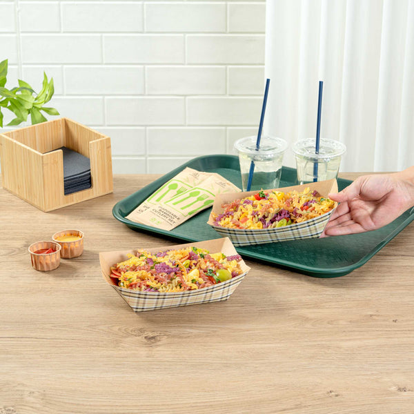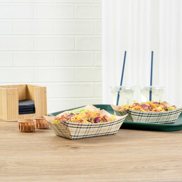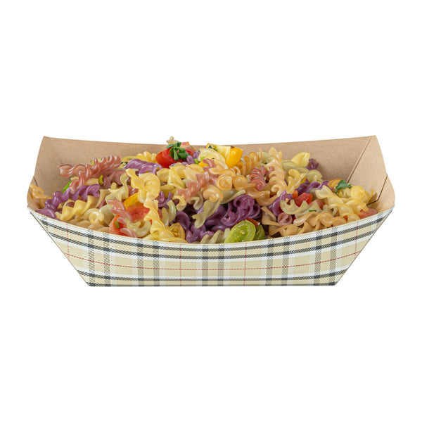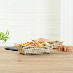 Elevate your serving game with our Bio Tek 1-pound Plaid Paper #100 Food Tray / Boats. Crafted from sustainable paper, these 1-pound plaid trays add a touch of sophistication to your dishes. Designed to hold generous portions, these sturdy trays are ideal for satisfying appetites. Equipped with a greaseproof lining, they are tailor-made for dishes laden with oil or moisture. Whether you're serving up burgers, lobster rolls, Caesar salads, or chicken wings, these paper food trays offer a practical solution for takeaway dining. Each tray measures 5.5 inches long by 3.5 inches wide at the base and 8.4 inches long by 4.5 inches wide at the top. Sold in a 50 count box.