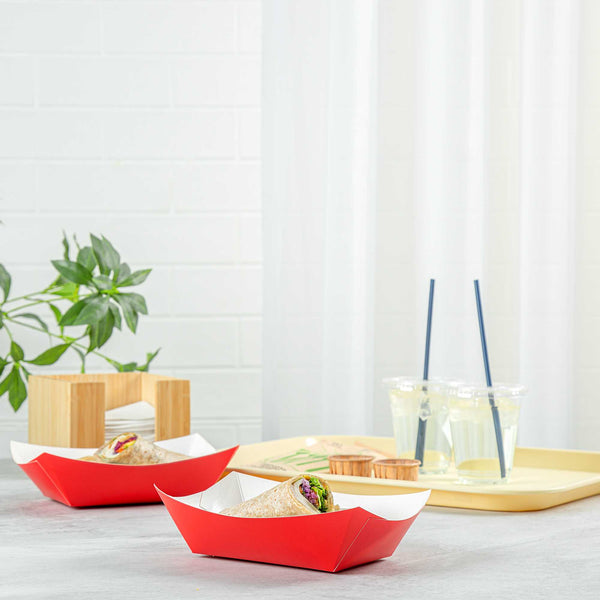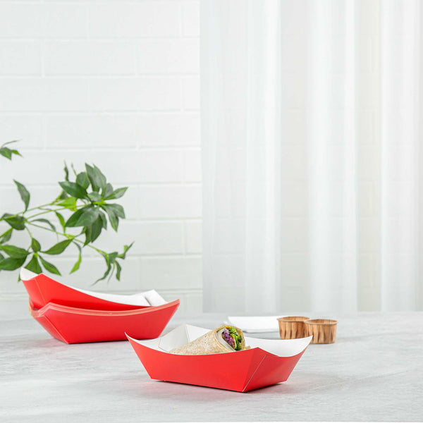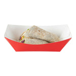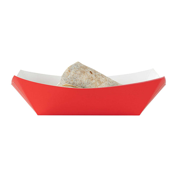 Transform your food presentation with our Bio Tek 1-pound Red Paper #100 Food Tray / Boats. Meticulously crafted from sustainable paper, these 1-pound red trays add a touch of sophistication to your culinary exhibits. Designed to hold substantial portions, these robust trays are ideal for satisfying appetites. Enhanced with a greaseproof lining, they're perfectly suited for dishes enriched with oil or moisture. From burgers to lobster rolls, Caesar salads, and chicken wings, these paper food trays redefine convenience for takeaway dining. Each tray measures 5.5 inches in length by 3.5 inches in width and 2 inches in height. Sold in a 200 count box.