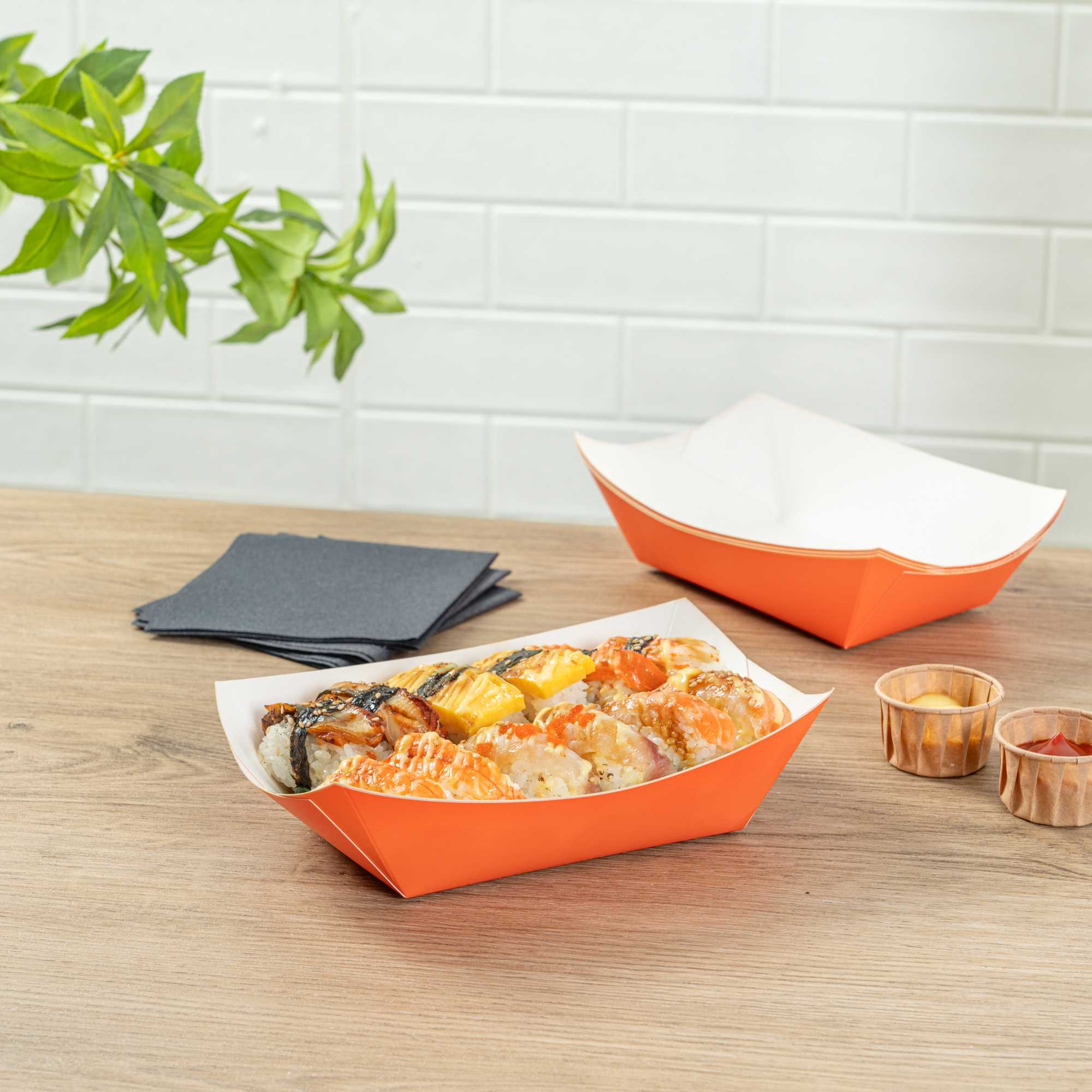 For a simple cleaning process for establishments and guests, these paper food boats are sustainably disposable. Reduce your impact on the environment!