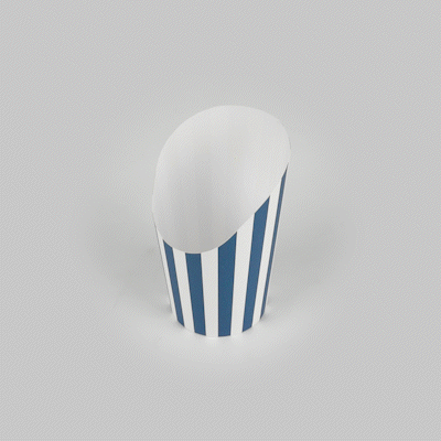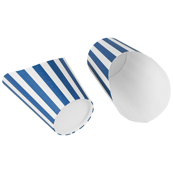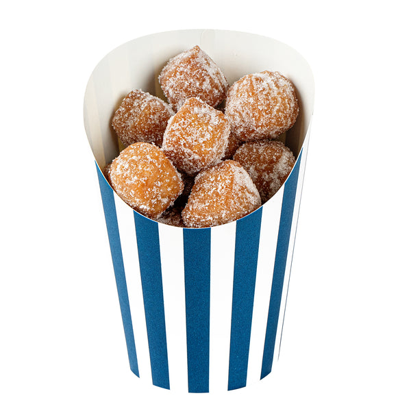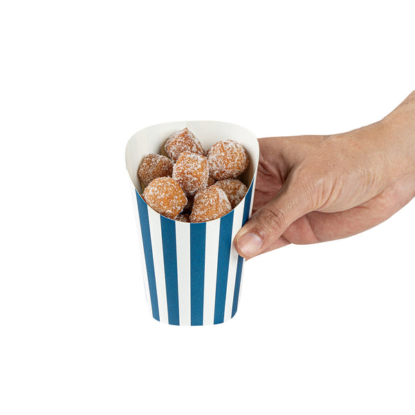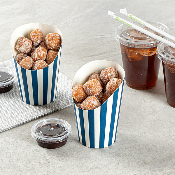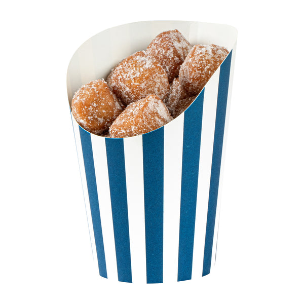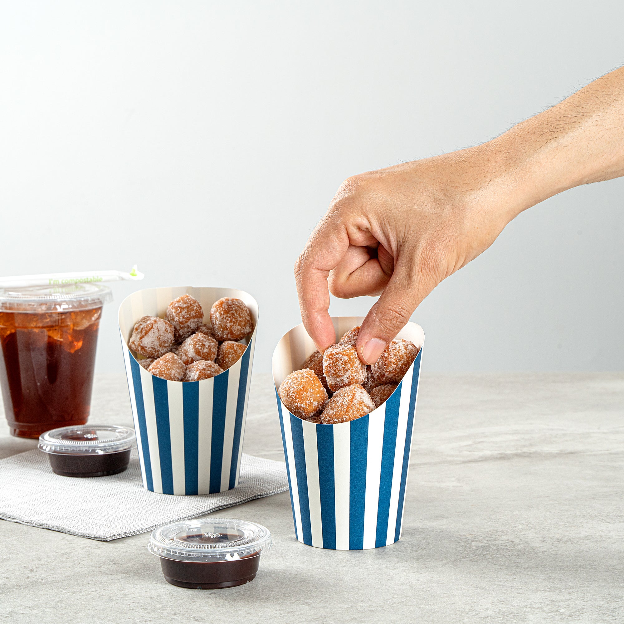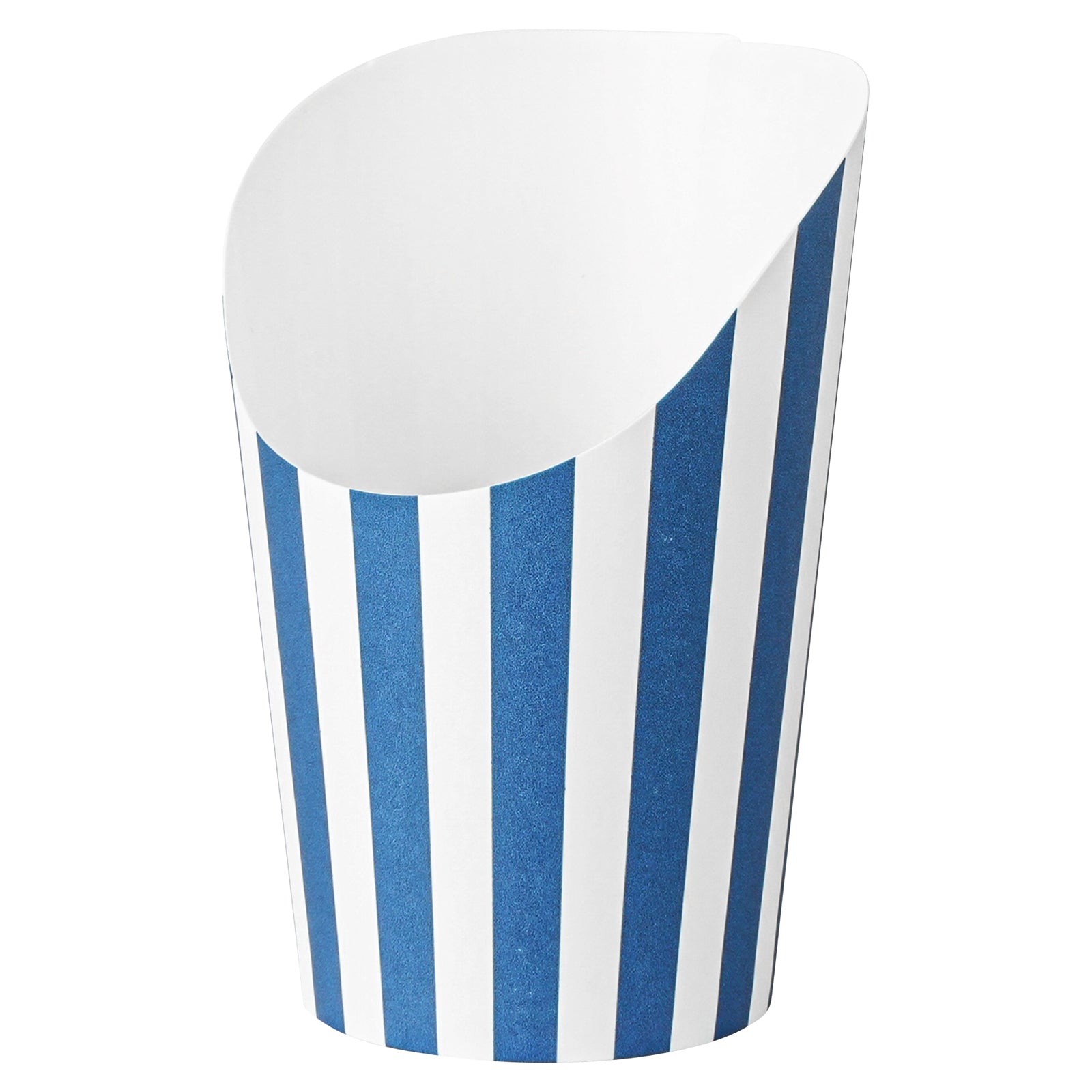 Revamp your snack service with our Bio Tek 12-ounce Round Blue and White Stripe Paper Incline Cups. These incline cups, lined with greaseproof material, ensure a neat appearance. Equipped with a broad, inclined rim, these fry cups can effortlessly scoop fries from warmers. Built with superior-quality paper, these disposable snack cups offer easy handling and upright positioning during mealtime. The striking blue and white design of these striped to go cups adds a stylish touch to your servings. These recyclable french fry holders are designed to be stacked, simplifying storage. The dimensions of these cups are 3.5 inches in diameter by 4.75 inches in height, and they can hold up to 12 ounces of snacks. Sold in a 100 count box.
