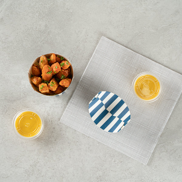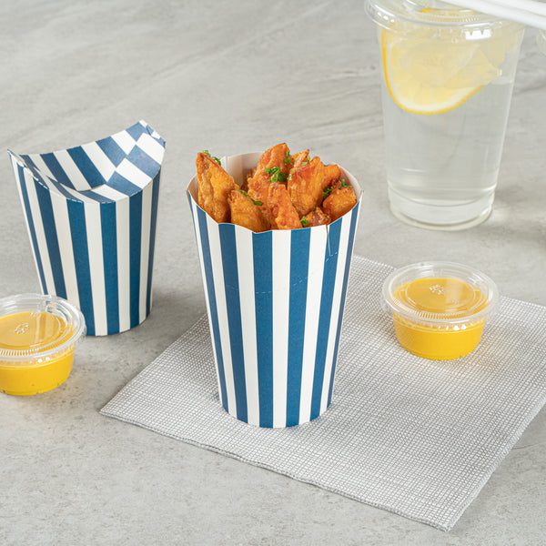 Offer your customers a portable and easy way to enjoy their orders with our Bio Tek 16-ounce Round Blue and White Stripe Paper To Go Fry Cups. These fry cups come with tab lock closure, affording clean transportation of orders and maintaining food freshness. Marked lines on the cover of these french fry cups provide a simple operation to open and shut each cup. These recyclable fry holders are greaseproof, granting your customers a neat way to enjoy their takeaway treats. The blue and white stripes of these paper fry cups can be inscribed on them, ensuring more order accuracy. To optimize storage, these snack cups can be stacked efficiently in your food service location. These robust disposable fry cups can hold up to 16 ounce Rounds of food, each measuring 3.25 inches in diameter by 4.25 inches in height. Sent in a 100 count box.