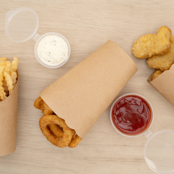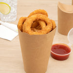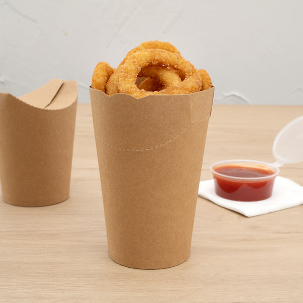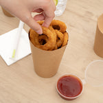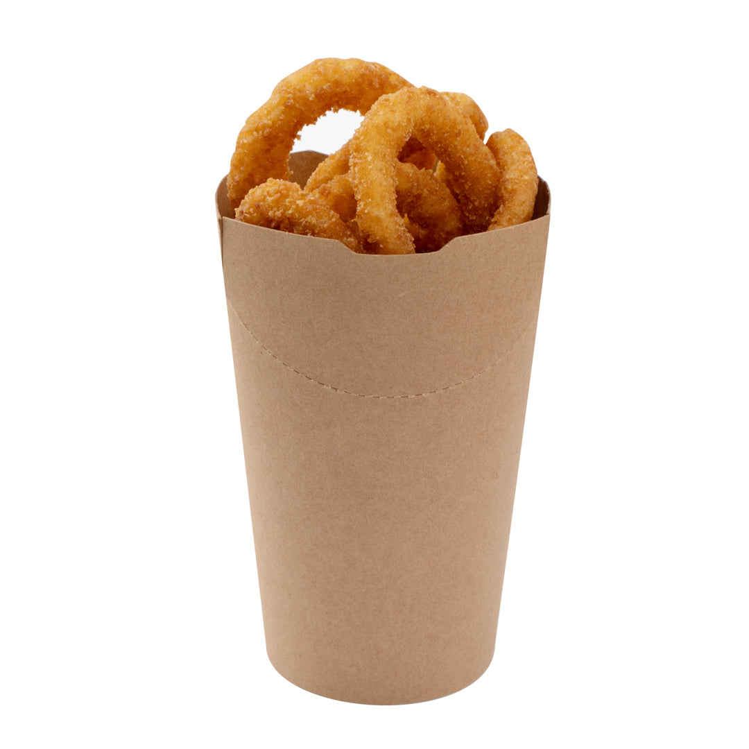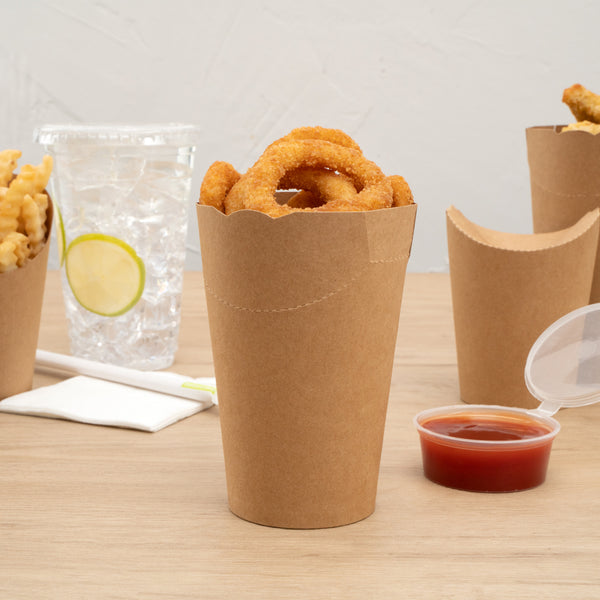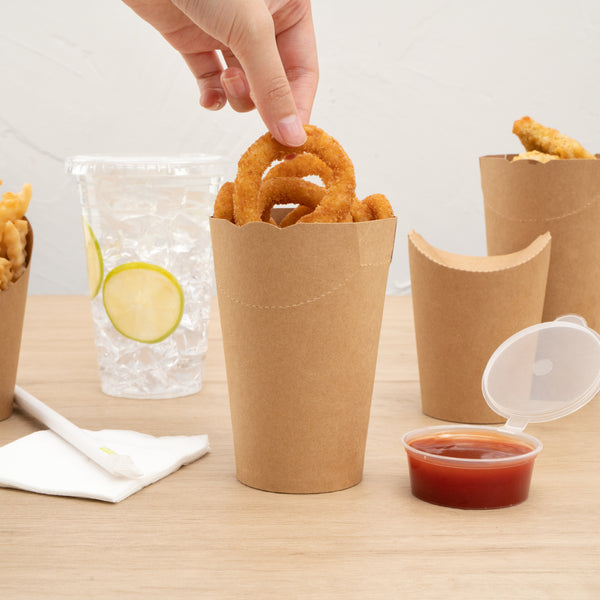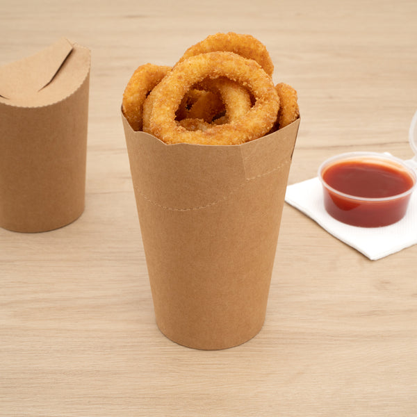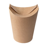 Use our Bio Tek 16-ounce Round Kraft Paper To Go Fry Cups for a mess-free way to deliver orders to customers. With a tab lock closure, these disposable snack cups keep your hot or cold snacks covered, making them perfect for take out and delivery services. These fry holders feature dotted lines on the cover that allow your patrons to effortlessly open cups when they are ready to enjoy their orders. With a greaseproof lining, these fry holders are specially designed to keep oily foods inside the cup and not on your customers' hands. These paper cups for fries feature a kraft finish that brings an earth-friendly look to carry out orders and can be written on to keep track of guests' orders. Constructed from high-quality paper, these paper fry cups are conveniently recyclable, providing guests at your concession stand or catered event a simple way to dispose of cups after use. These to go fry cups are stackable, allowing you to display a number of cups in a self-serve station or store them in your storage room without taking up much space. Measuring 3.25 inches in diameter by 4.25 inches in height, these kraft food cups can contain up to 16 ounce Rounds. Shipped in a 100 count box.