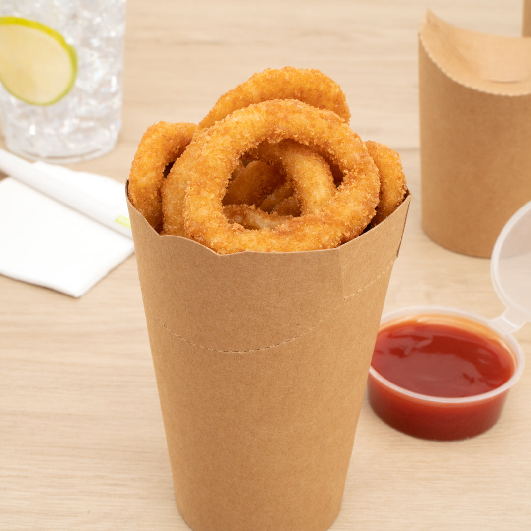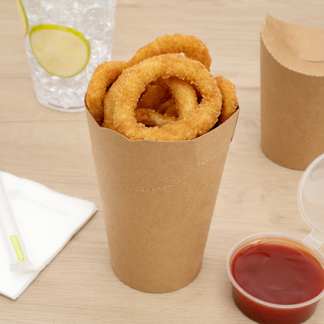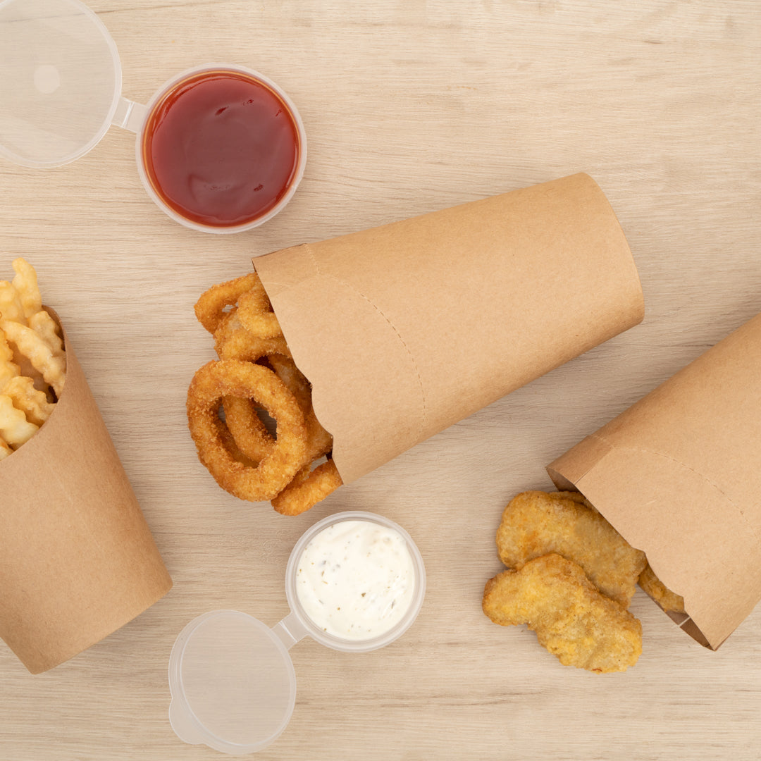 Use our Bio Tek 16-ounce Round Kraft Paper To Go Fry Cups for a mess-free way to deliver orders to customers. With a tab lock closure, these disposable snack cups keep your hot or cold snacks covered, making them perfect for take out and delivery services. These fry holders feature dotted lines on the cover that allow your patrons to effortlessly open cups when they are ready to enjoy their orders. With a greaseproof lining, these fry holders are specially designed to keep oily foods inside the cup and not on your customers' hands. These paper cups for fries feature a kraft finish that brings an earth-friendly look to carry out orders and can be written on to keep track of guests' orders. Constructed from high-quality paper, these paper fry cups are conveniently recyclable, providing guests at your concession stand or catered event a simple way to dispose of cups after use. These to go fry cups are stackable, allowing you to display a number of cups in a self-serve station or store them in your storage room without taking up much space. Measuring 3.25 inches in diameter by 4.25 inches in height, these kraft food cups can contain up to 16 ounce Rounds. Shipped in a 100 count box.