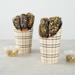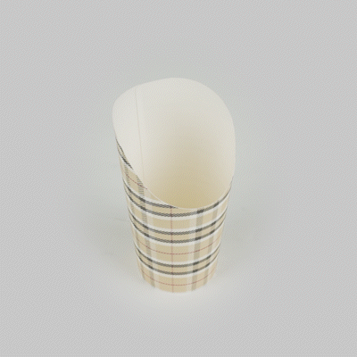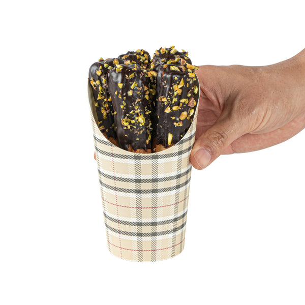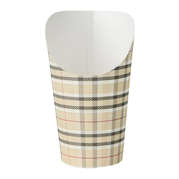 Transform your snack dispensing with our Bio Tek 16-ounce Round Plaid Paper Incline Cups. These paper incline cups, featuring a greaseproof lining, inhibit oil marks to present a clean appeal. The wide, inclined rim design of these plaid paper cups makes scooping fries out of a warmer a breeze. Constructed using high-quality paper, these food holders provide comfortable handling and stability for snacks during meal times. The plaid design of these paper to go cups gives a stylish twist to your snack servings. With a stackable design of these disposable paper cups ensures efficient storage. These recyclable paper snack cups, measuring 3.5 inches in diameter by 5.75 inches in height, can fit up to 16 ounces of snacks. Sold in a 100 count box.