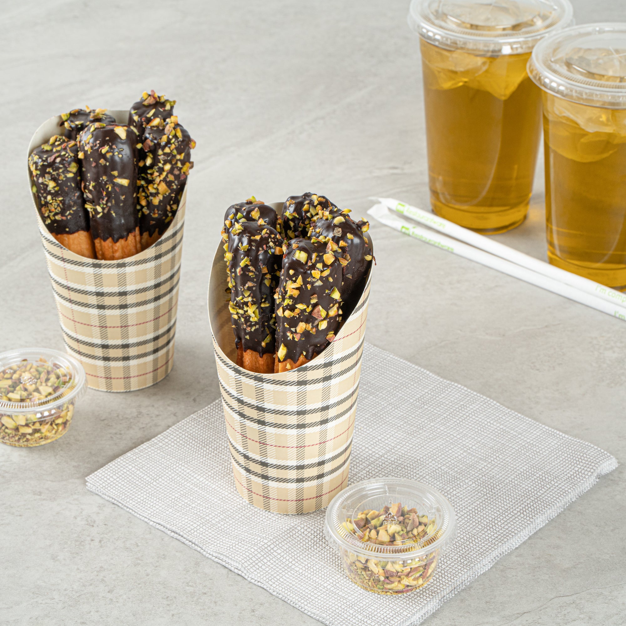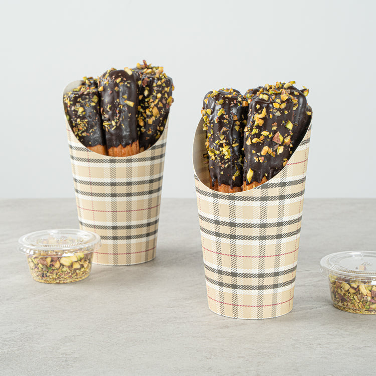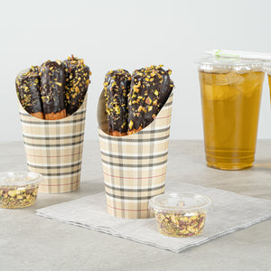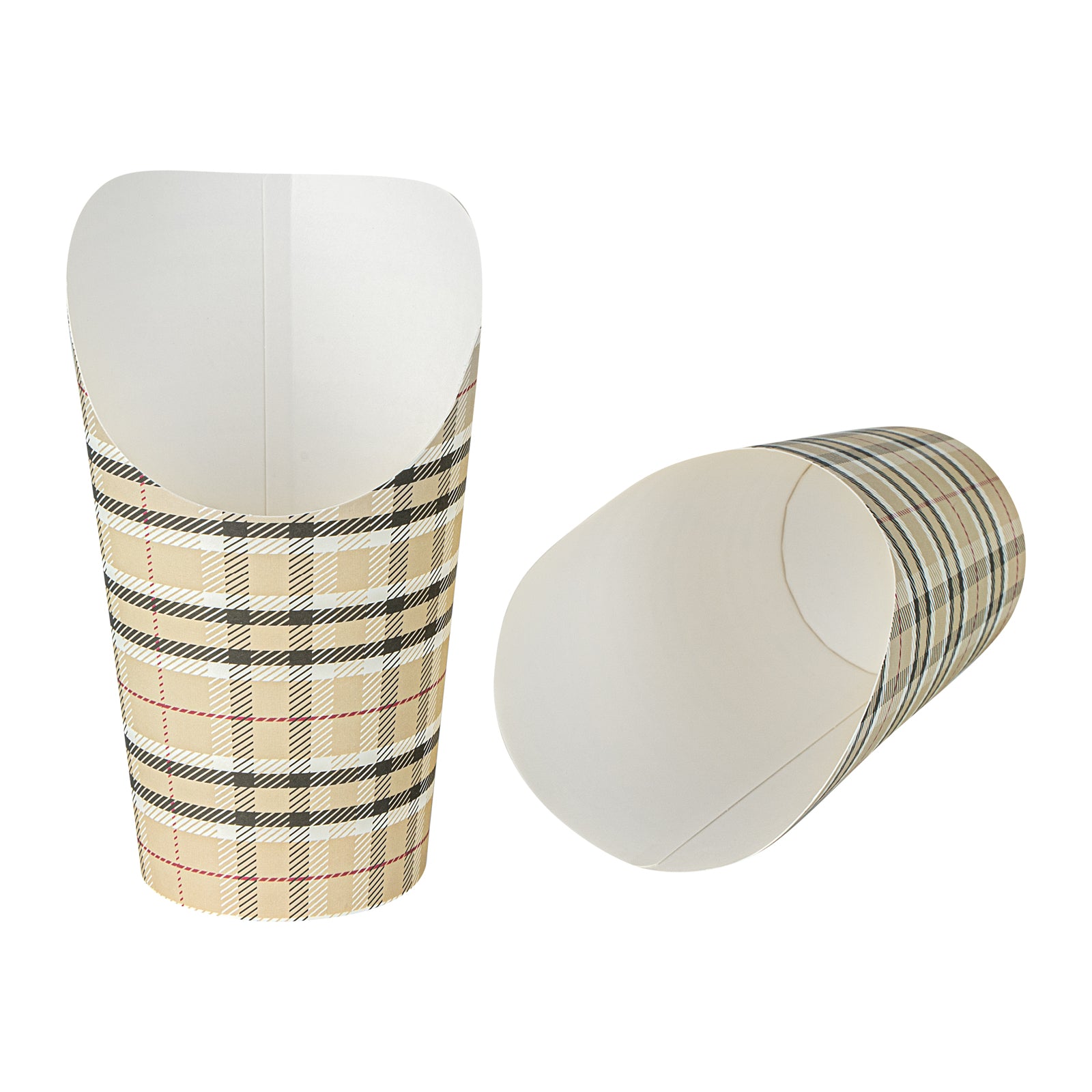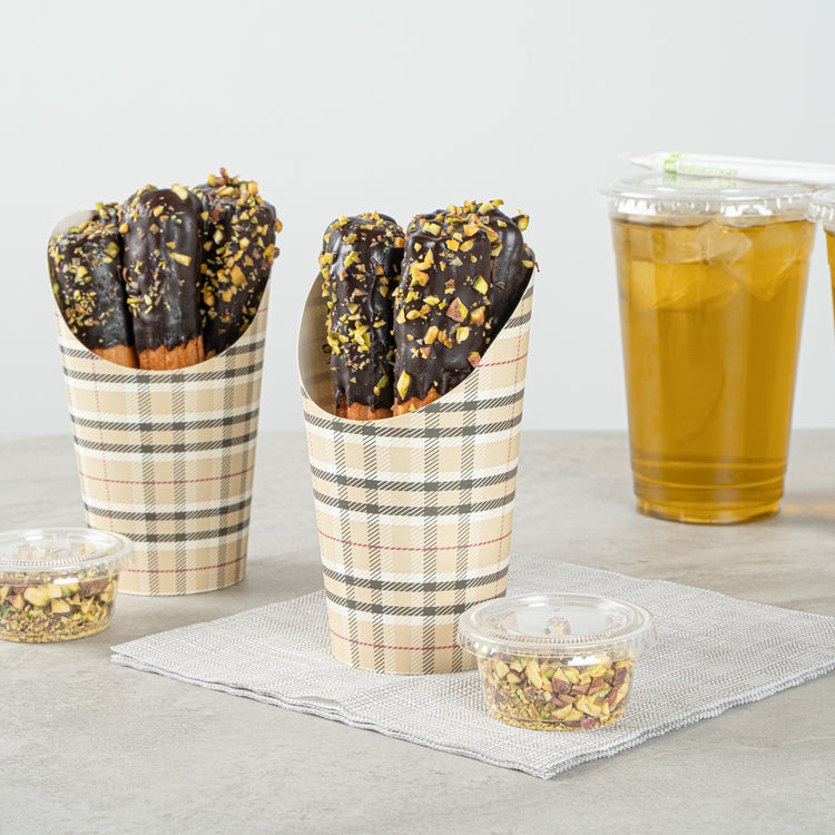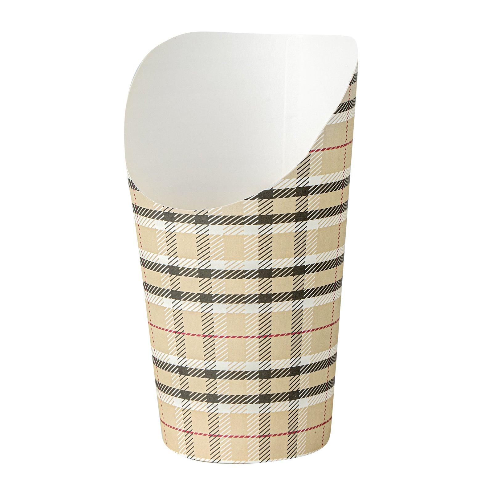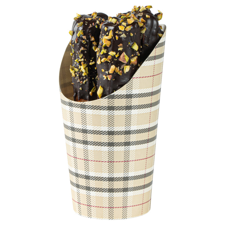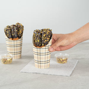 Transform your snack dispensing with our Bio Tek 16-ounce Round Plaid Paper Incline Cups. These paper incline cups, featuring a greaseproof lining, inhibit oil marks to present a clean appeal. The wide, inclined rim design of these plaid paper cups makes scooping fries out of a warmer a breeze. Constructed using high-quality paper, these food holders provide comfortable handling and stability for snacks during meal times. The plaid design of these paper to go cups gives a stylish twist to your snack servings. With a stackable design of these disposable paper cups ensures efficient storage. These recyclable paper snack cups, measuring 3.5 inches in diameter by 5.75 inches in height, can fit up to 16 ounces of snacks. Sold in a 100 count box.