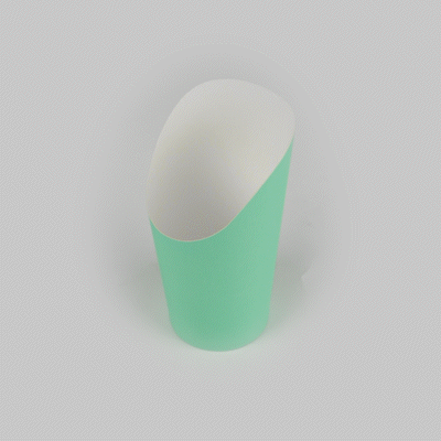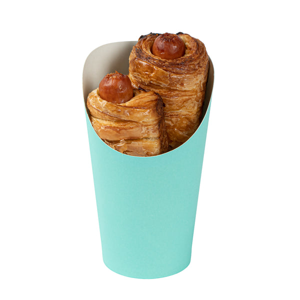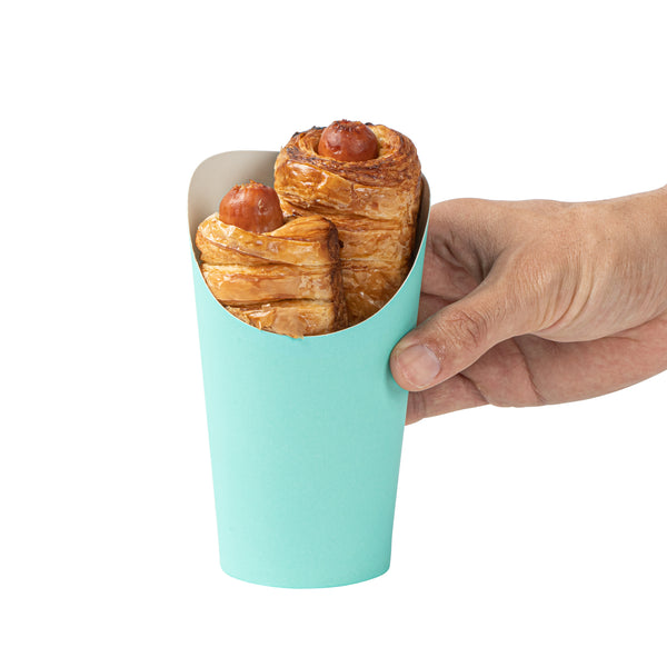 Introduce a new vibe to your snack service with our Bio Tek 16-ounce Round Turquoise Paper Incline Cups. The greaseproof feature of these incline cups avoids unattractive oil stains, providing a spotless look. With a wide, inclined rim, scooping fries from the warmer is simplified. Manufactured from premium paper, these disposable french fry holders allow consumers to handle their treats easily while enjoying meals. The sleek turquoise finish of these fry containers adds a stylish edge to your snack offerings. These french fry cups are stackable for efficient organization in your storage space. The recyclable snack cups measure 3.5 inches in diameter by 5.75 inches in height, and can carry up to 16 ounces of snacks. Sold in a 100 count box.