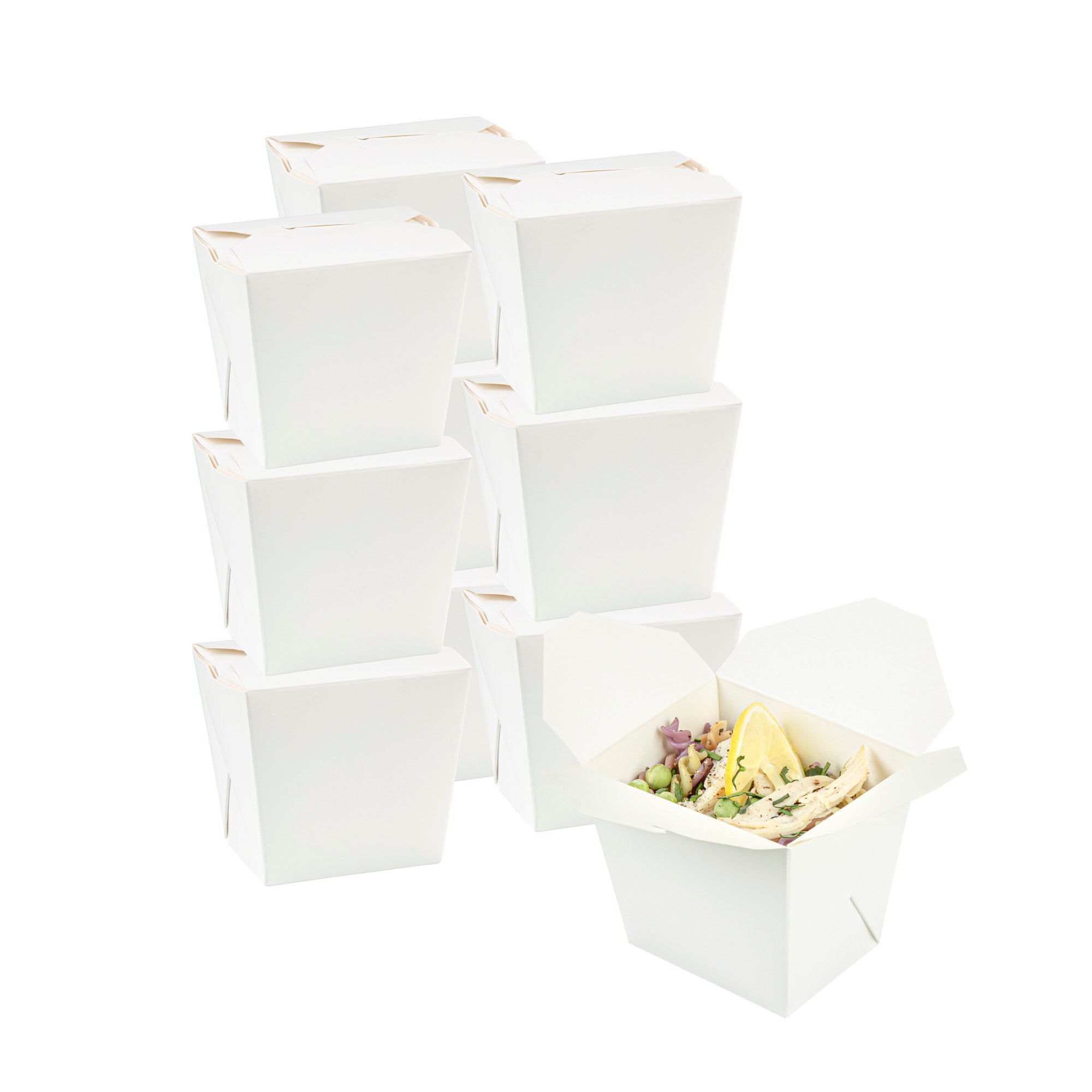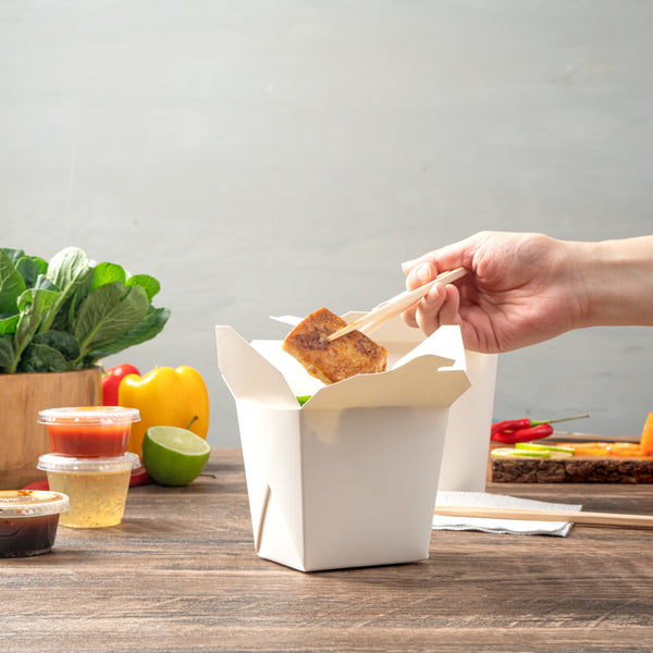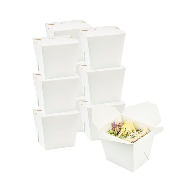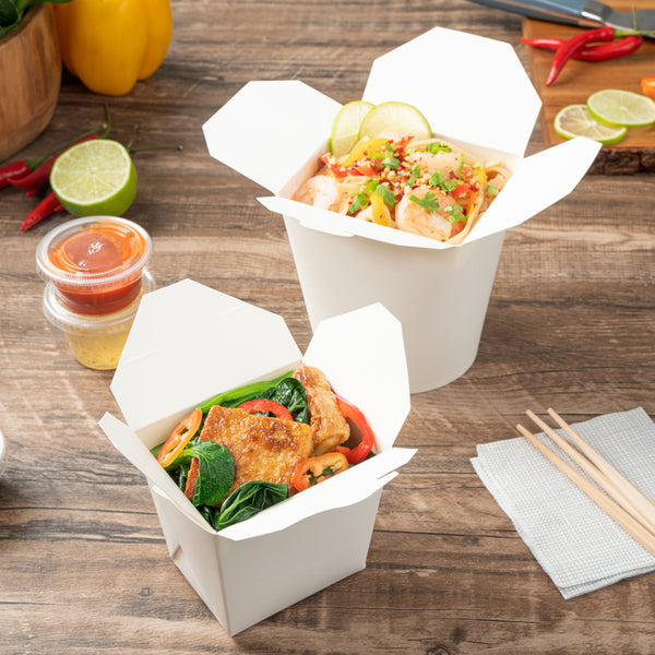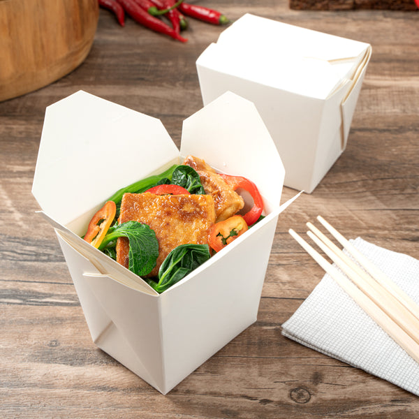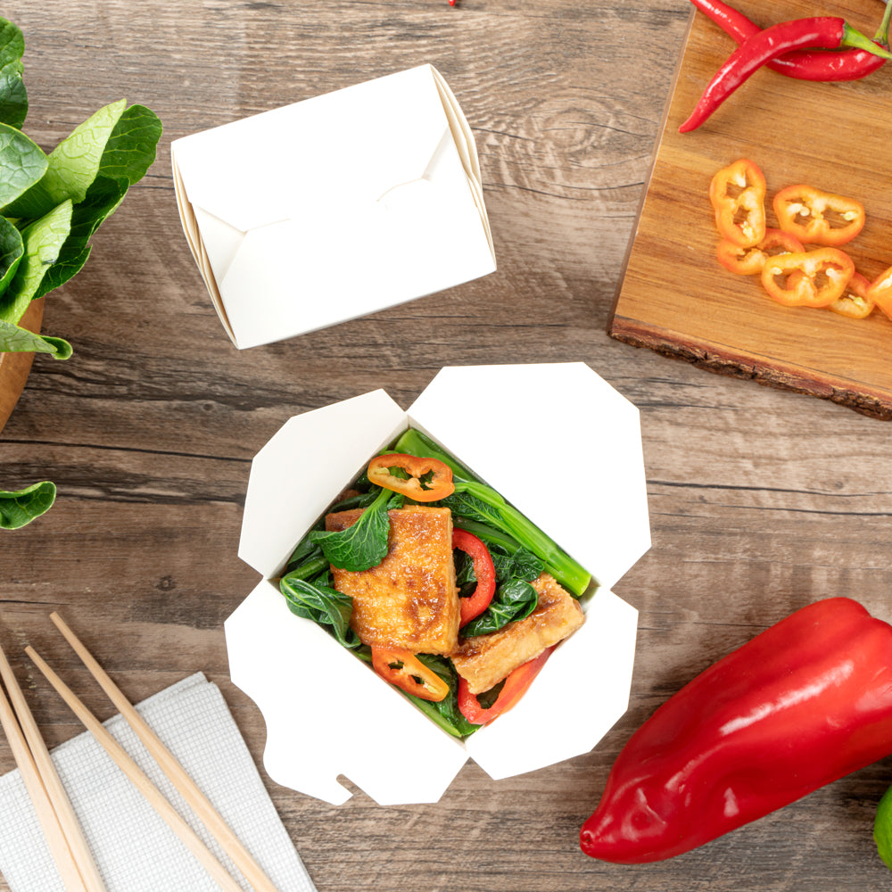 These takeaway boxes are made from thick paper and can easily hold hot and cold foods. Ideal for packing lunches for work!