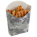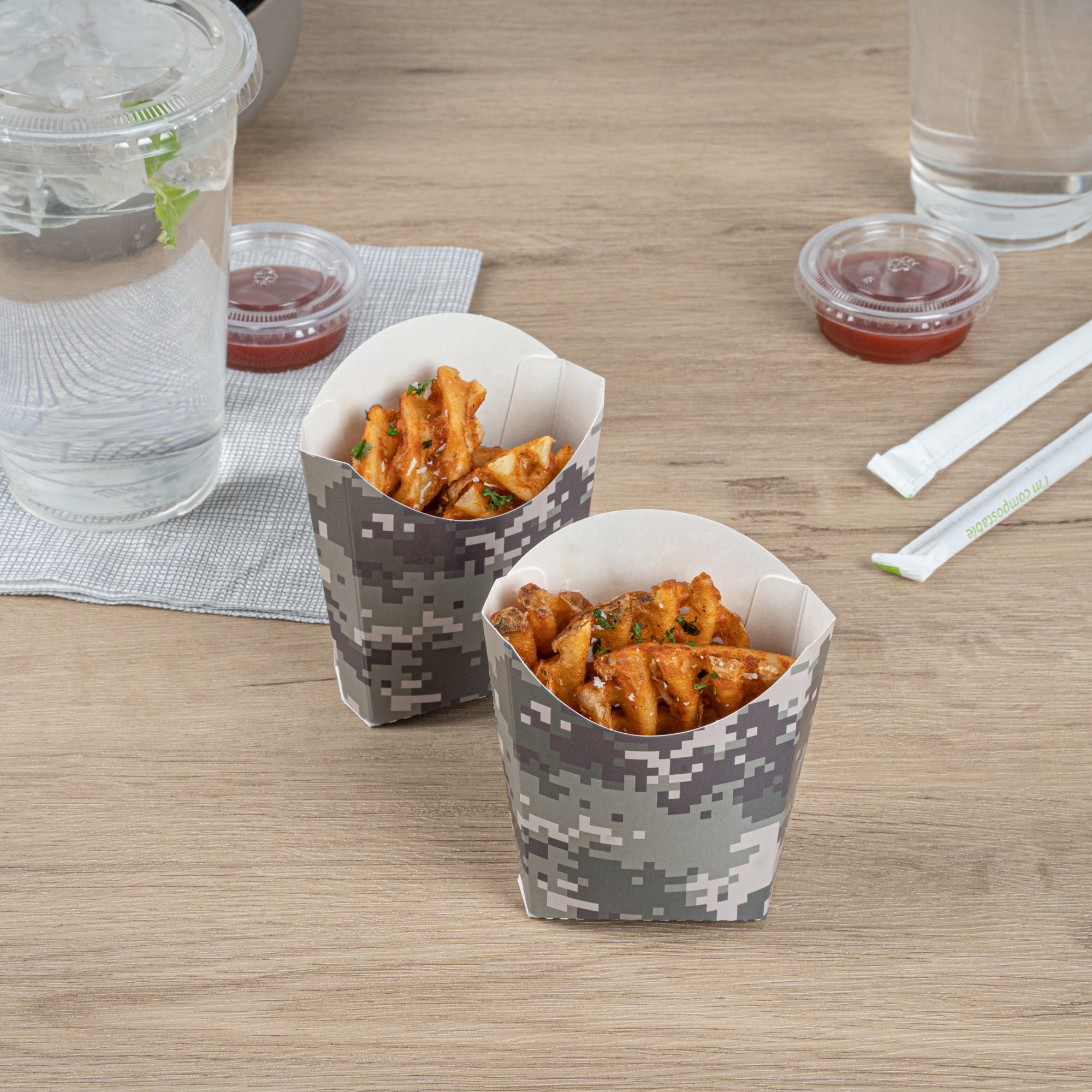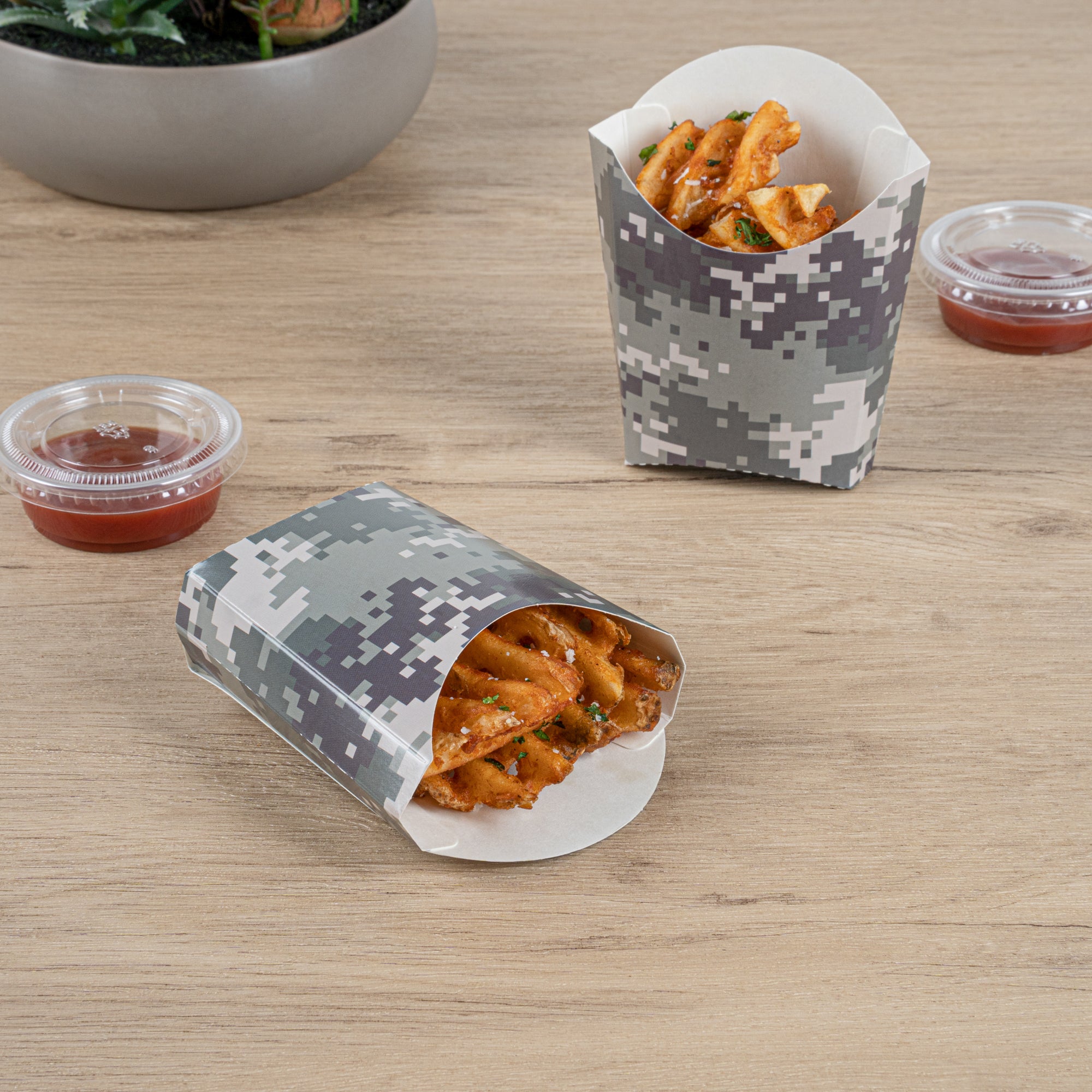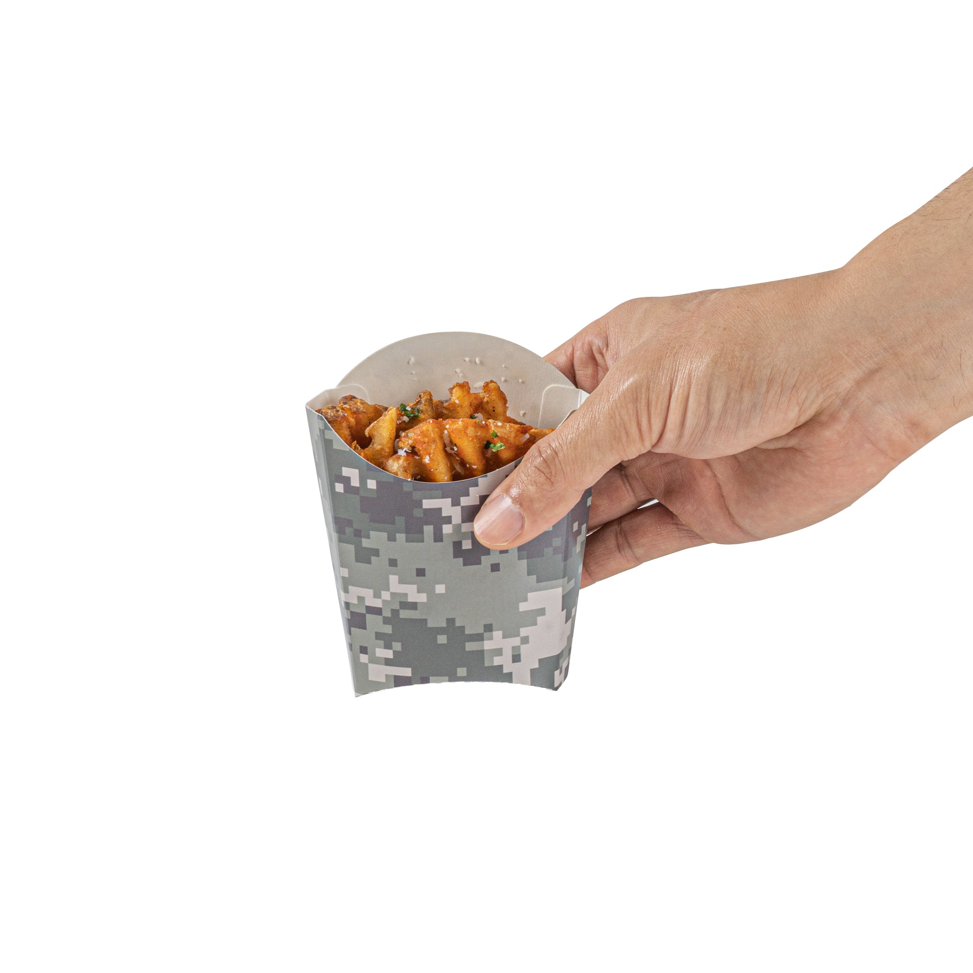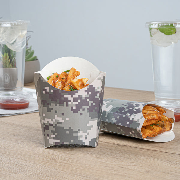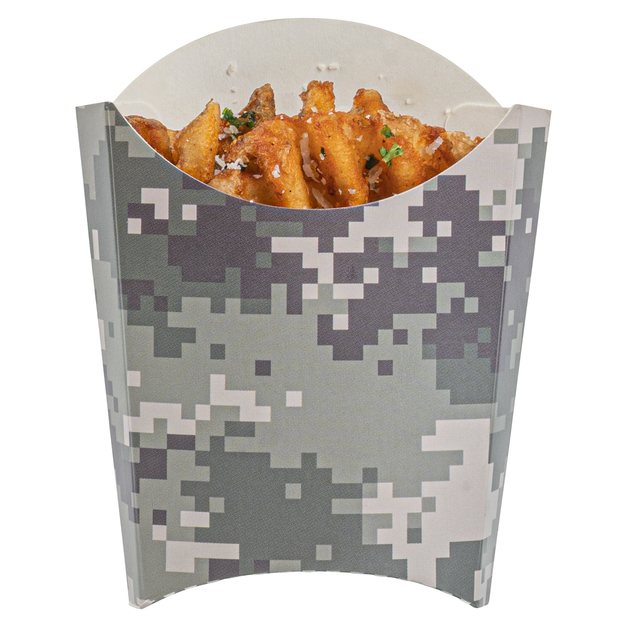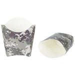 Fill our Bio Tek Camouflage Paper Fry Cups / Snack Containers with delicious fries easily. With a greaseproof lining, these fry cups do an excellent job in preventing oils from staining. Thanks to the angled rim, these fry serving cups can scoop fries directly into the container. Crafted from sturdy paper, these fry holders provide customers with an effortless way to carry hot snacks on the go. Decked in a cool camouflage print, these paper cups enhance your snack-serving fashion quotient. These fry cups are easily stackable, saving valuable storage space and are recyclable, ensuring a straightforward, green cleanup. Every 2-ounce cup is 2.75 inches wide by 3.5 inches tall. Shipped in a 100 count box.