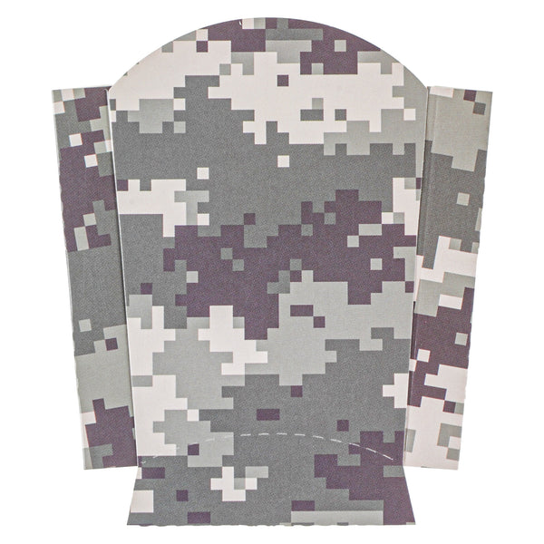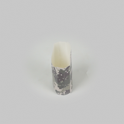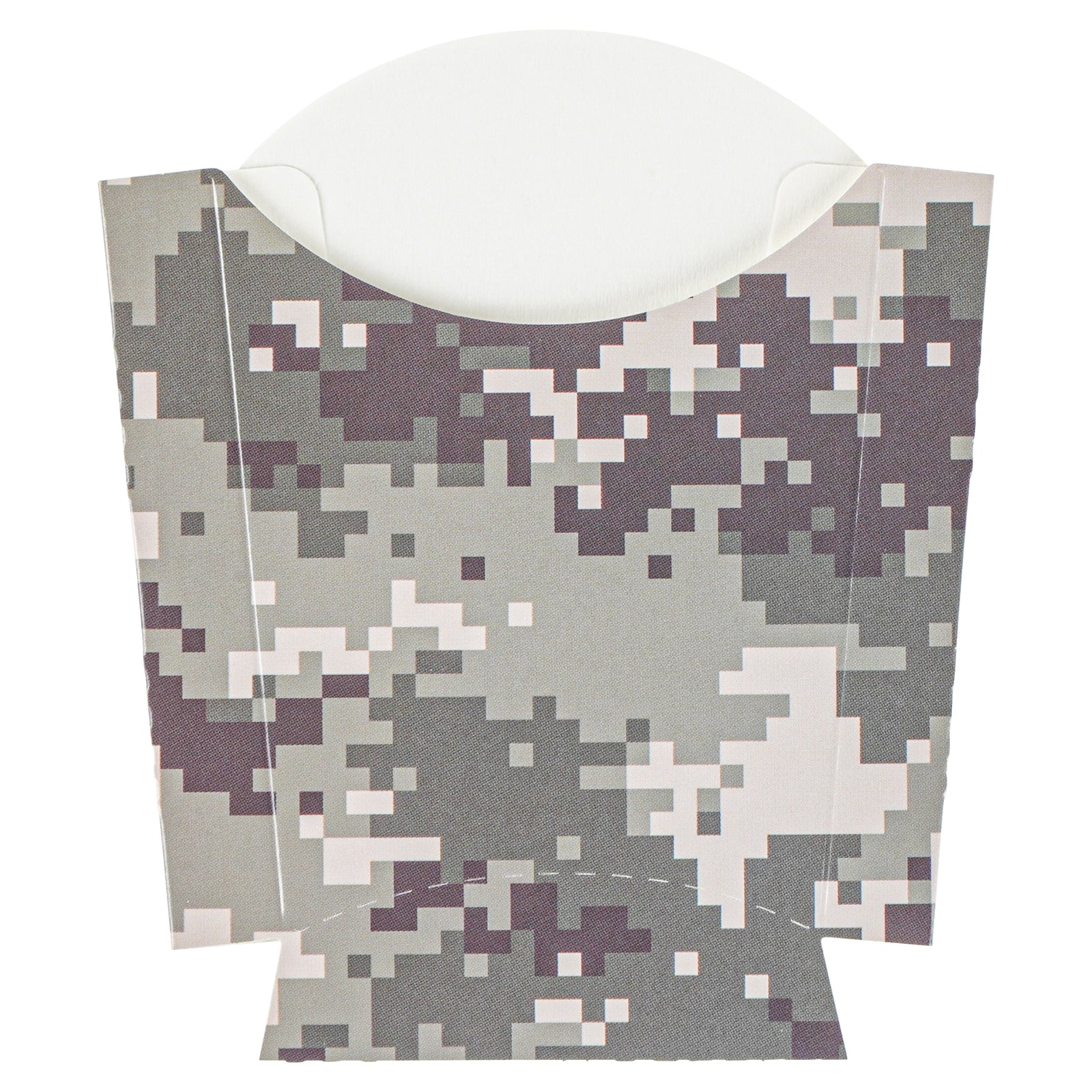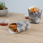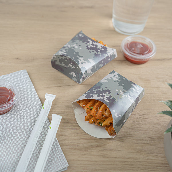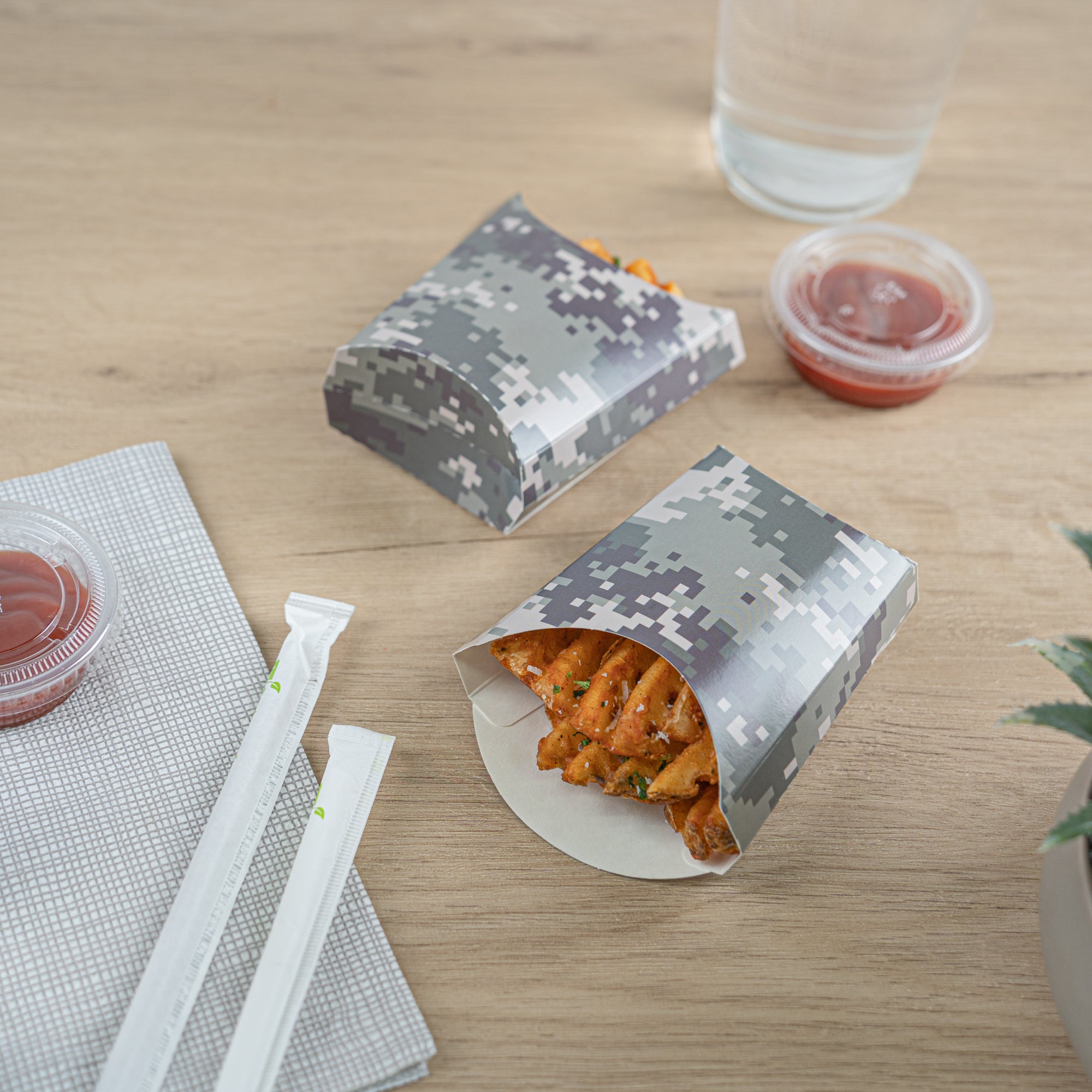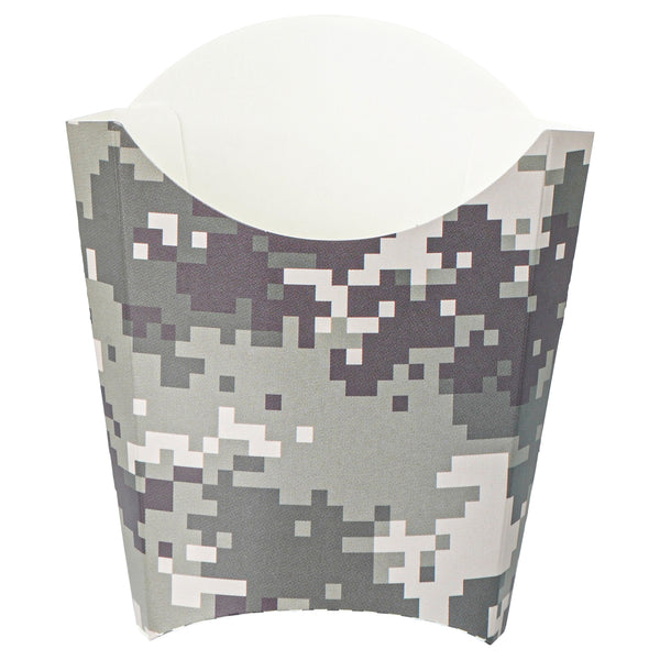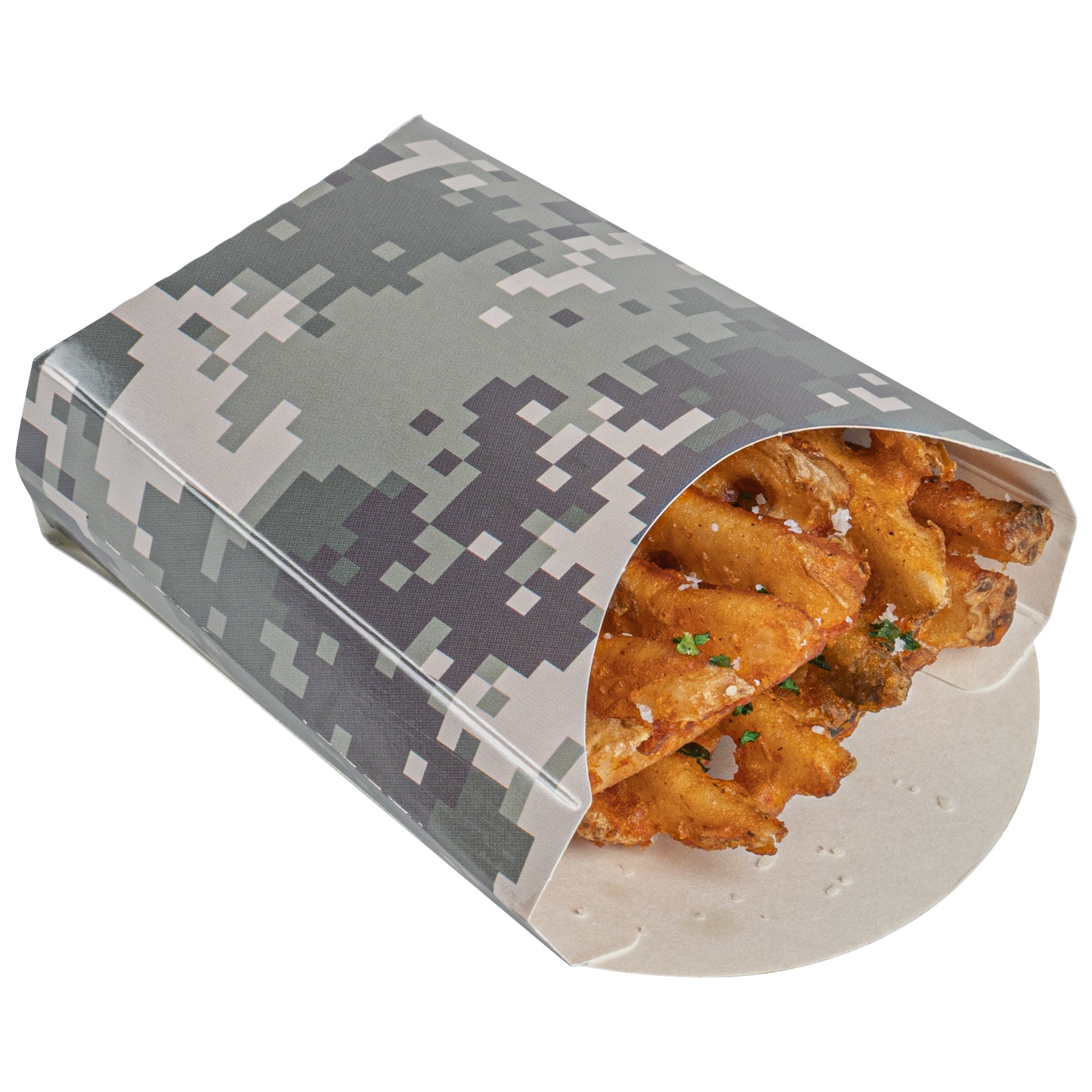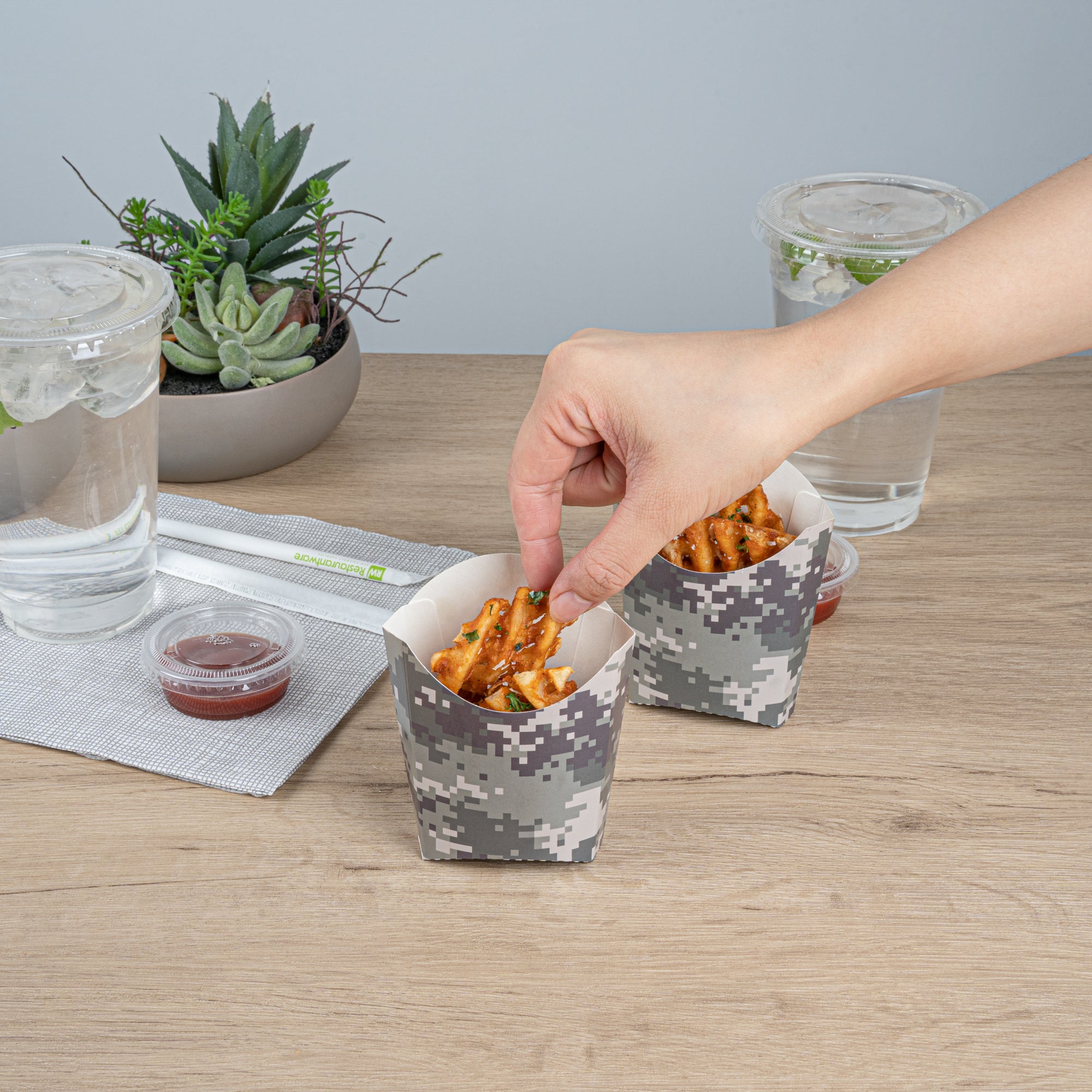 Fill our Bio Tek Camouflage Paper Fry Cups / Snack Containers with delicious fries easily. With a greaseproof lining, these fry cups do an excellent job in preventing oils from staining. Thanks to the angled rim, these fry serving cups can scoop fries directly into the container. Crafted from sturdy paper, these fry holders provide customers with an effortless way to carry hot snacks on the go. Decked in a cool camouflage print, these paper cups enhance your snack-serving fashion quotient. These fry cups are easily stackable, saving valuable storage space and are recyclable, ensuring a straightforward, green cleanup. Every 2-ounce cup is 2.75 inches wide by 3.5 inches tall. Shipped in a 100 count box.