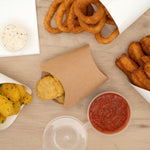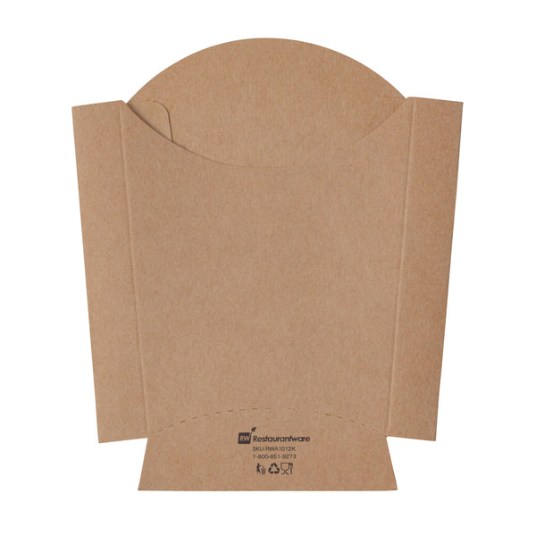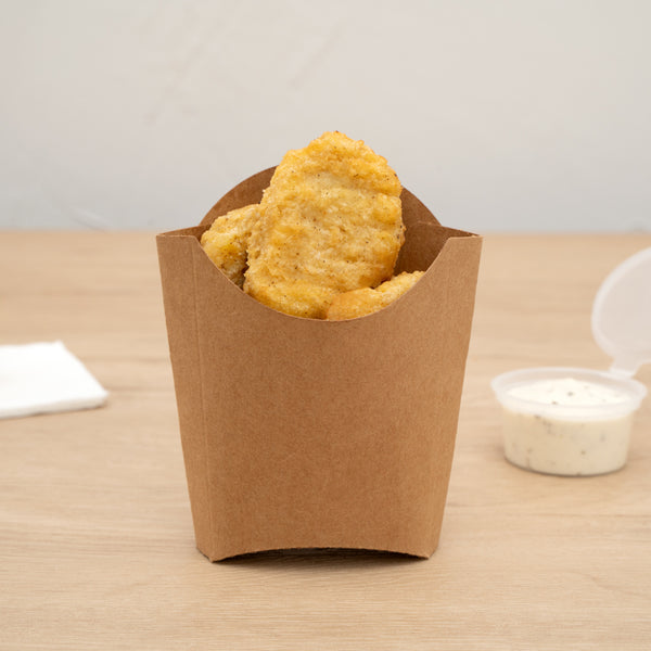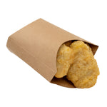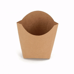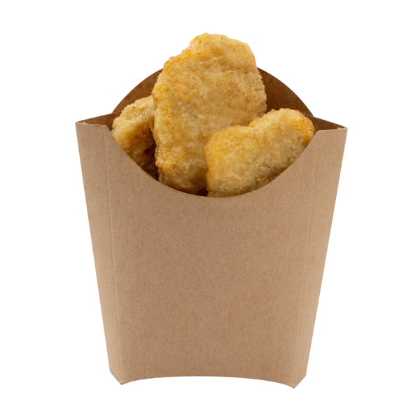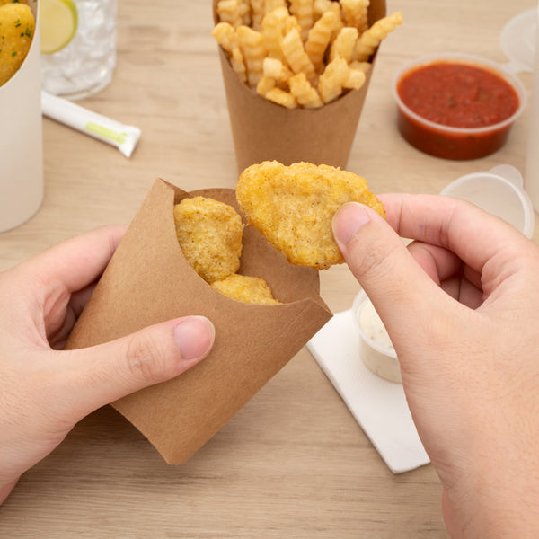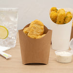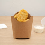 Our Bio Tek Kraft Paper Fry Cups / Snack Containers make it super easy to serve flavorful fries. With a greaseproof lining, these fry cups proficiently restrict oil seepage, keeping everything clean. They come with an angled rim, enabling direct scoping of fries into the cup. Made from sturdy paper, these fry scoops are convenient for customers to carry delectable hot nibbles on the go. Displaying an earthy, kraft finish, these paper cups enhance your snack presentation with a subtle sophistication. Added to that, these fry cups are stackable, optimizing your storage area, and single-use for quick cleanup. Each 2-ounce cup is 4 inches long by 2.75 inches wide by 3.5 inches tall. Sold in a 100 count box.