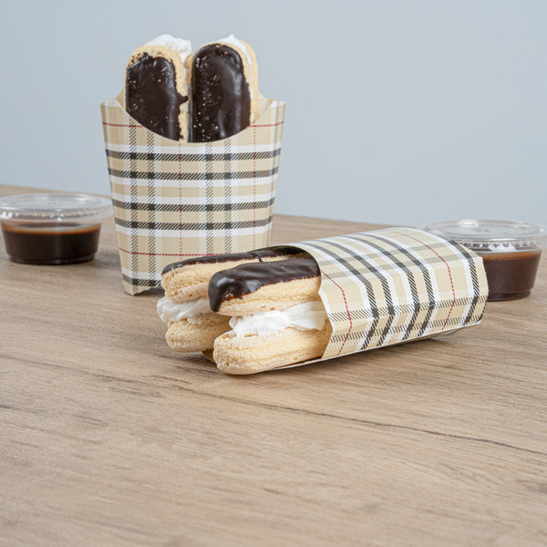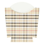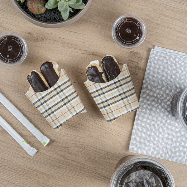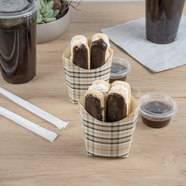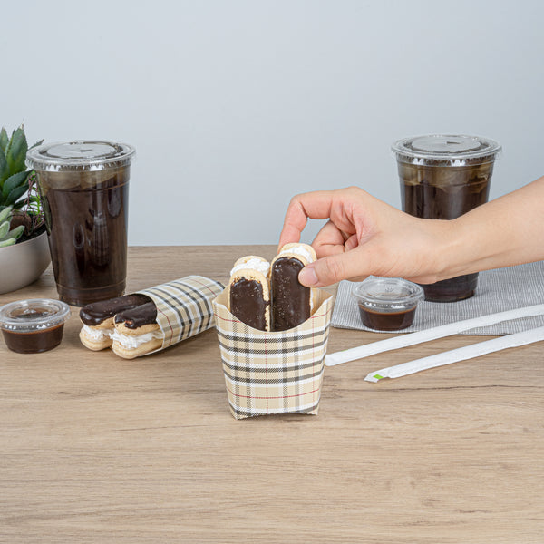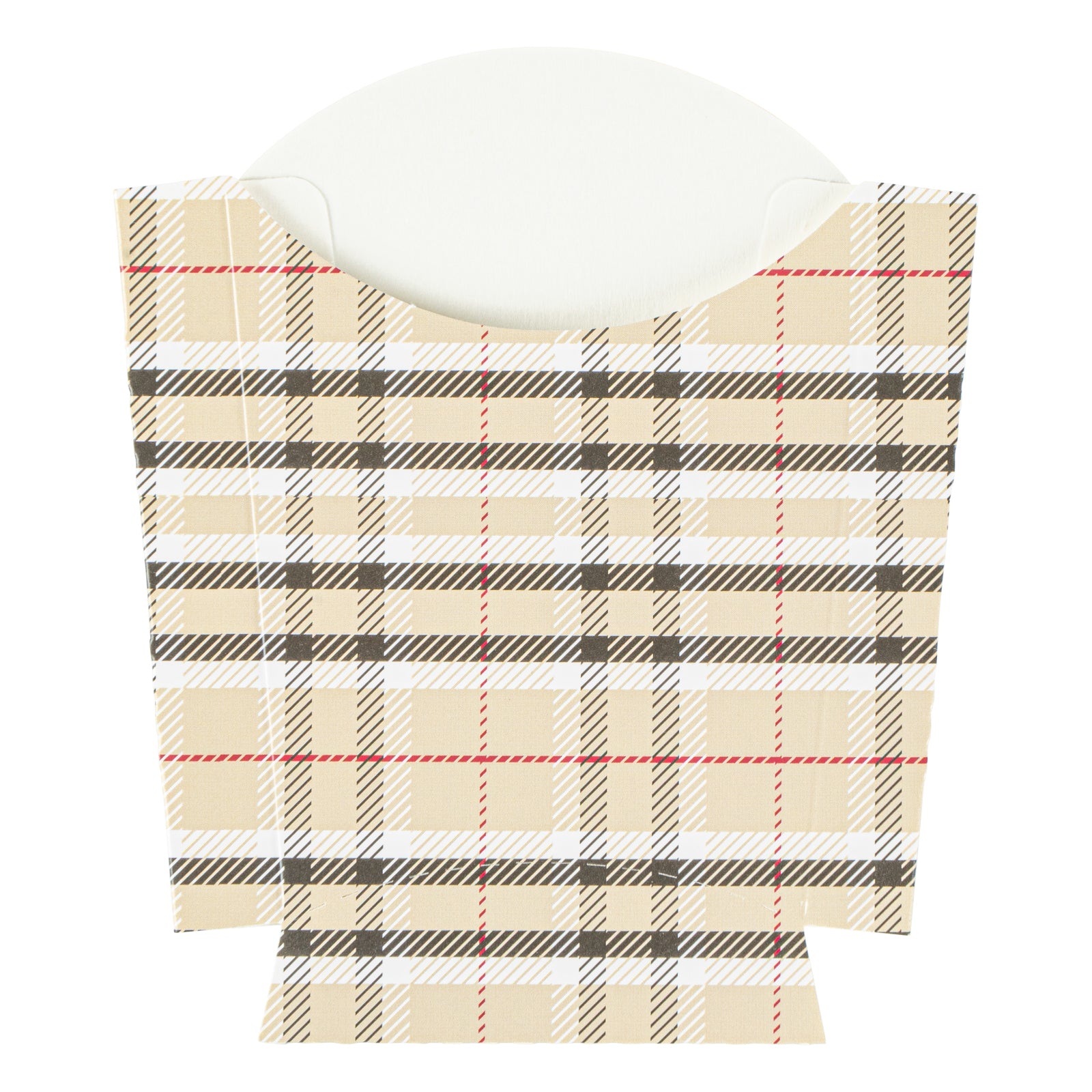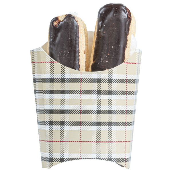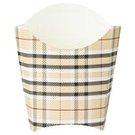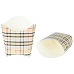 Load our Bio Tek Plaid Paper Fry Cups / Snack Containers with scrumptious fries with no effort. These cups come with a greaseproof lining to effectively keep oil at bay, avoiding unsightly splotches. Featuring an angled rim, these fry cups are strategically designed for straight-away scoping of fries. The sturdy paper material makes these fry scoops ideal for customers taking away hot snacks. Showcasing a trendy plaid pattern, these paper cups give your presentation a stylish twist. Every fry cup comes stackable to economize your storage space and they're disposable for a swift cleanup. Each 2-ounce cup is 4 inches long by 2.75 inches wide by 3.5 inches tall. Sold in a 100 count box.
