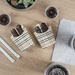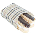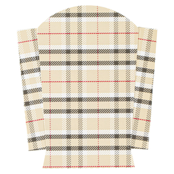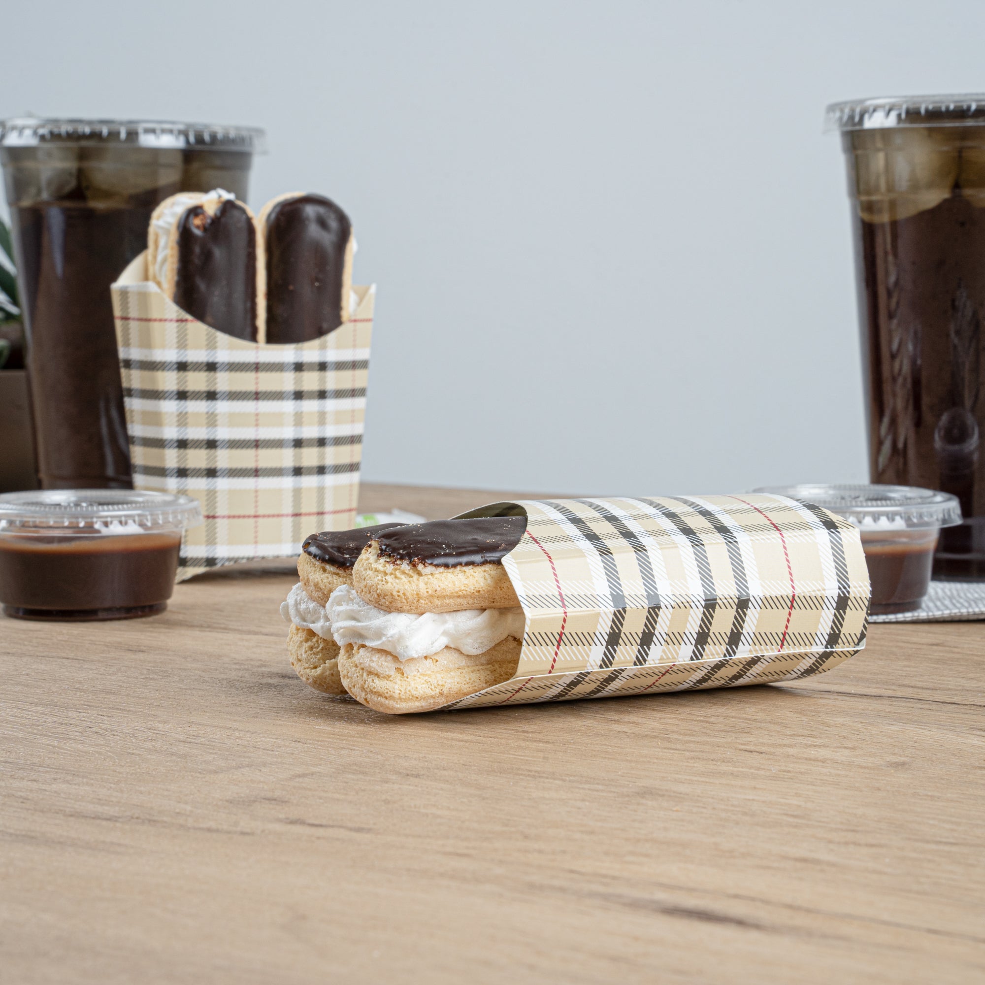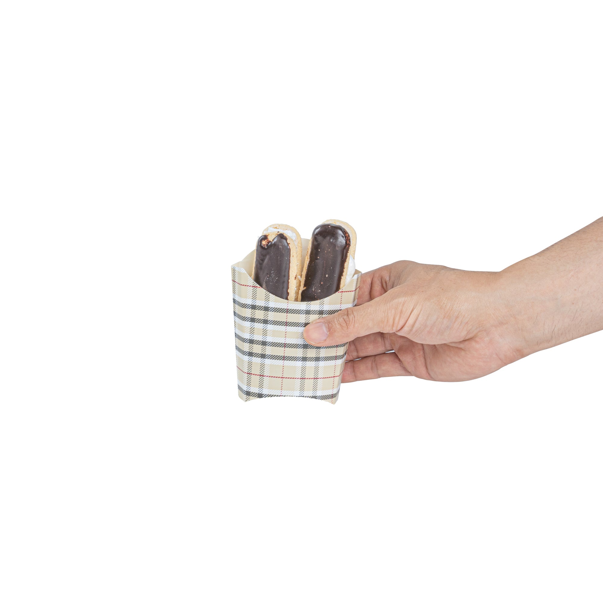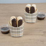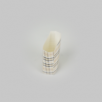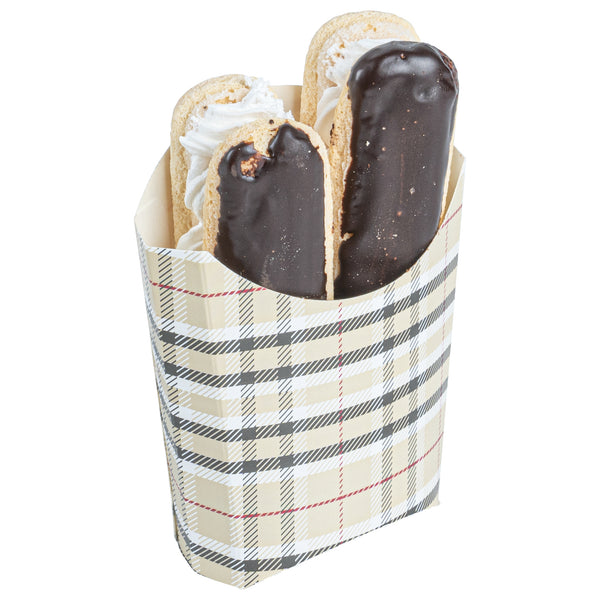 Load our Bio Tek Plaid Paper Fry Cups / Snack Containers with scrumptious fries with no effort. These cups come with a greaseproof lining to effectively keep oil at bay, avoiding unsightly splotches. Featuring an angled rim, these fry cups are strategically designed for straight-away scoping of fries. The sturdy paper material makes these fry scoops ideal for customers taking away hot snacks. Showcasing a trendy plaid pattern, these paper cups give your presentation a stylish twist. Every fry cup comes stackable to economize your storage space and they're disposable for a swift cleanup. Each 2-ounce cup is 4 inches long by 2.75 inches wide by 3.5 inches tall. Sold in a 100 count box.