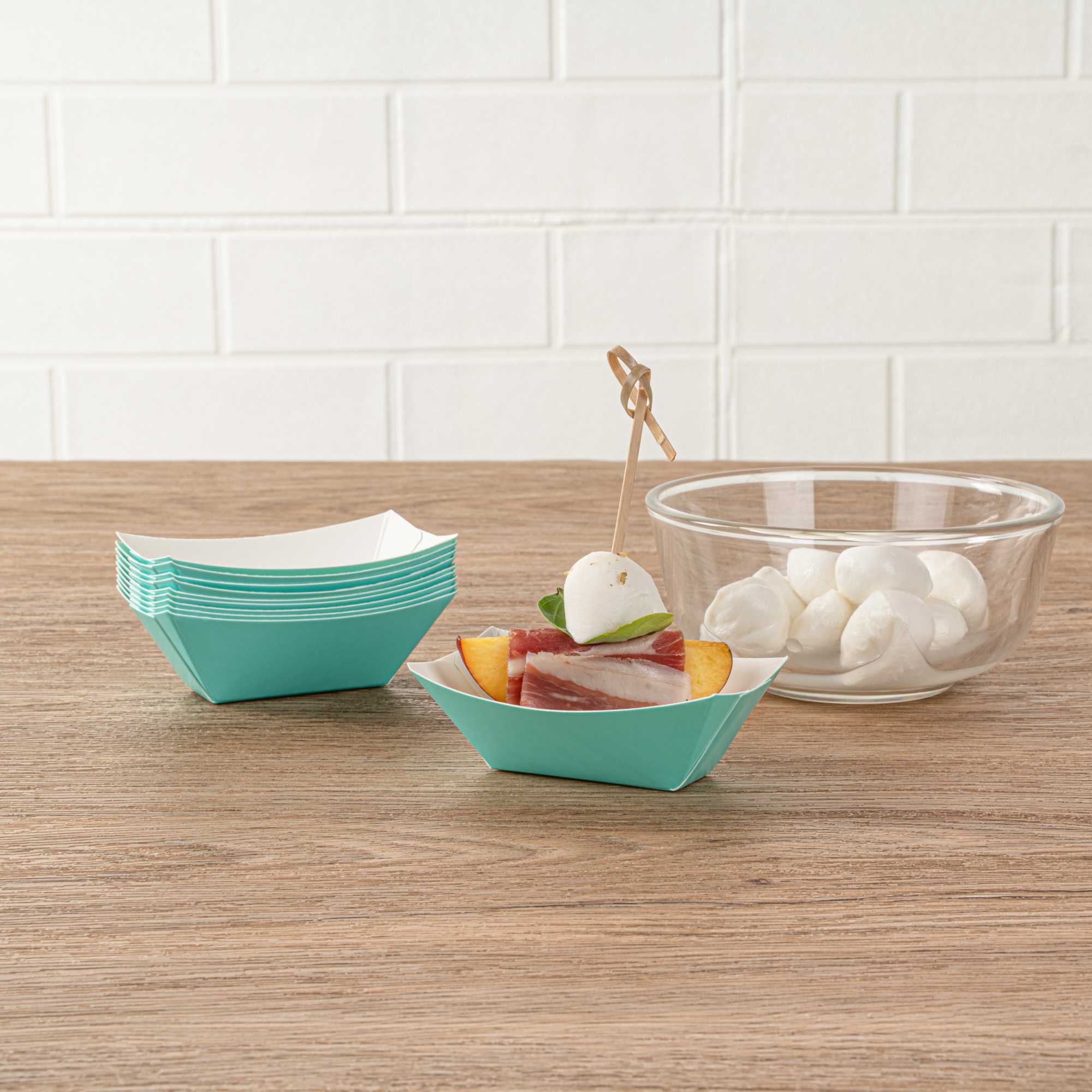Showcase your delicious treats with our Bio Tek 2-ounce Turquoise Paper Food Tray / Boats. Engineered with a greaseproof body, these disposable boats deal adeptly with greasy foods, avoiding any sogginess. To simplify the post-meal cleanup routine, these paper food boats are disposable. These food baskets have an eye-catching turquoise scheme that enhances miniature treats and amplifies your presentation. The easy-to-stack design of these paper boats ensures efficient storage. Measuring 3.25 inches long by 2.25 inches wide by 1.25 inches tall, these snack boats are ideal for serving small bites. Shipped in a 400 count box.