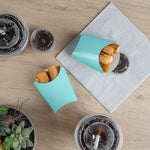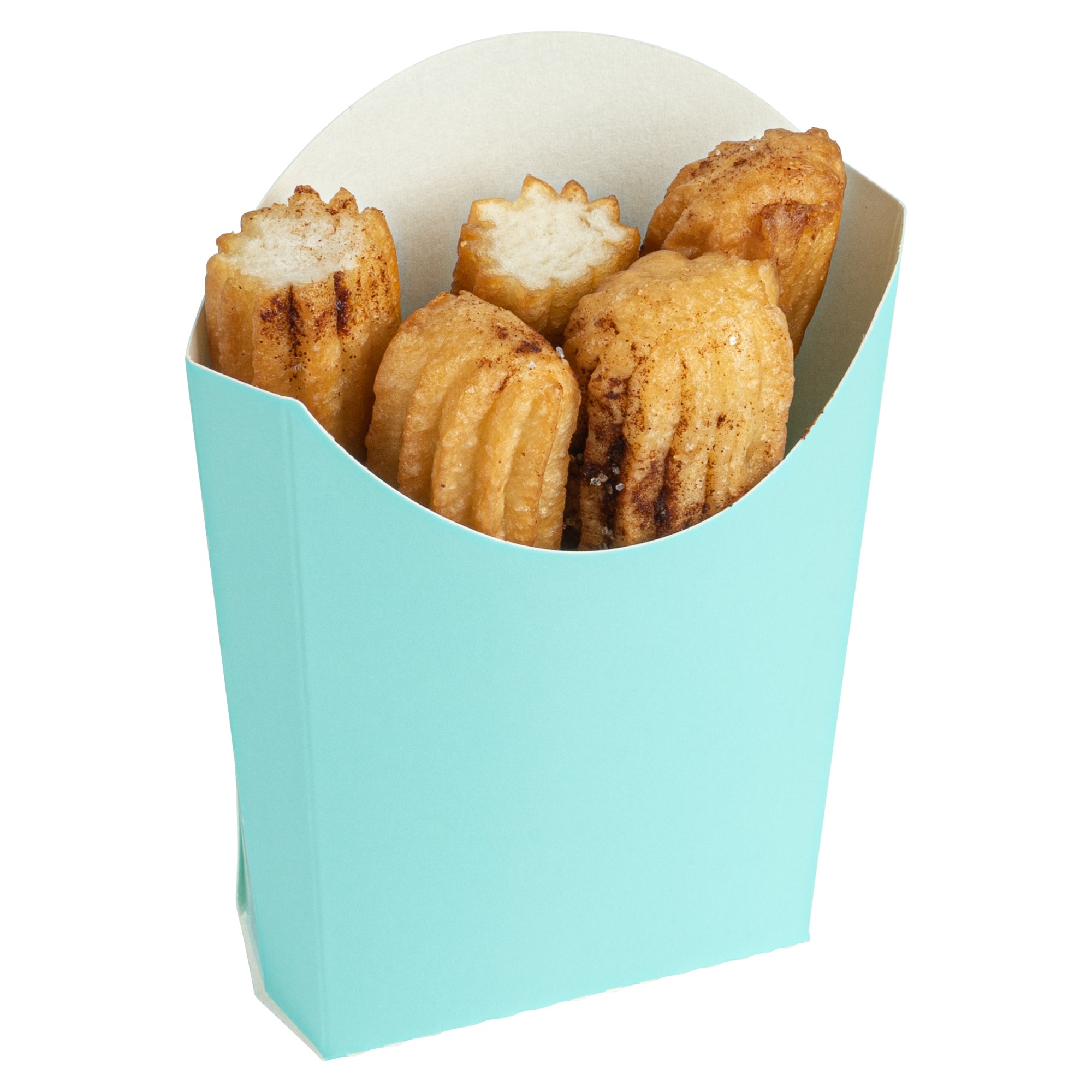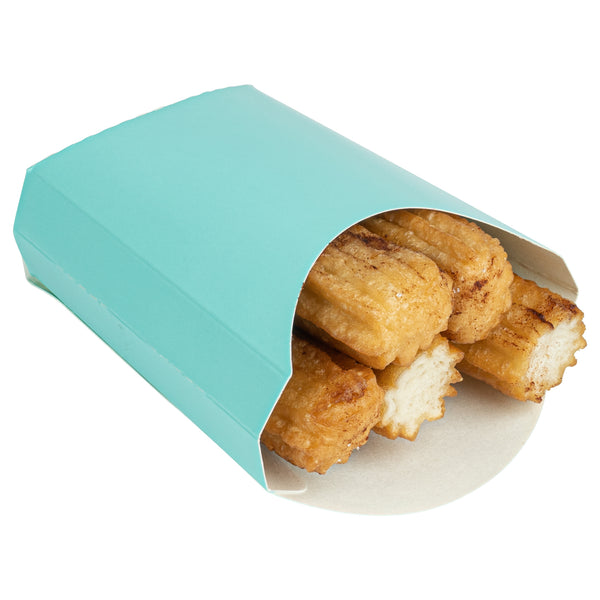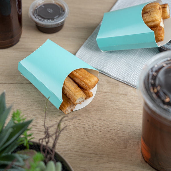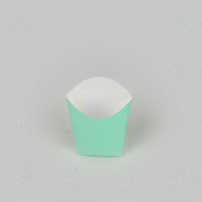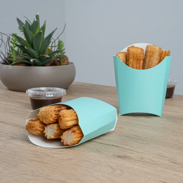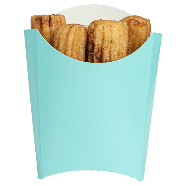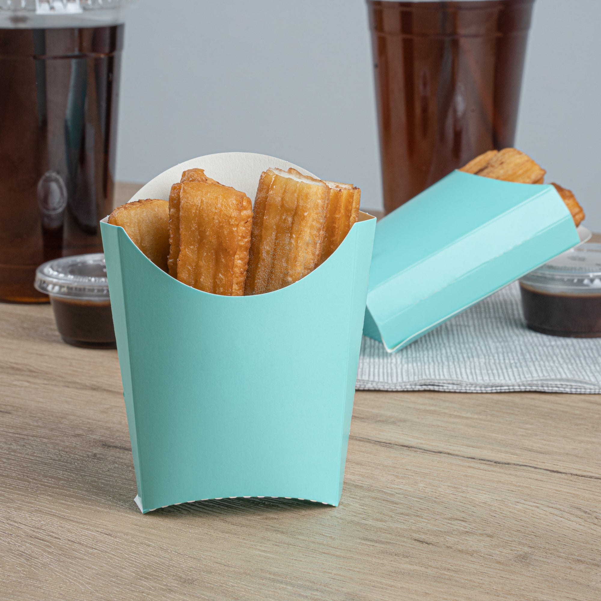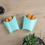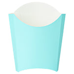 Conveniently pour delicious fries into our Bio Tek Turquoise Paper Fry Cups / Snack Containers. These fries cups feature a greaseproof lining, keeping oils from soaking through and causing stains. Designed with an angled rim, these fry holders adeptly scoop fries right into your cup. Made from robust paper, these fry scoops are perfect for customers to carry their hot, quick snacks on the go. Adorned with a vibrant turquoise color, these paper cups uplift your snack serve ware’s style quotient. These saving-space fry cups are stackable and, for easy and eco-friendly clean-up, they’re also recyclable. Each 2-ounce cup measures 4 inches long by 2.75 inches wide by 3.5 inches tall. Sold in a 100 count box.
