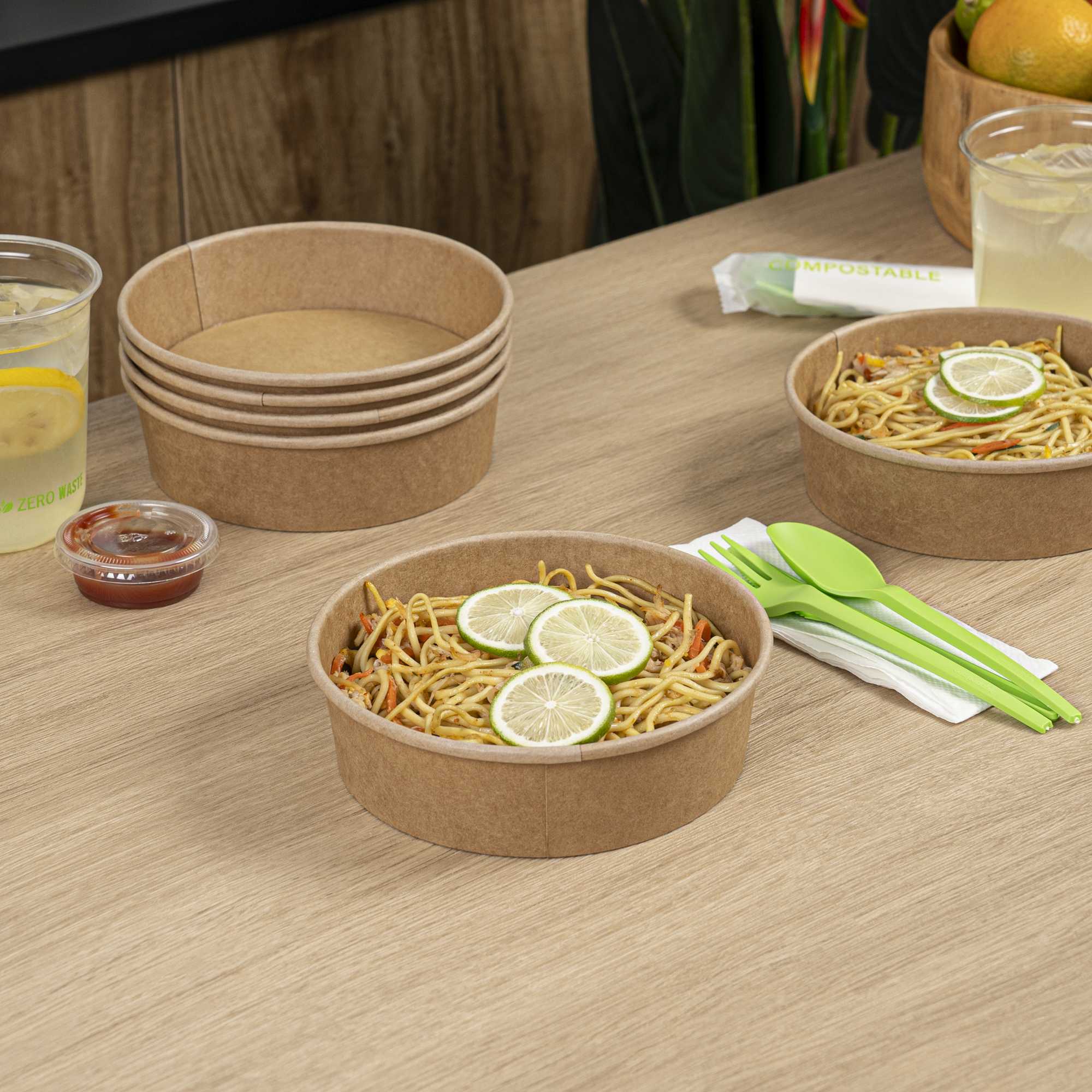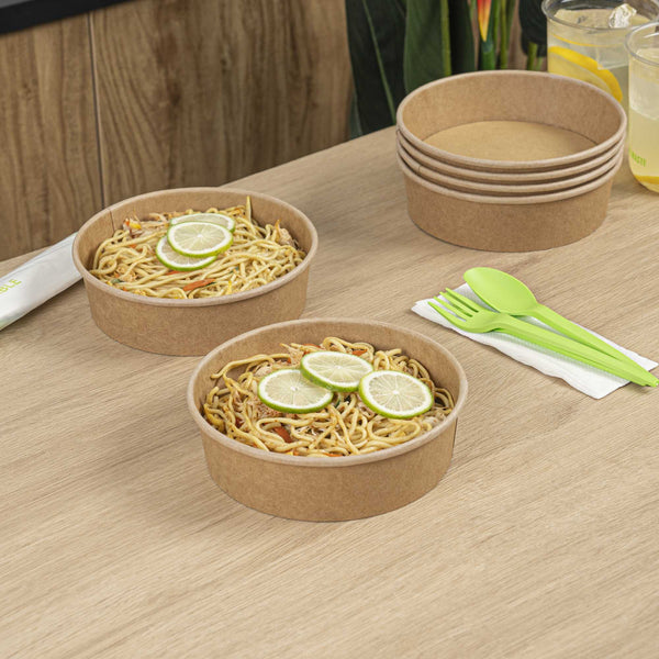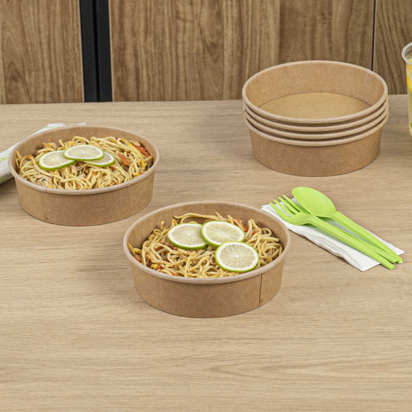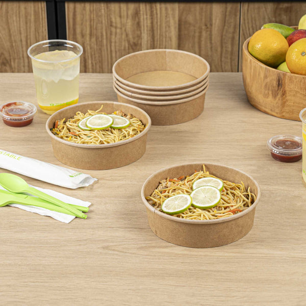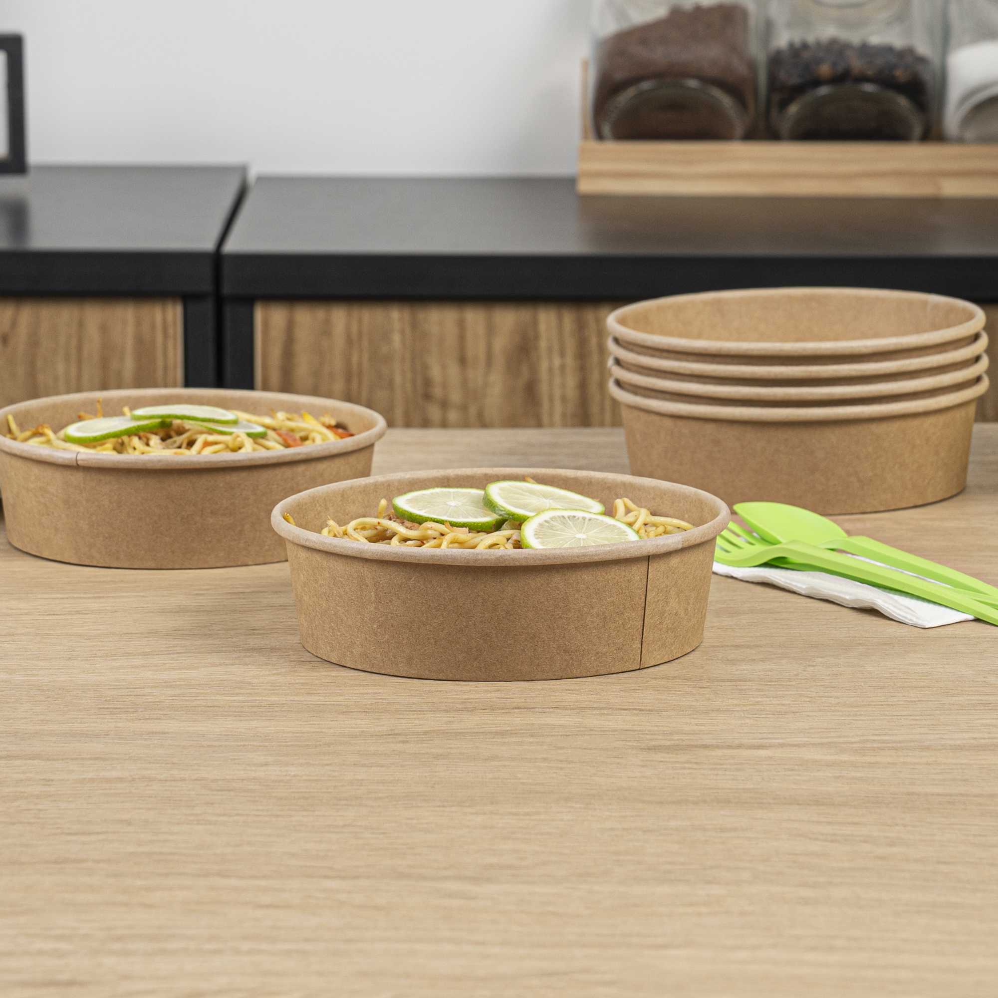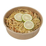 Enhance your foodservice experience with our Bio Tek 22-ounce Round Kraft Paper Take Out Containers. Pair these takeaway containers with their coordinating plastic lids (SKU: RWA1437C-50) to protect your culinary creations in transit. The grease-resistant design of these take out boxes prevents sauces from soaking through and ensures a neat food presentation. These take out food containers have a PP lining, making them microwave-safe and capable of withstanding high temperatures up to 248F, offering unmatched versatility. Made from thick kraft paper, these to go containers are suitable for holding various hot and cold food items. The rustic kraft finish of these carry out containers creates a charming look for your take out orders. These recyclable food containers and suitable for foodservice establishments looking for eco-conscious food packaging solutions. Designed for convenience, these disposable food containers can be disposed of after use for an easy cleaning experience. These disposable take out boxes measure 6.5 inches in diameter by 1.75 inches in height and can hold up to 22 ounces. Sold in a 50 count box. Lids are available and sold separately.