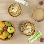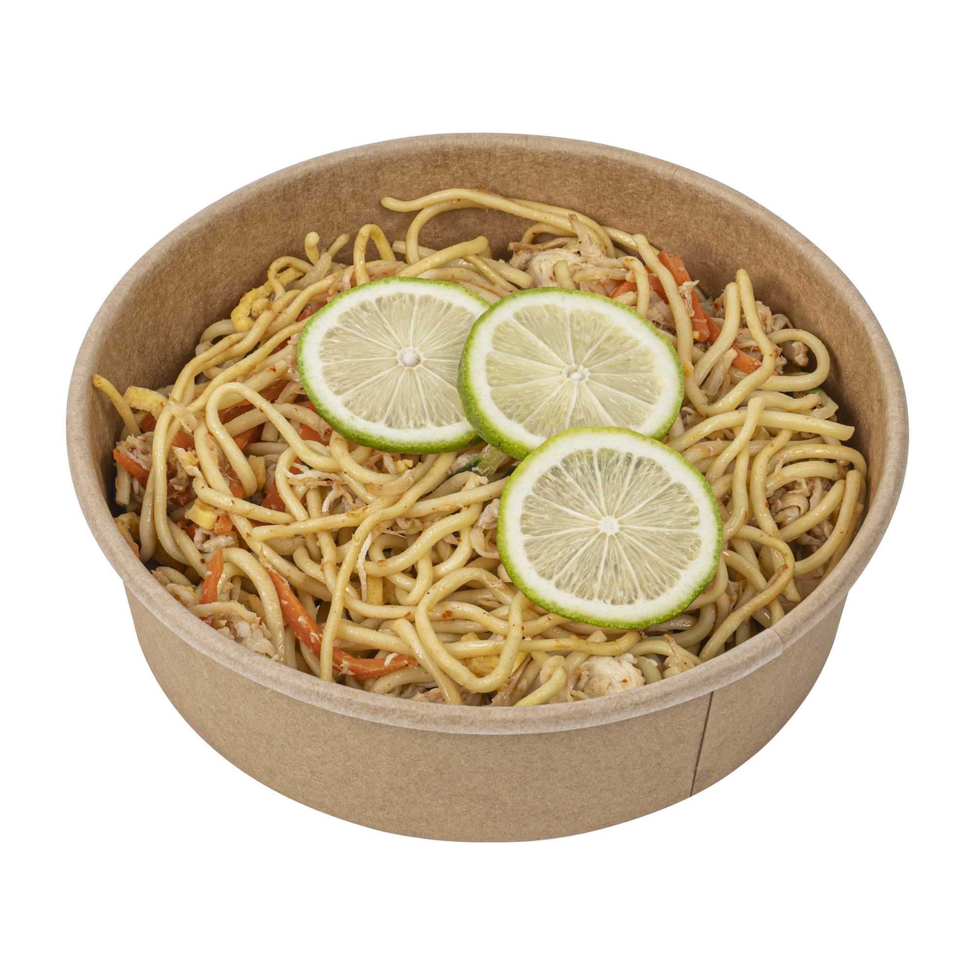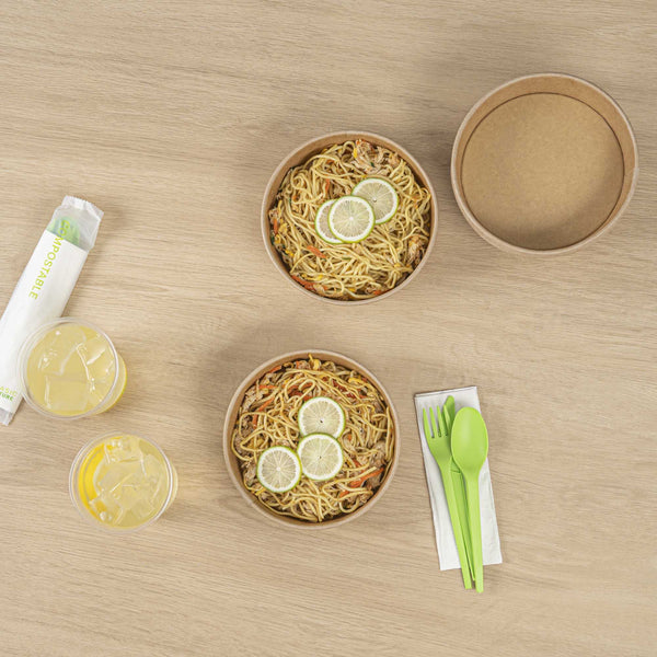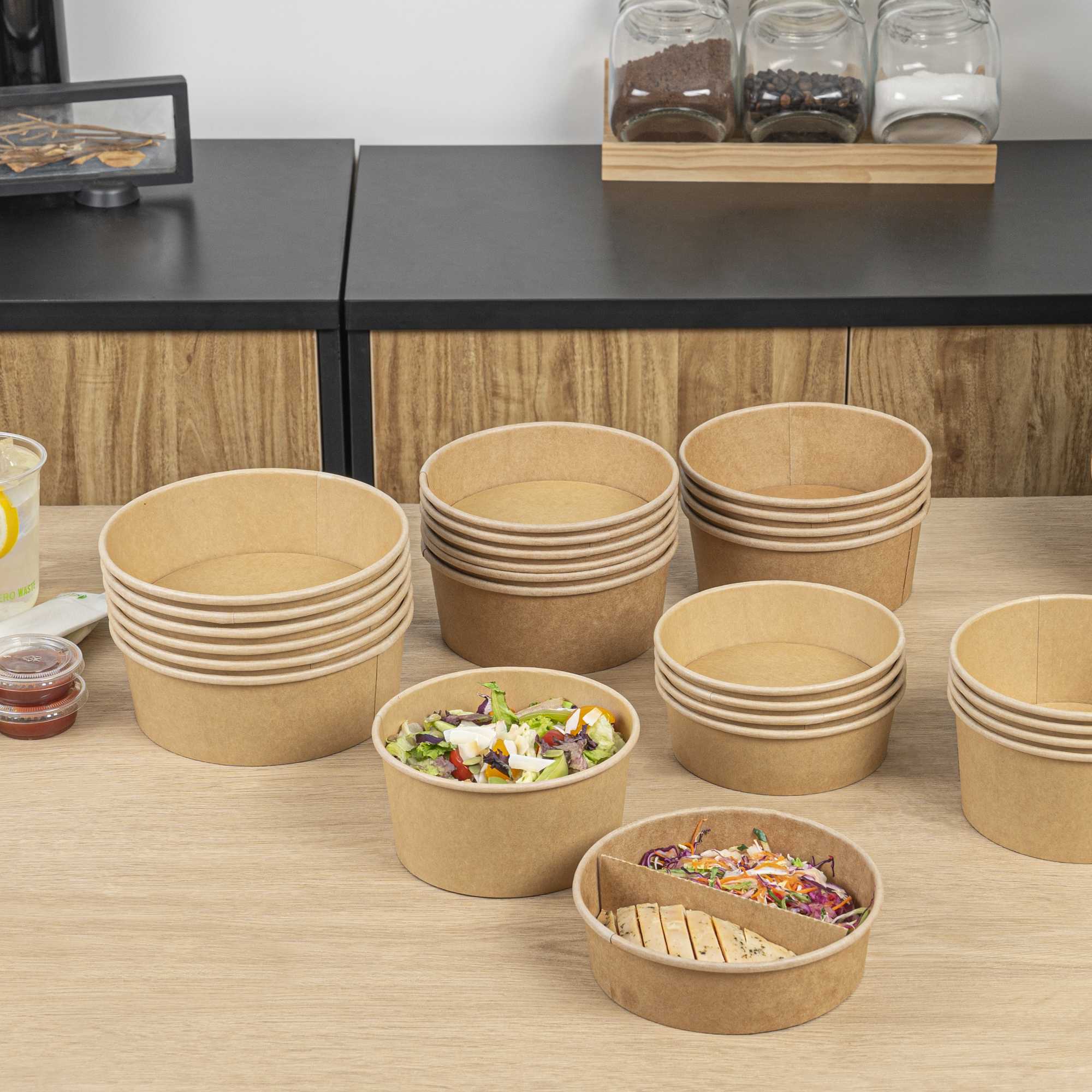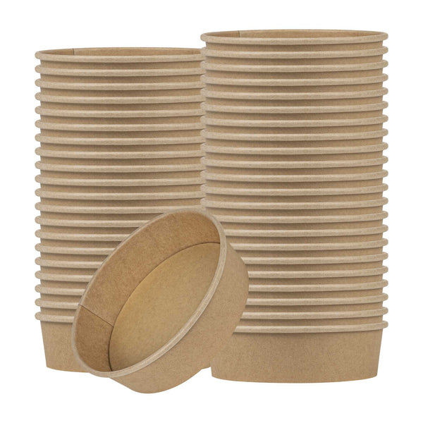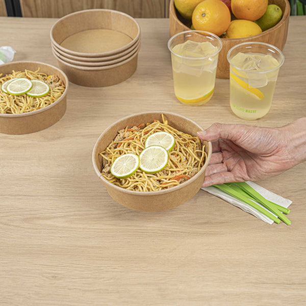 Enhance your foodservice experience with our Bio Tek 22-ounce Round Kraft Paper Take Out Containers. Pair these takeaway containers with their coordinating plastic lids (SKU: RWA1437C-50) to protect your culinary creations in transit. The grease-resistant design of these take out boxes prevents sauces from soaking through and ensures a neat food presentation. These take out food containers have a PP lining, making them microwave-safe and capable of withstanding high temperatures up to 248F, offering unmatched versatility. Made from thick kraft paper, these to go containers are suitable for holding various hot and cold food items. The rustic kraft finish of these carry out containers creates a charming look for your take out orders. These recyclable food containers and suitable for foodservice establishments looking for eco-conscious food packaging solutions. Designed for convenience, these disposable food containers can be disposed of after use for an easy cleaning experience. These disposable take out boxes measure 6.5 inches in diameter by 1.75 inches in height and can hold up to 22 ounces. Sold in a 50 count box. Lids are available and sold separately.