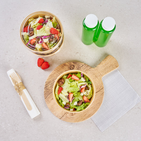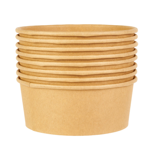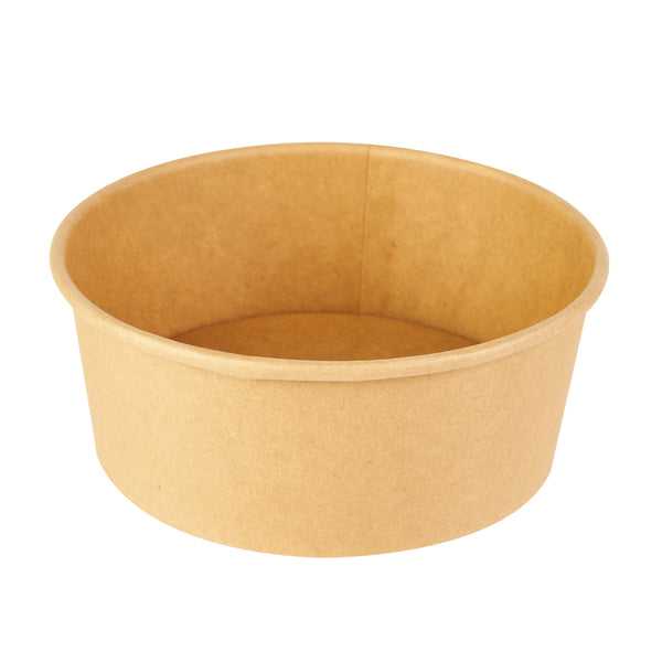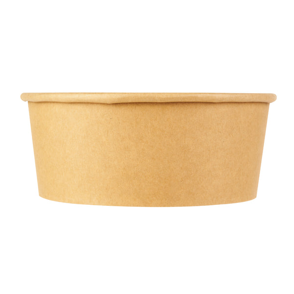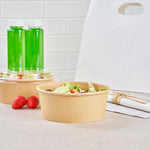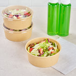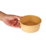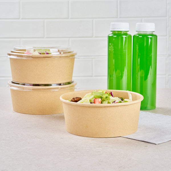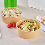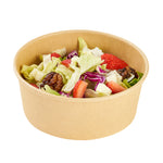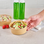 Serve up crisp salads on the go with the Bio Tek 25-ounce Round Kraft Paper Salad Containers. Constructed from kraft paper, these disposable take out boxes boast premium durability. Pair these paper take out boxes with their coordinating lids (SKU: RWA0347) to streamline delivery service at foodservice establishments. Equipped with a PP lining, these to go containers are heat-resistant and microwave-safe to easily reheat your meals. These carry out containers prevent dressings and sauces from soaking through. Holding up to 25 ounces, these paper boxes provide ample space for culinary creations. The round shape and the kraft brown finish of these takeaway containers display salads, poke bowls, and fresh fare appealingly. These takeaway boxes for food are disposable to provide a sustainable and easy cleanup after service hours. Each food container measures 6 inches in diameter by 2.5 inches in height. Sold in a 200 count box. Lids and containers are sold separately.