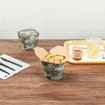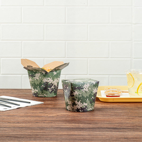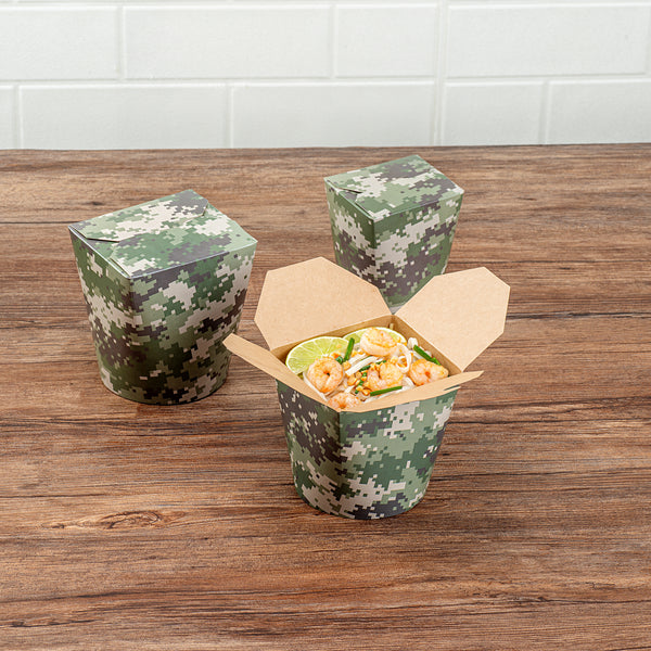 Experience the convenience of takeaway with our Bio Tek 26-ounce Round Camouflage Paper Round Noodle Take Out Containers. Engineered for structural durability, these takeaway containers are manufactured from premium paper and are adept at holding both hot and cold foods. The grease-resistant PE lining of these carry out containers prevents unsightly leaks, ensuring fresh and appetizing food. These paper take out boxes have a unique tab lock design that provides secure transportation, avoiding spills and messes. The camouflage print of these disposable take out boxes adds a touch of style to food presentation. These takeaway boxes for food are conveniently disposable to ensure a breezy cleanup and are perfect for restaurants, food trucks, or personal outdoor events. Each takeaway food container can hold up to 26 ounces and measure 4 inches in length by 3.5 inches in width by 3.75 inches in height. Shipped in a 200 count box.