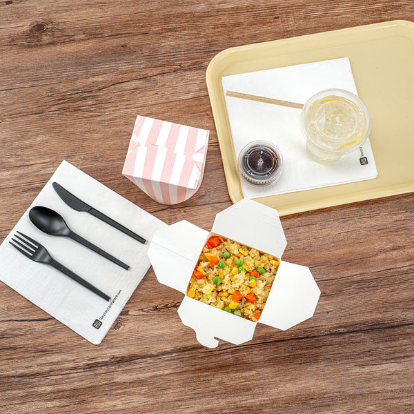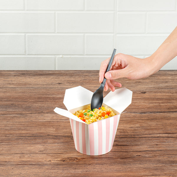 These takeaway boxes are made from thick paper and can easily hold hot and cold foods. Ideal for packing lunches for work!