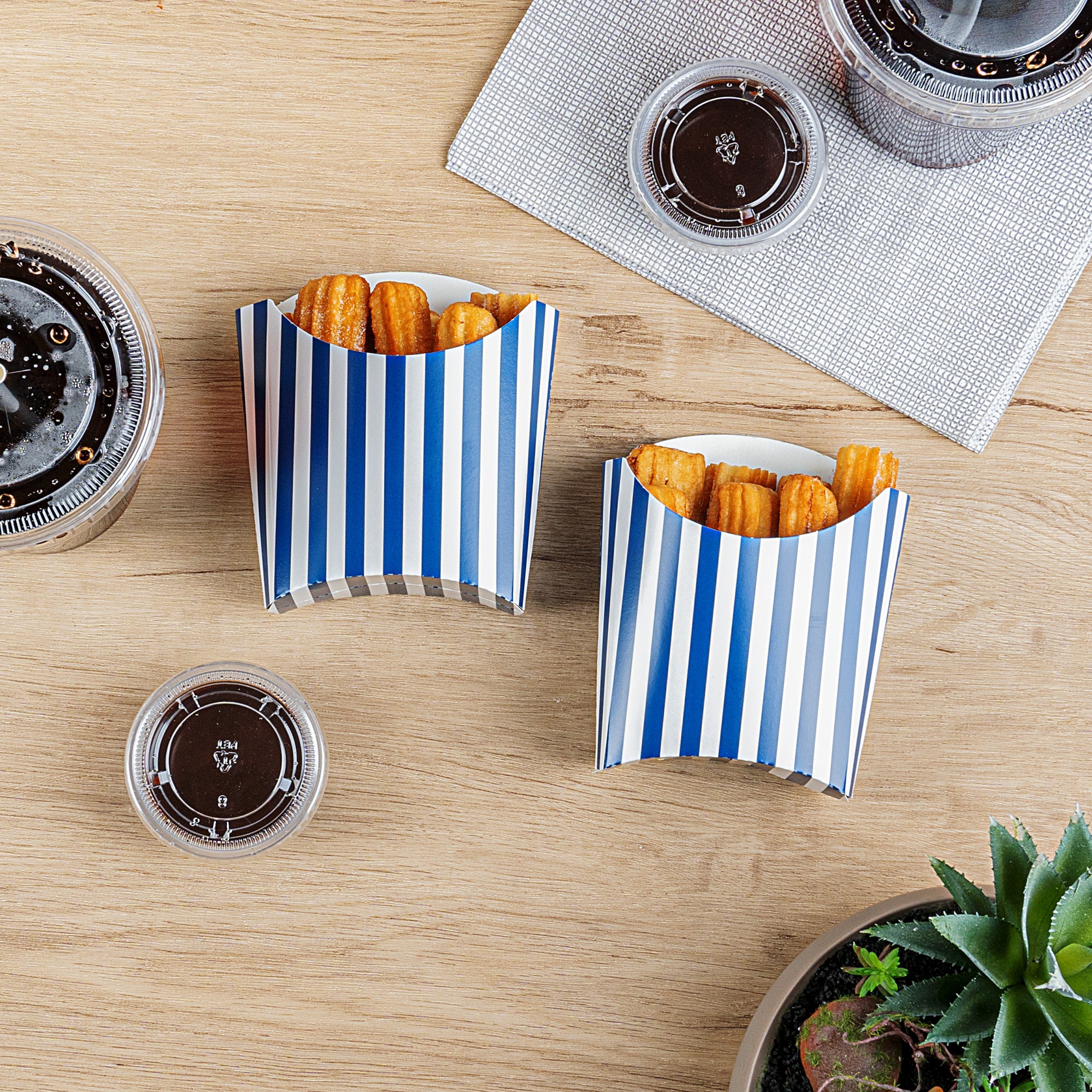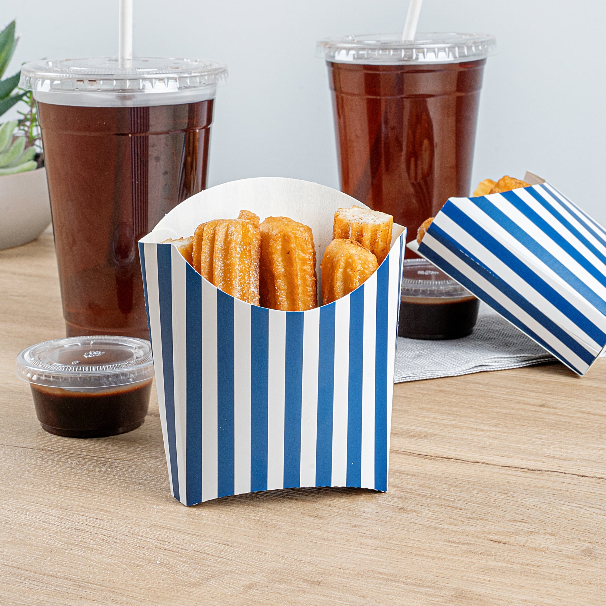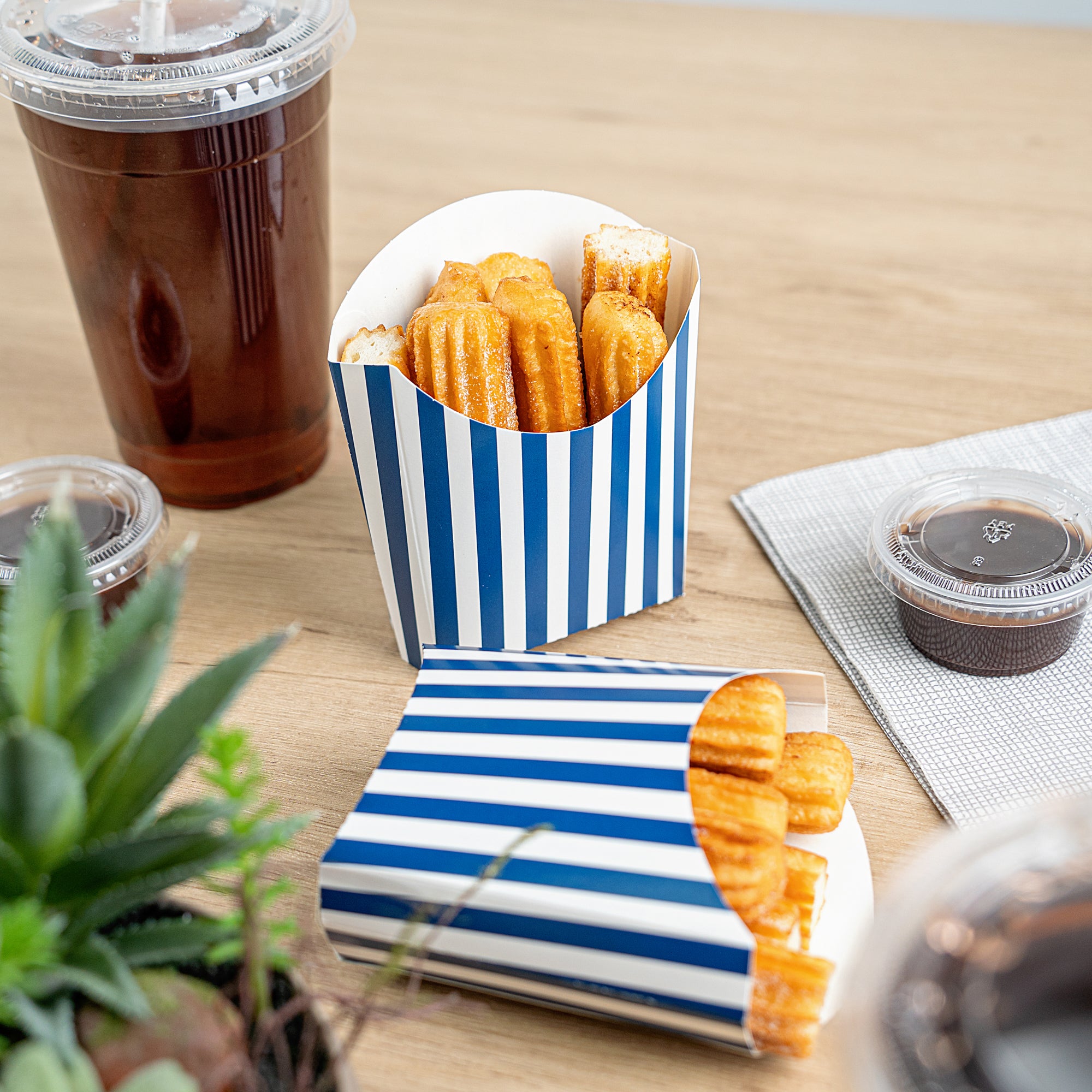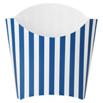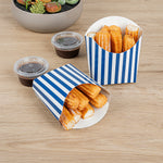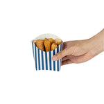 The Bio Tek Blue and White Stripe Paper Fry Cups / Snack Containers offer an attractive and mess-free way to serve snacks on the go. Featuring a greaseproof lining, these fry scoops keep oil leaks in check. Their wide, angled rim design allows for easy scoping of fries or filling with a fry scooper, reducing the chance of spills. Made from top-quality paper, these cups protect hands from the heat of hot snacks. The blue and white striped pattern adds a trendy touch to your snack presentation. These paper scoop cups optimize storage space as they are stackable and disposable for simple cleanup. Each 3-ounce cup measures 4.5 inches long by 3.25 inches wide by 3.75 inches tall. Sold in a 100 count box.