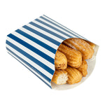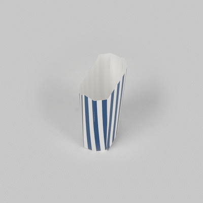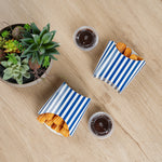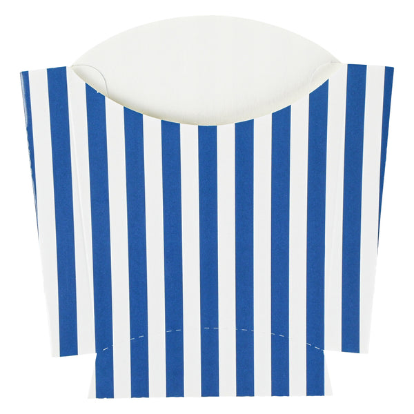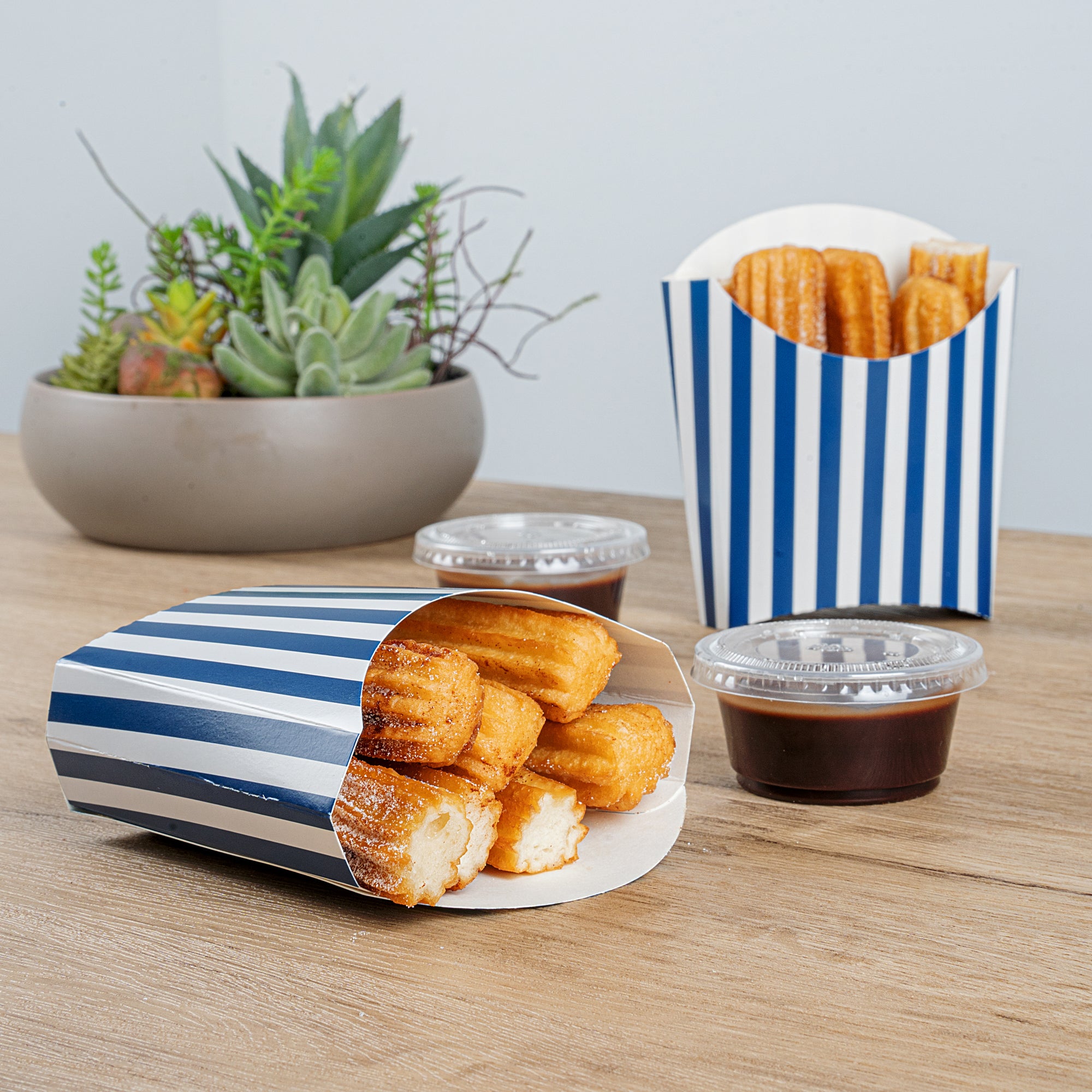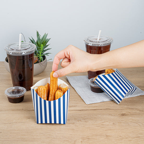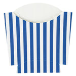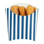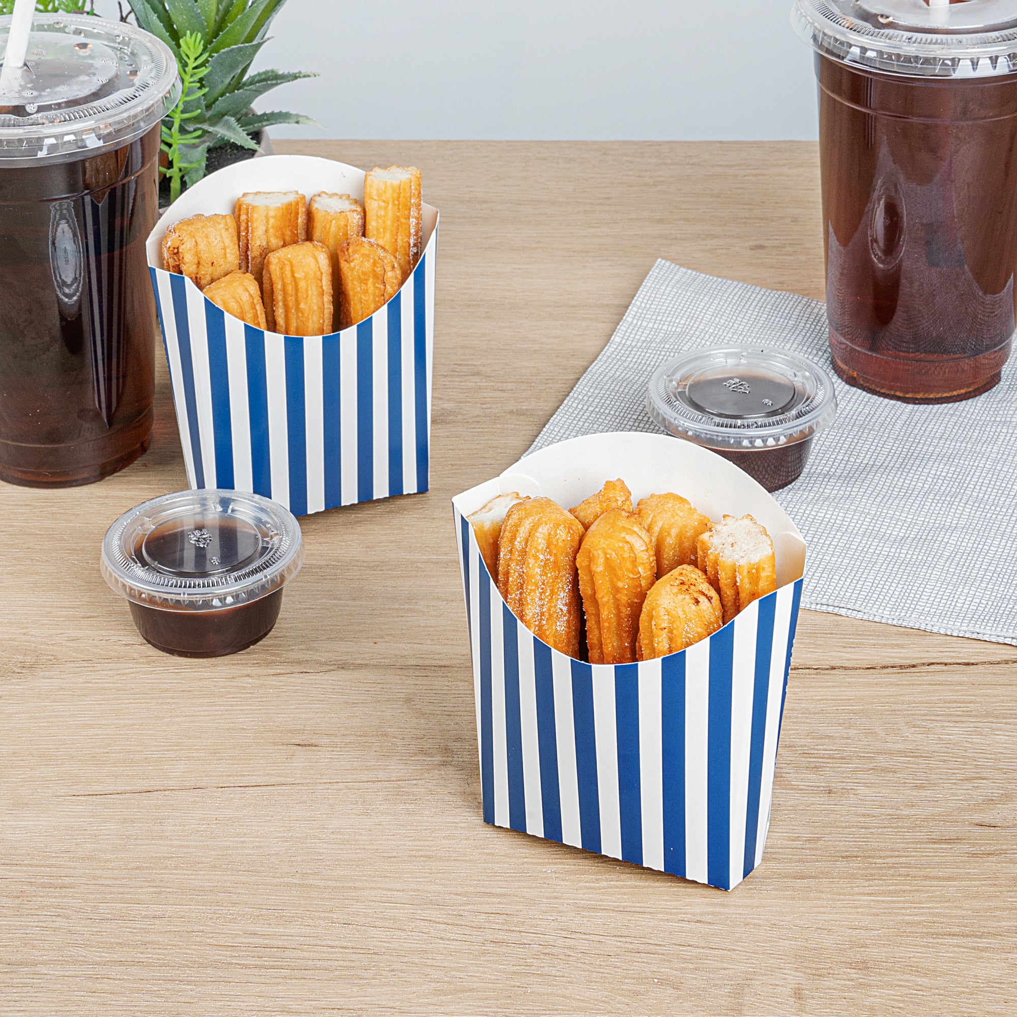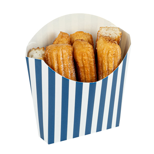 The Bio Tek Blue and White Stripe Paper Fry Cups / Snack Containers offer an attractive and mess-free way to serve snacks on the go. Featuring a greaseproof lining, these fry scoops keep oil leaks in check. Their wide, angled rim design allows for easy scoping of fries or filling with a fry scooper, reducing the chance of spills. Made from top-quality paper, these cups protect hands from the heat of hot snacks. The blue and white striped pattern adds a trendy touch to your snack presentation. These paper scoop cups optimize storage space as they are stackable and disposable for simple cleanup. Each 3-ounce cup measures 4.5 inches long by 3.25 inches wide by 3.75 inches tall. Sold in a 100 count box.