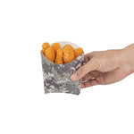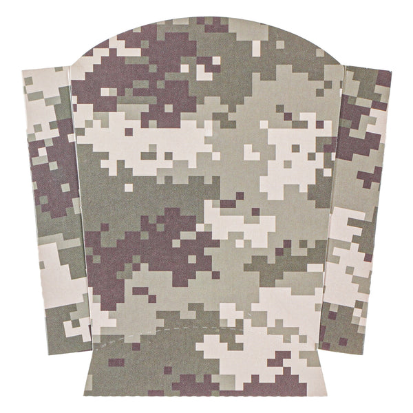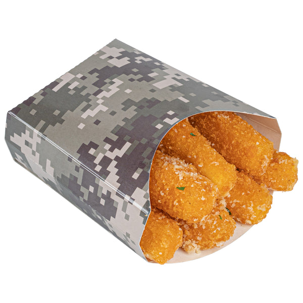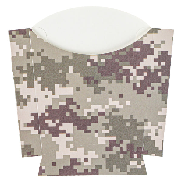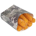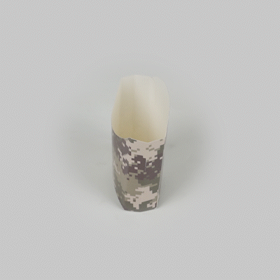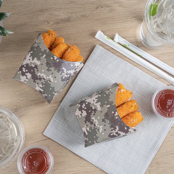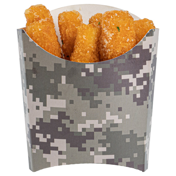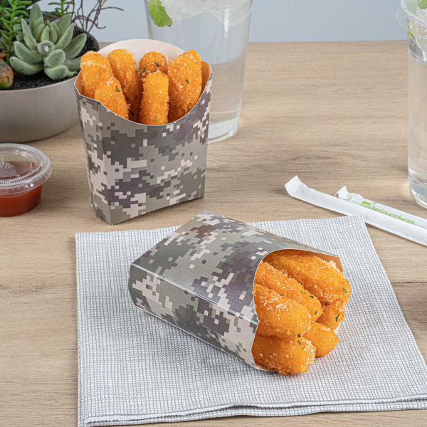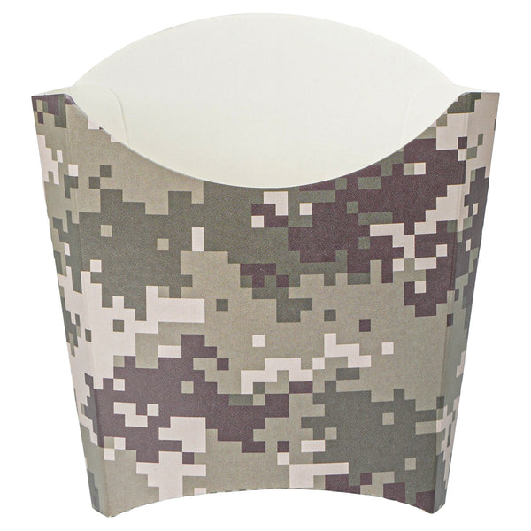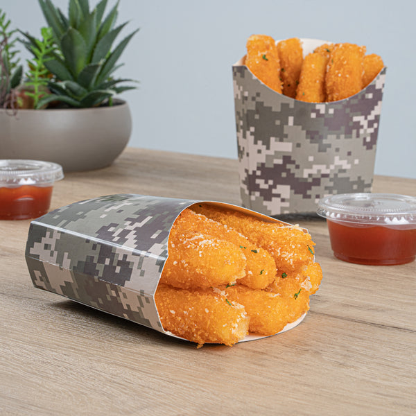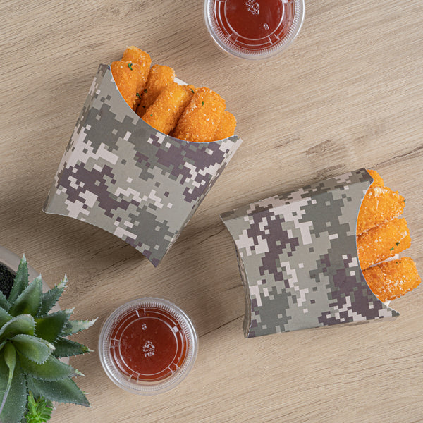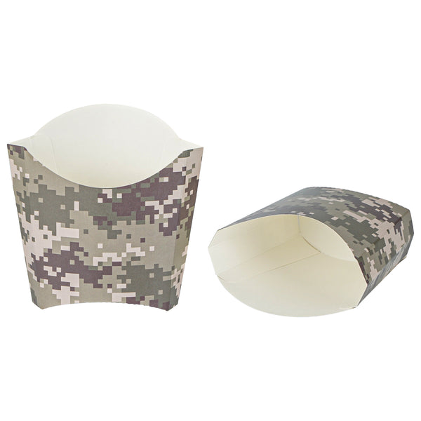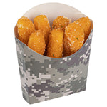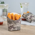 Use our Bio Tek Camouflage Paper Fry Cups / Snack Containers to allow customers to enjoy snacks on the move with style. The greaseproof lining ensures no oil leaks or stains. Designed with a wide, angled rim, these disposable fry holders enable easy scoping or filling of fries with a fry scooper. Made from durable, high-quality paper, these cups protect hands from hot food. The cool camouflage print adds a touch of flair to your presentation. These space-saving paper scoop cups are stackable and disposable for effortless cleanup. Each 3-ounce fry cup measures 4.5 inches long by 3.25 inches wide by 3.75 inches tall. Sold in a 100 count box.