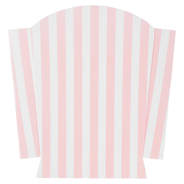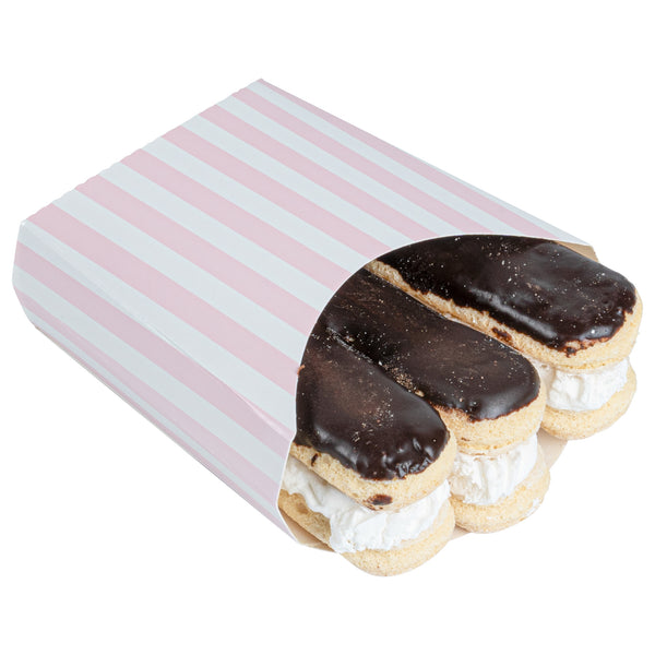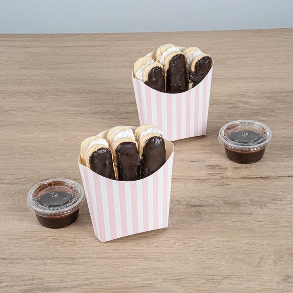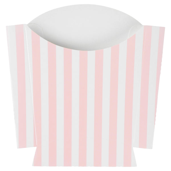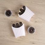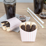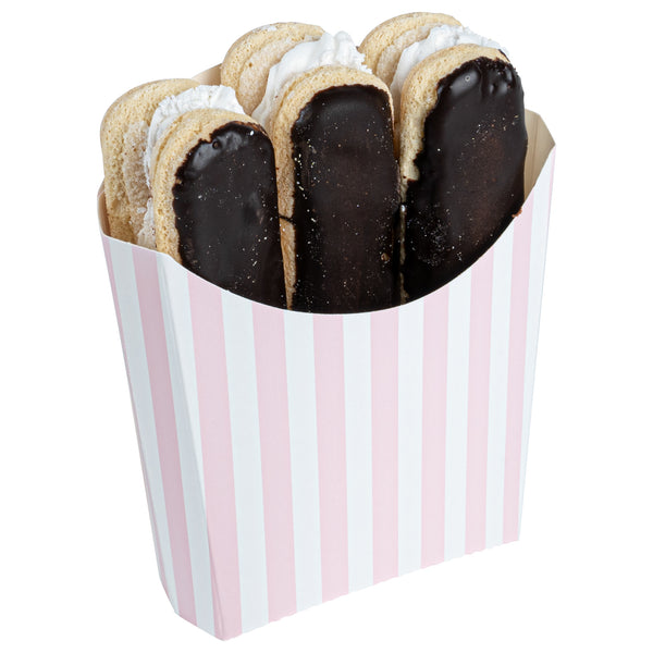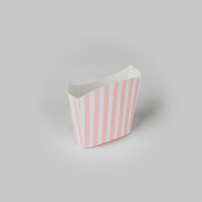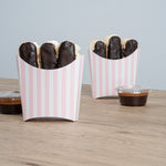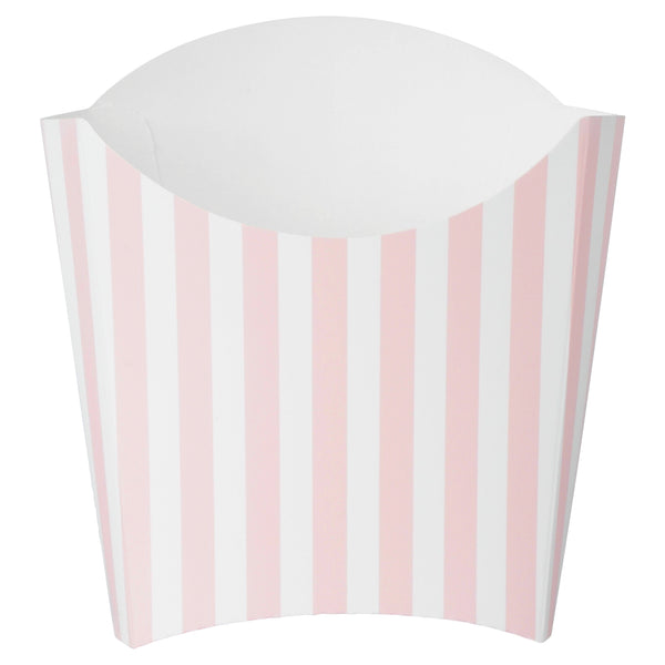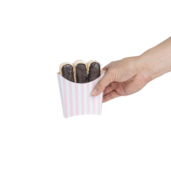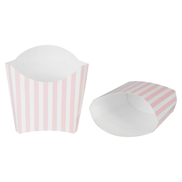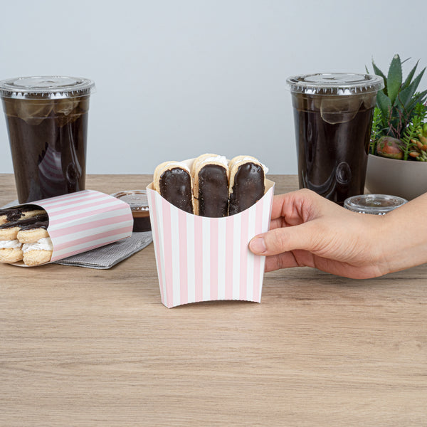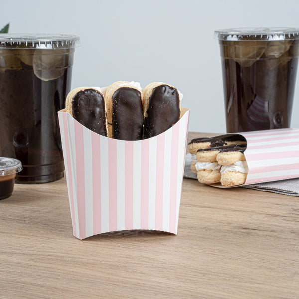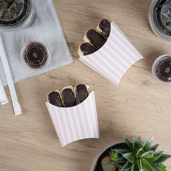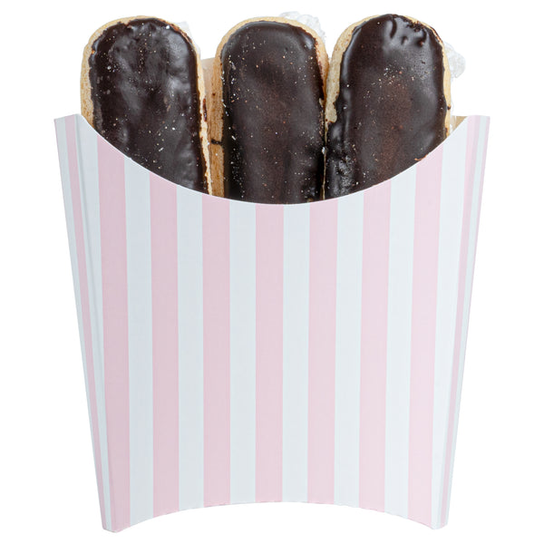 Serve snacks in style with our Bio Tek Pink and White Stripe Paper Fry Cups / Snack Containers. These fry scoops come with a greaseproof lining to efficiently prevent oil leaks. Designed with a wide, angled rim, these fry holders facilitate easy scoping or filling using a fry scooper. Constructed from high-quality paper, these cups shield hands from hot contents. The charming pink and white stripes enhance your snack presentation. Save storage space with these stackable paper scoop cups, which are disposable for a quick cleanup. Each 3-ounce cup measures 4.5 inches long by 3.25 inches wide by 3.75 inches tall. Sold in a 100 count box.